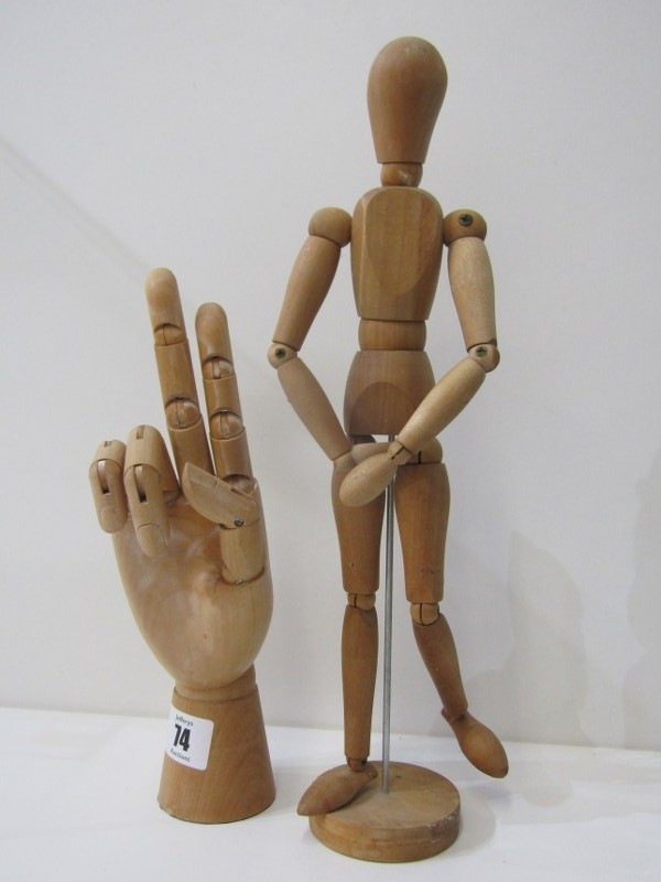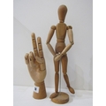 ARTIST MANNEQUIN, a jointed beech framed artist mannequin, 33cm height, together with a similar articulated hand 24cm height