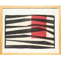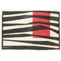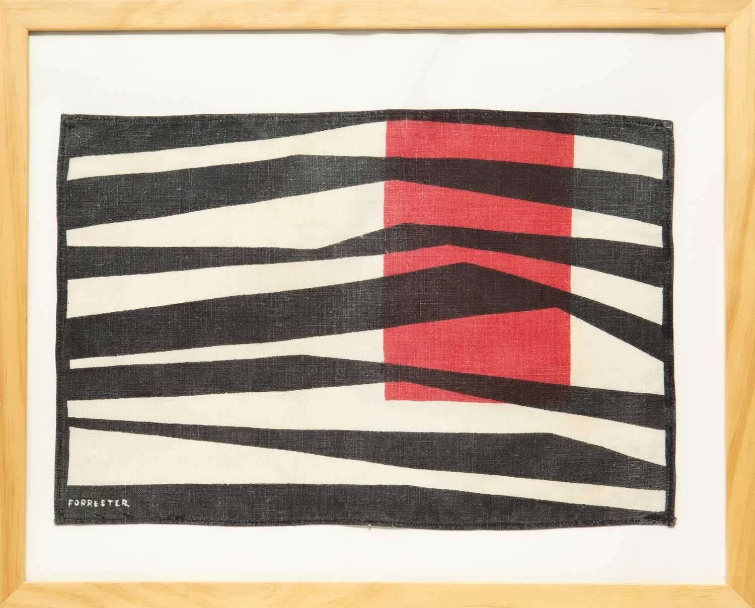 John FORRESTER (1922-2002) Untitled, Red and Black (Porthia Prints, 1955) Screenprint on fabric, signed, 29 x 43cm, 44 x 53cm framed. A silkscreen design to the set of six table-mats produced by Porthia Prints in 1955. which Dennis Mitchell organised with Stanley Dorfman. The other artists involved were Peter Lanyon, Robert Adams, Barbara Hepworth, Roger Hilton and Mitchell himself, and their payment simply amounted to two dozen mats each (five of the mats and designs for all six were shown in the Redfern Gallery's 'Design' exhibition in 1986, nos 97a-110). The mats were available either as sets or individually, as Dorfman reported to Heal's (see correspondence dated 1 February 1955, in Heal's archives) that some customers bought only one or two, perhaps regarding them more as 'objets d'art' than as regular table linen. The novelty of using screenprinting for a form of applied design which could be treated as a work of art in its own right, had already been tried in the late forties by Zika and Lida Ascher, Czech textile designers working in Britain. - British Museum.