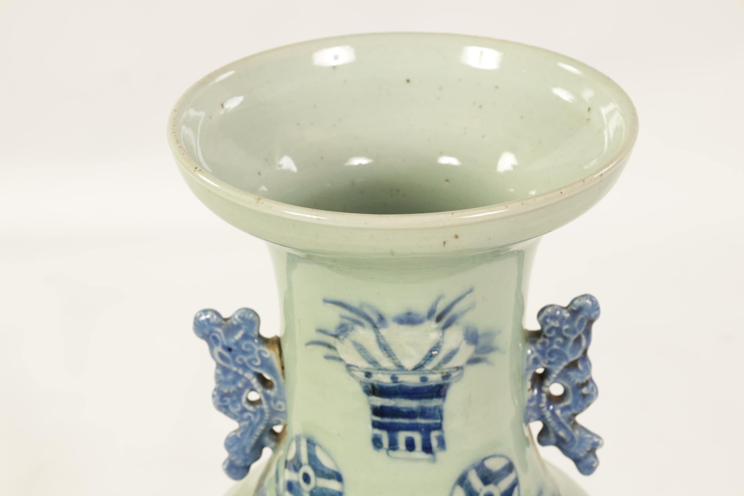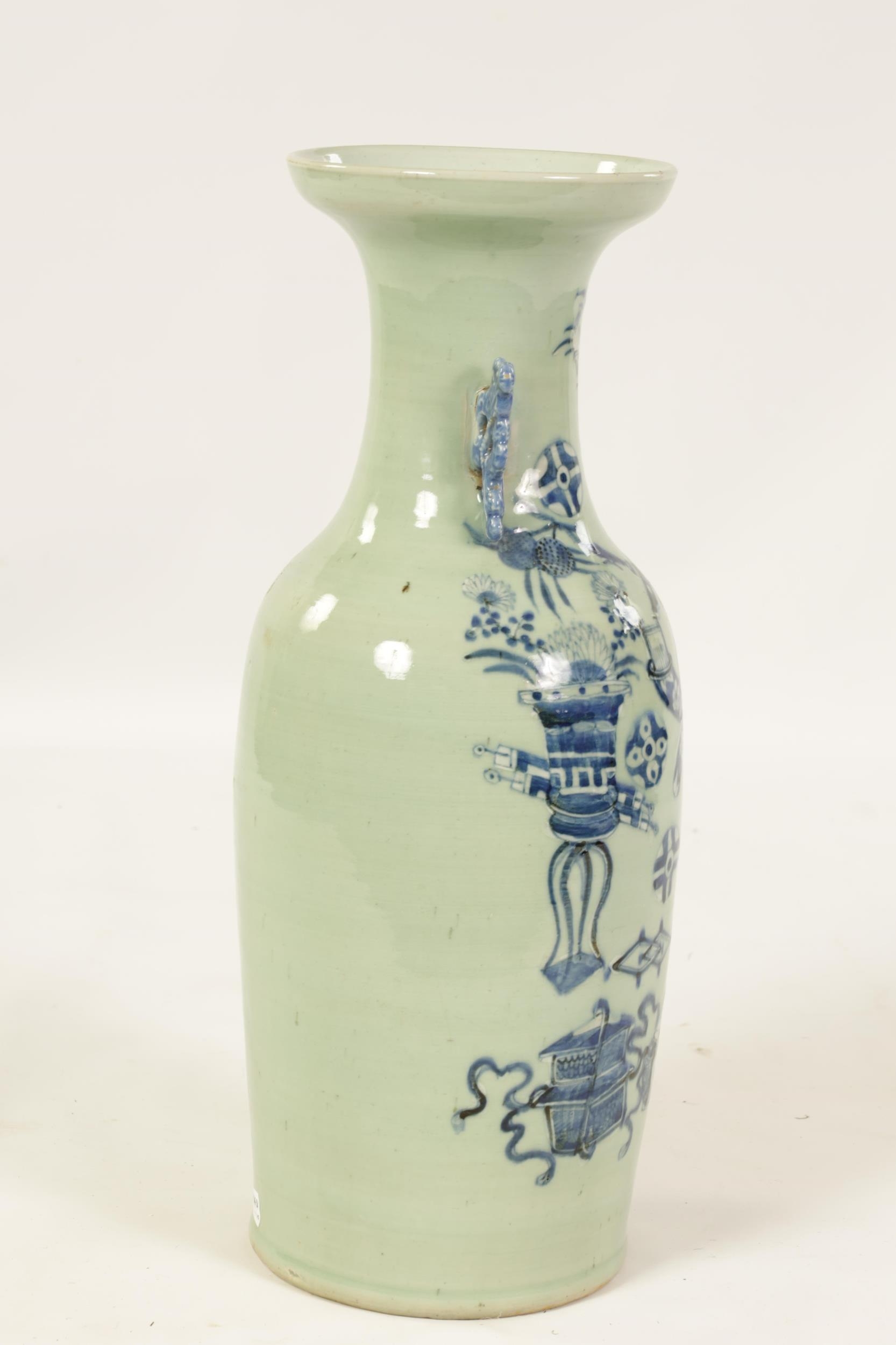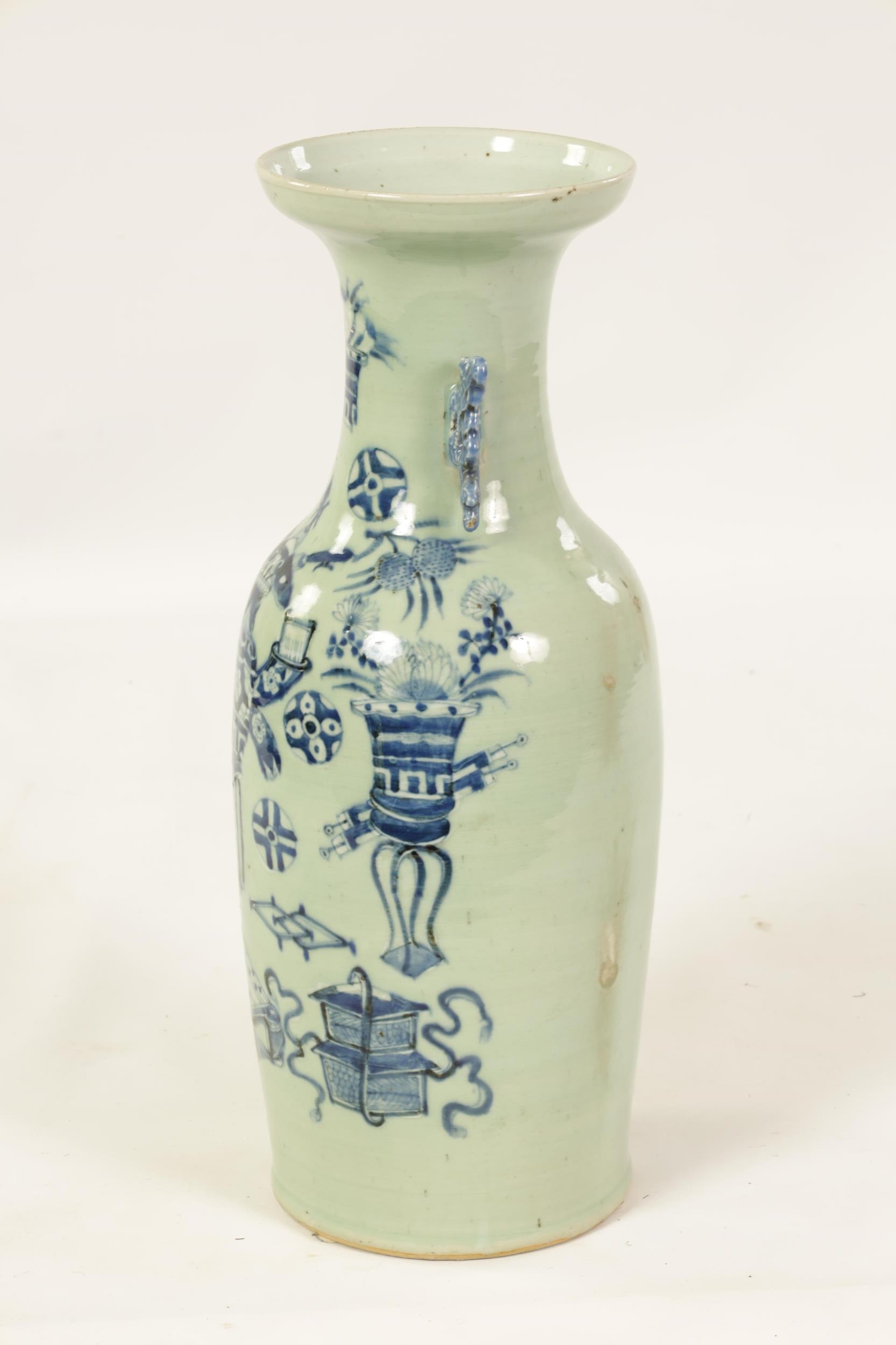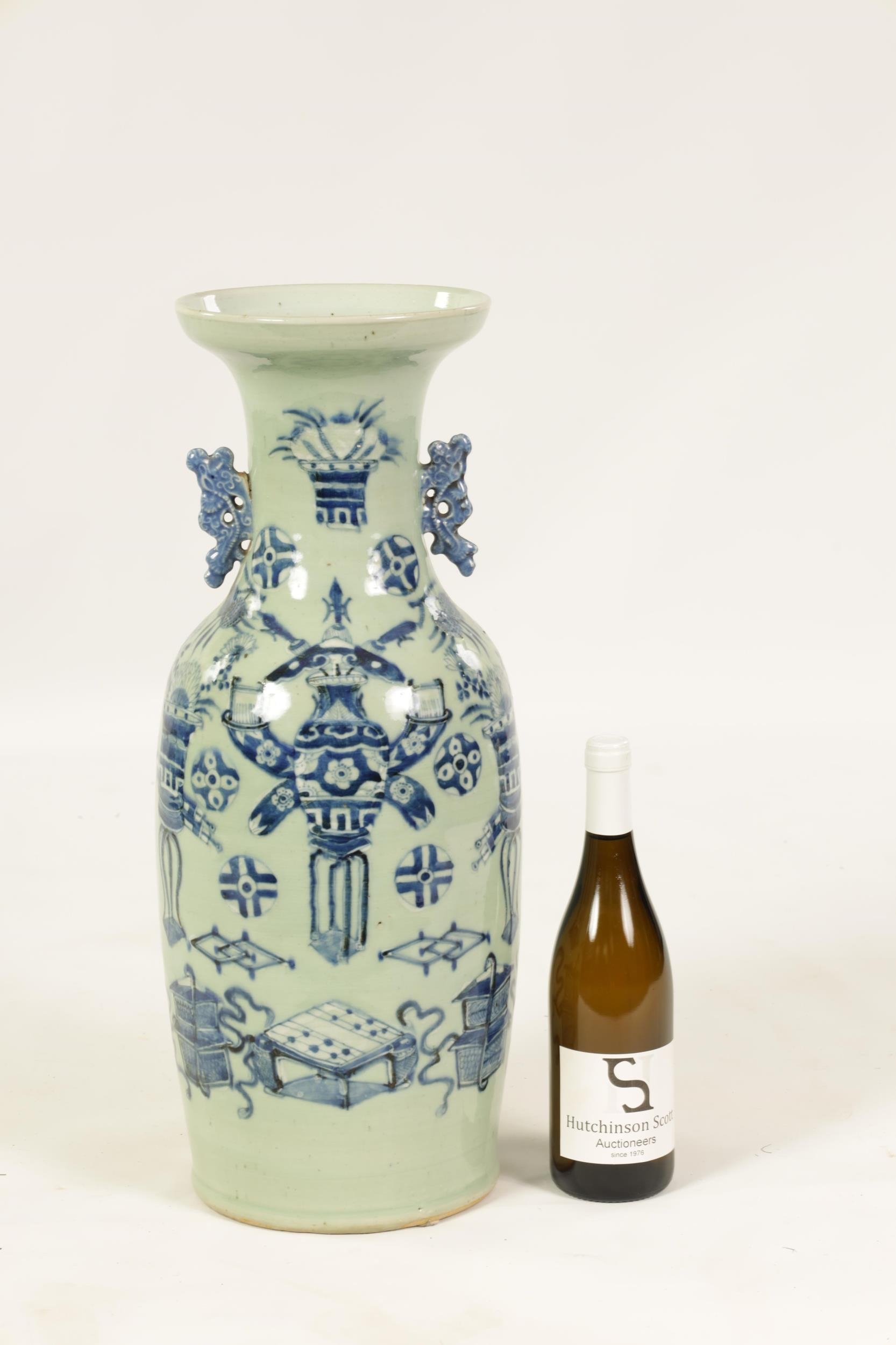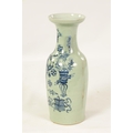 A LARGE 19TH CENTURY CHINESE CELADON GLAZE PORCELAIN VASE of tapering form with flared neck, decorated with blue and white scenes of antiquities (58cm high )