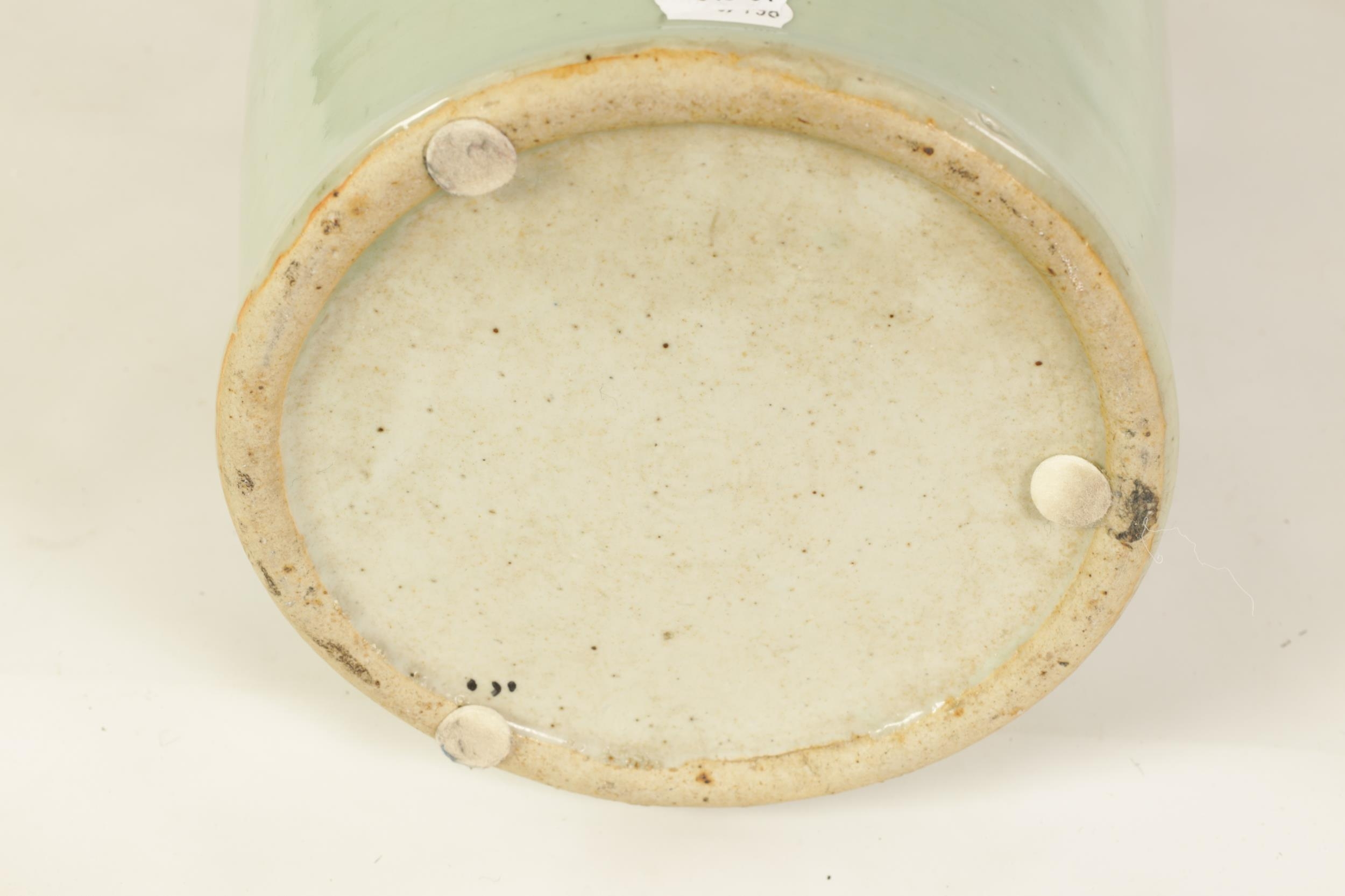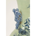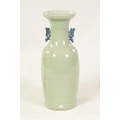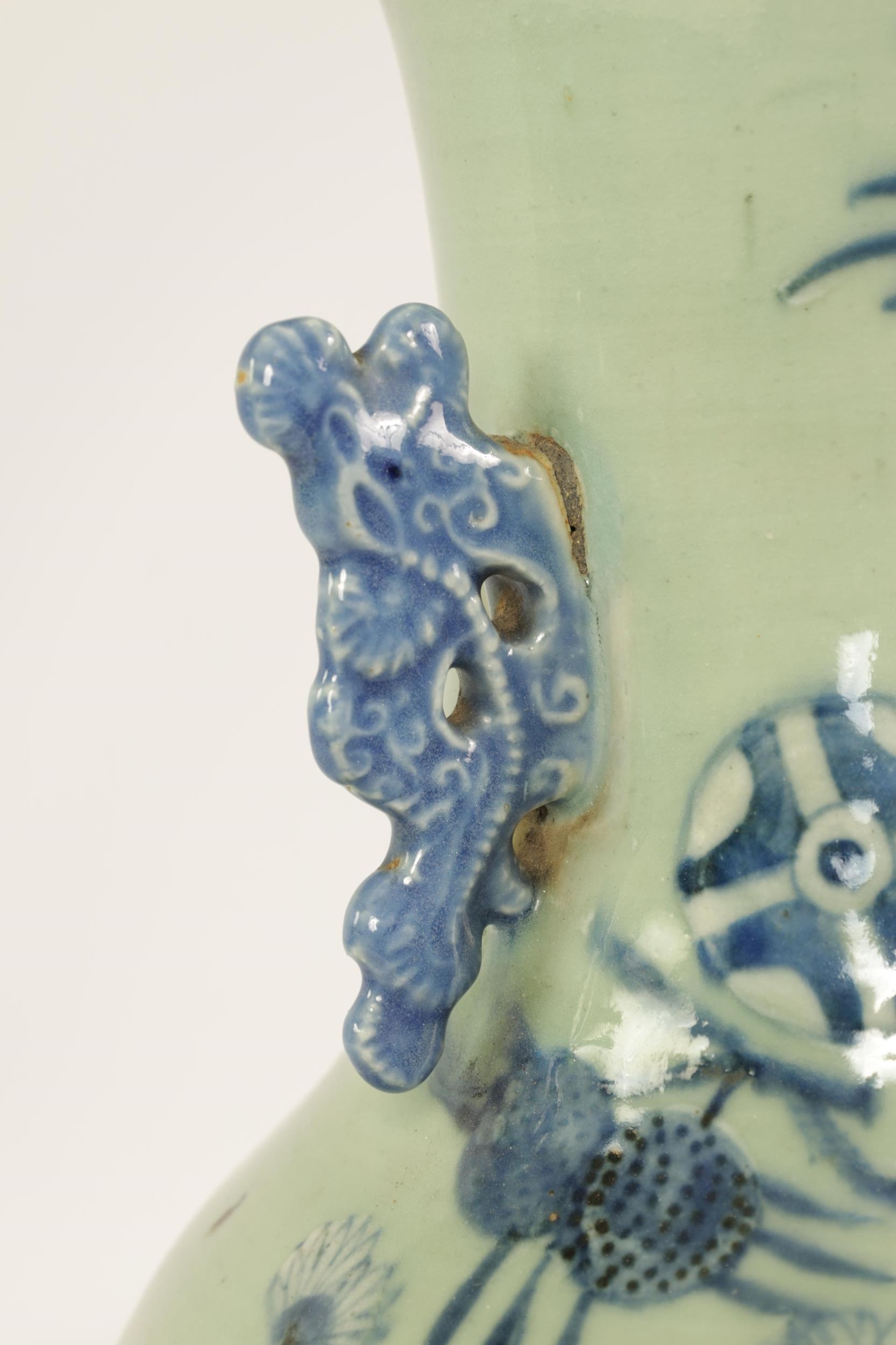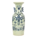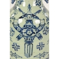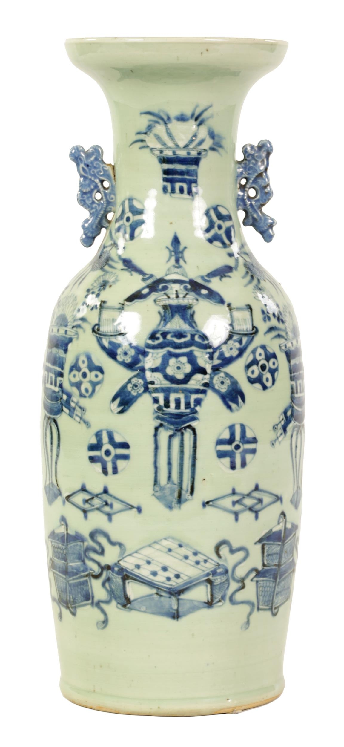 A LARGE 19TH CENTURY CHINESE CELADON GLAZE PORCELAIN VASE of tapering form with flared neck, decorated with blue and white scenes of antiquities (58cm high )