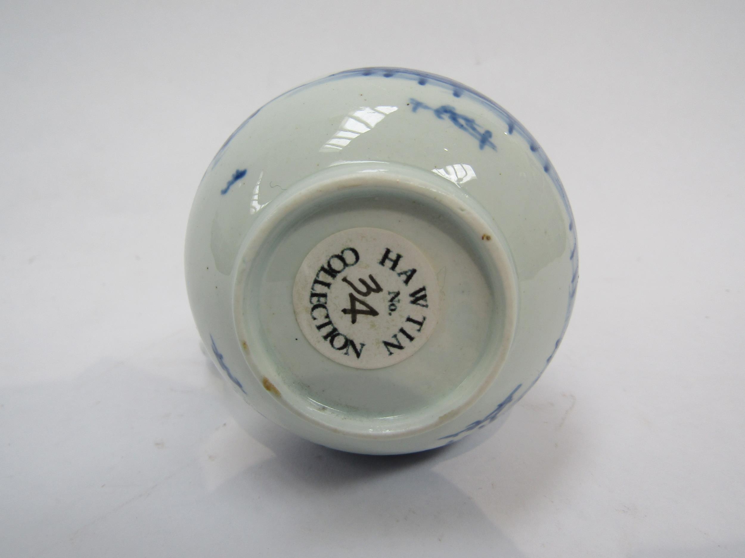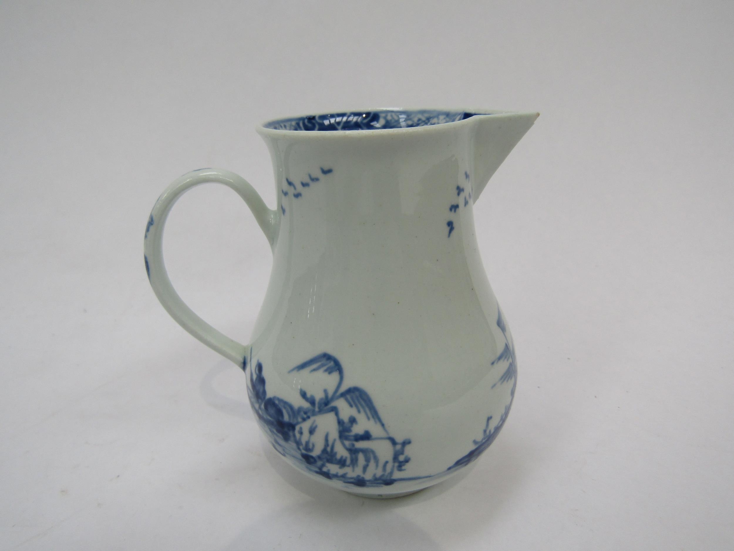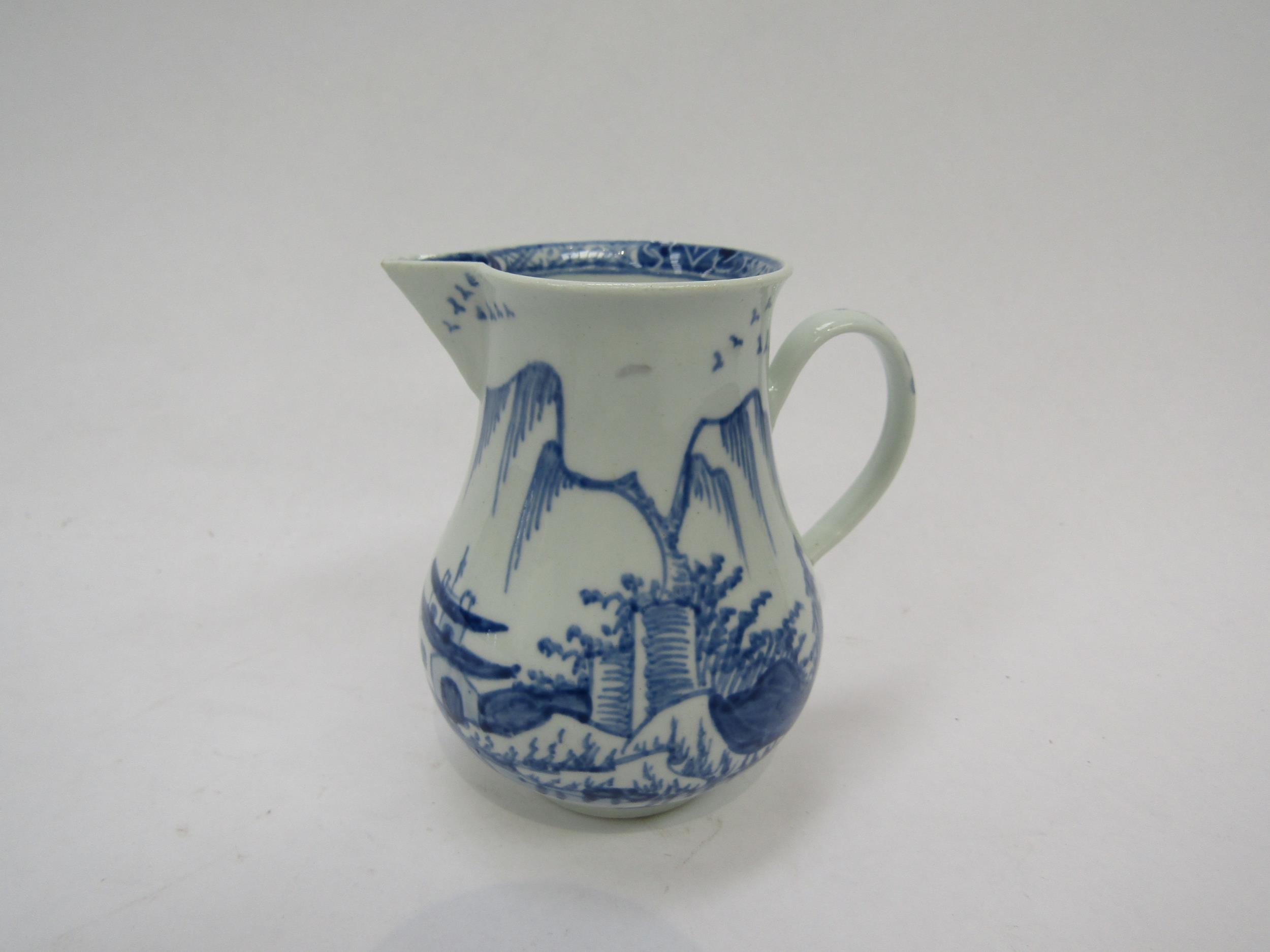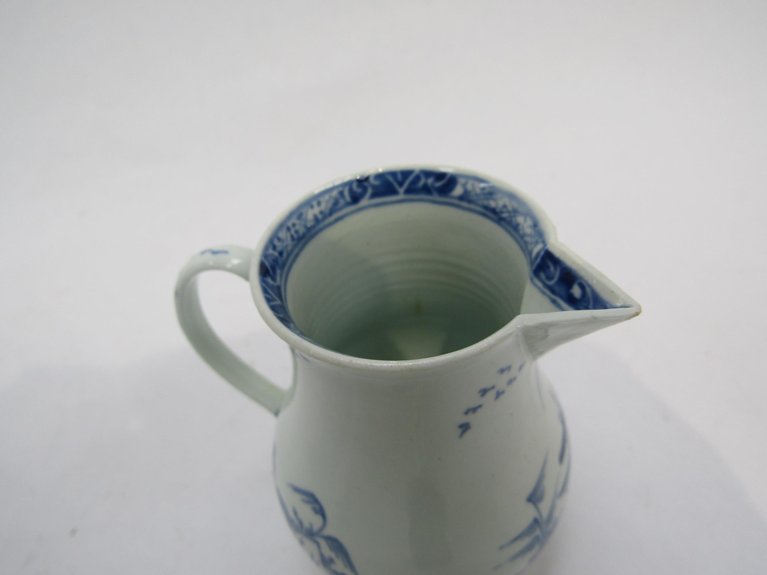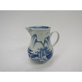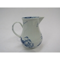 A Vauxhall cream jug c1755-1764 under glazed blue pagoda and willow trees on rocks fisherman in Sampan and birds/ducks. Hawtin Collection label to base, 8cm tall