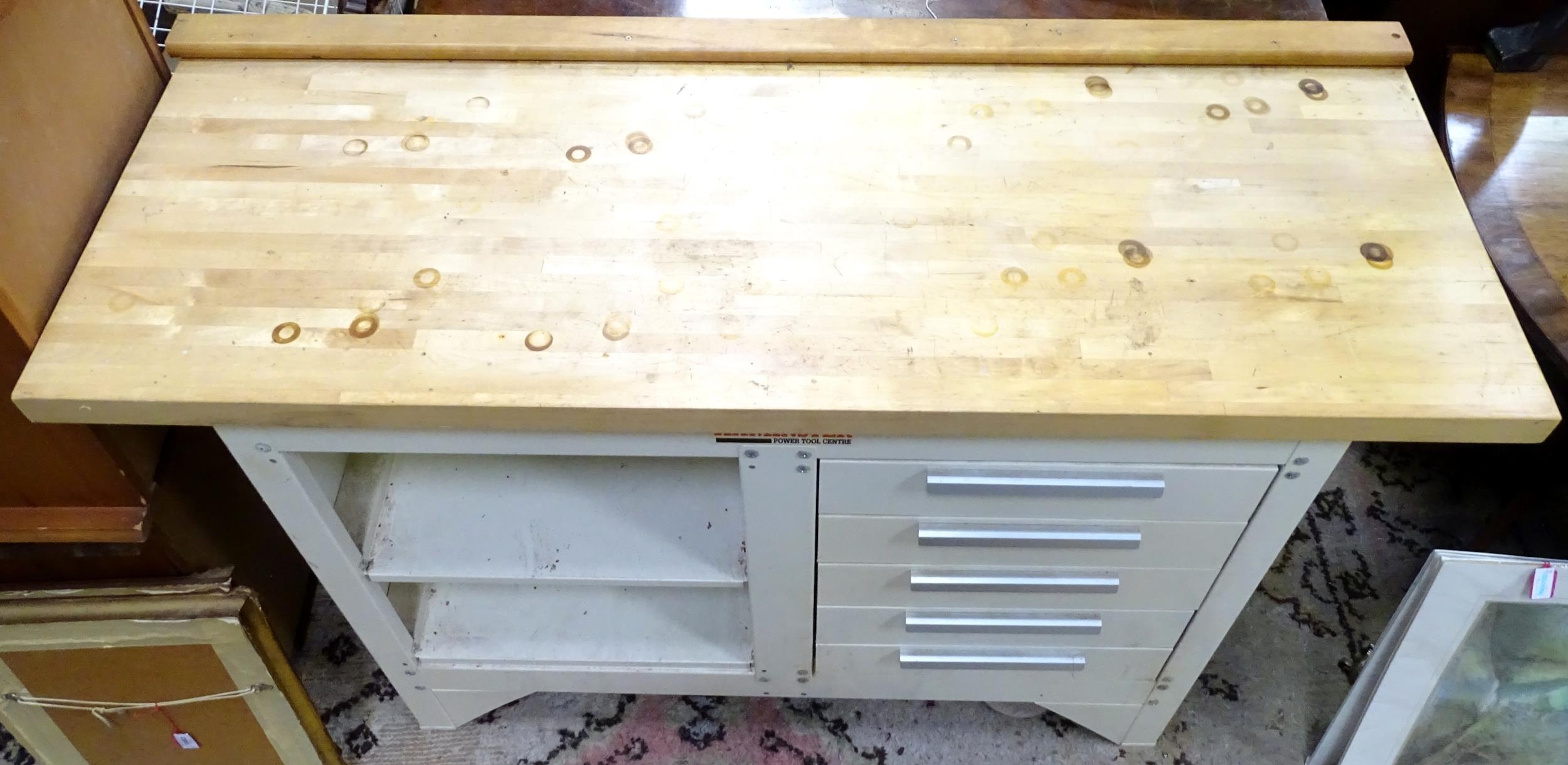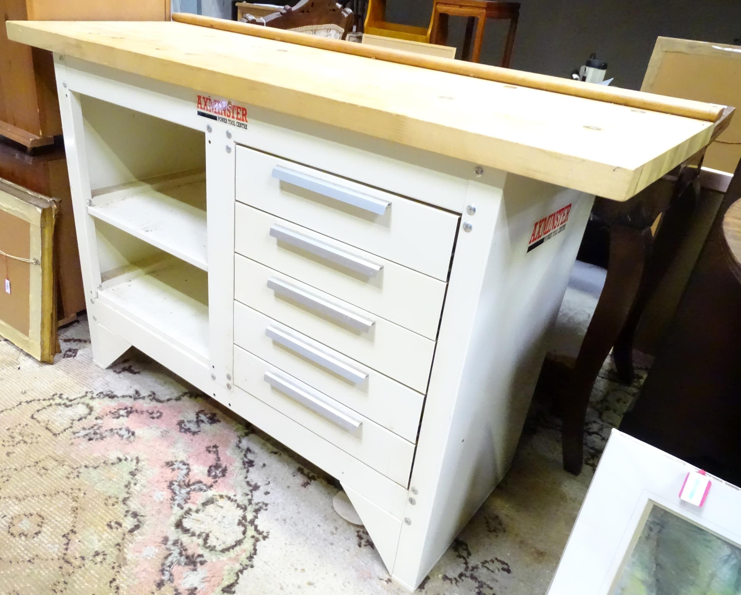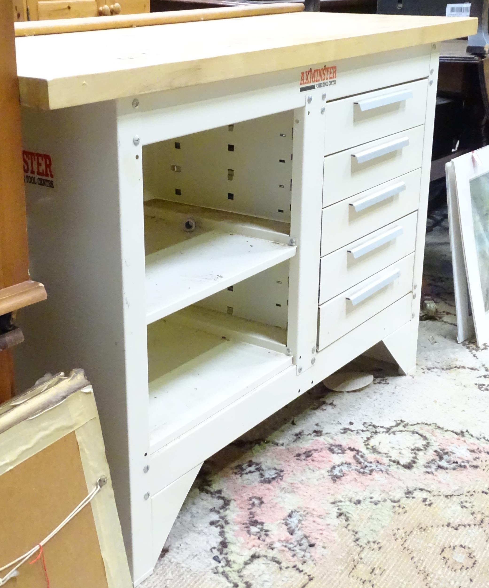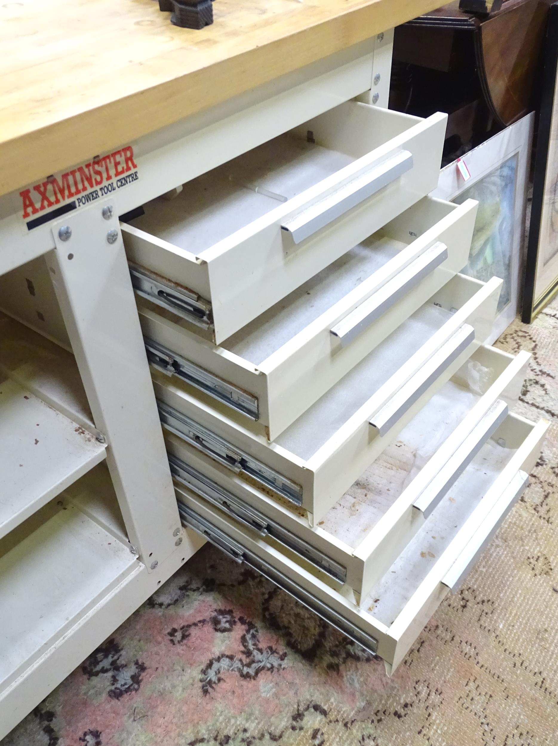 Workshop Tools : An Axminster workbench, the metal base with two shelves and five drawers, approx 54" wide, 22" deep, 33 1/2" tall