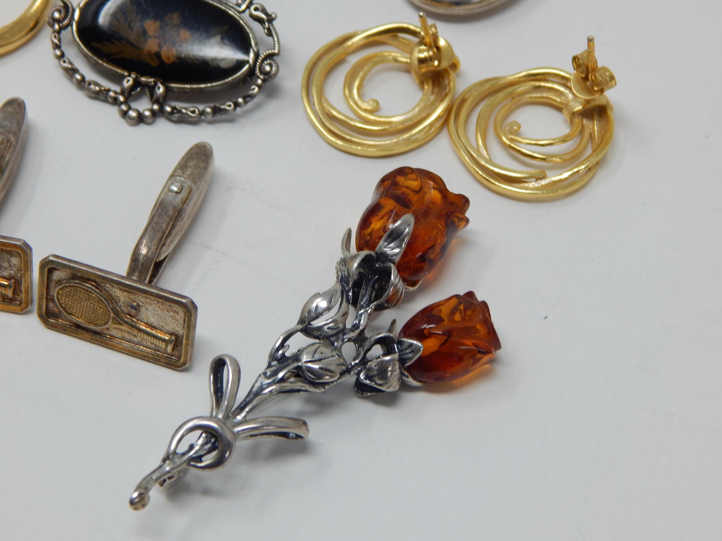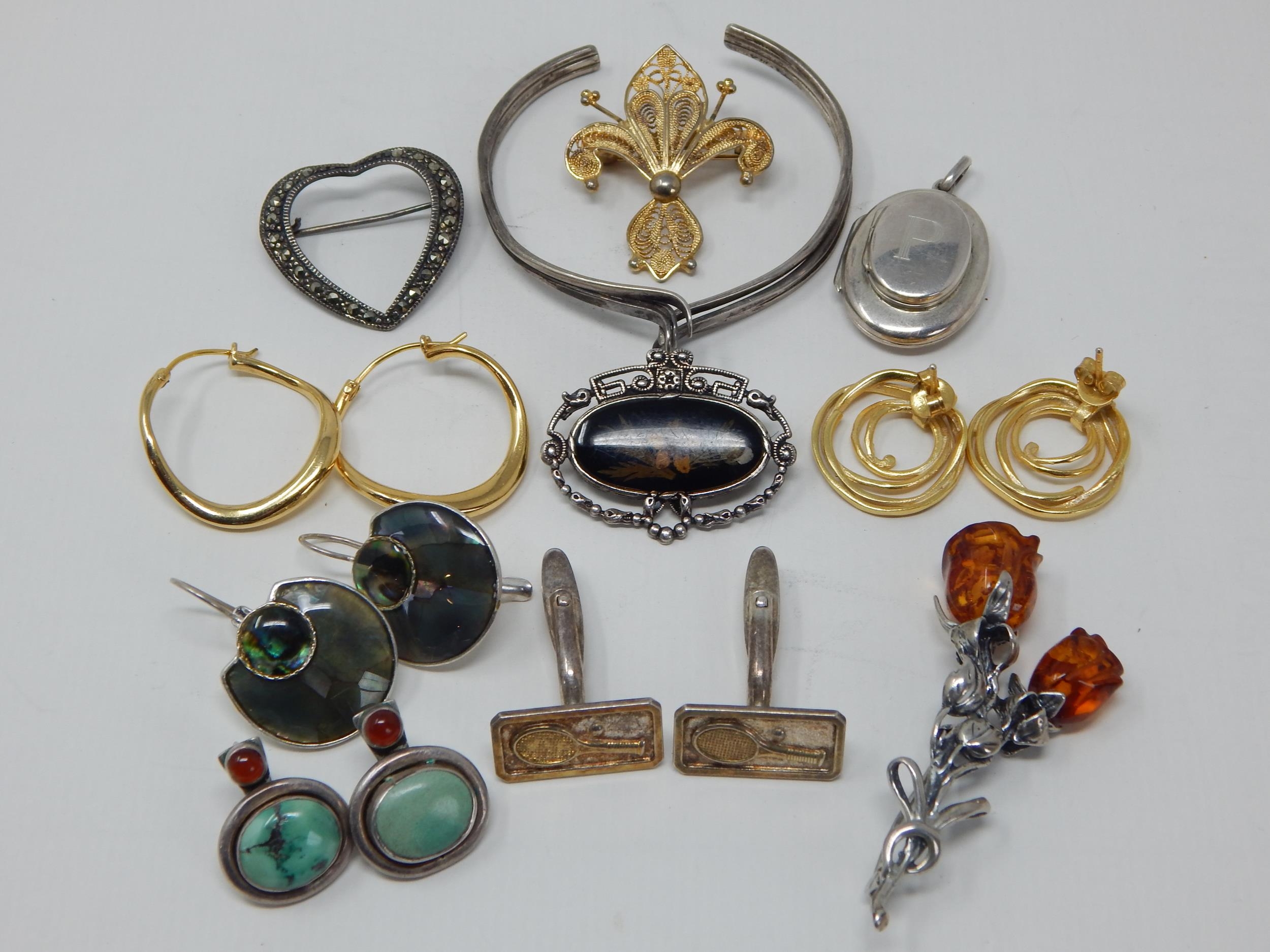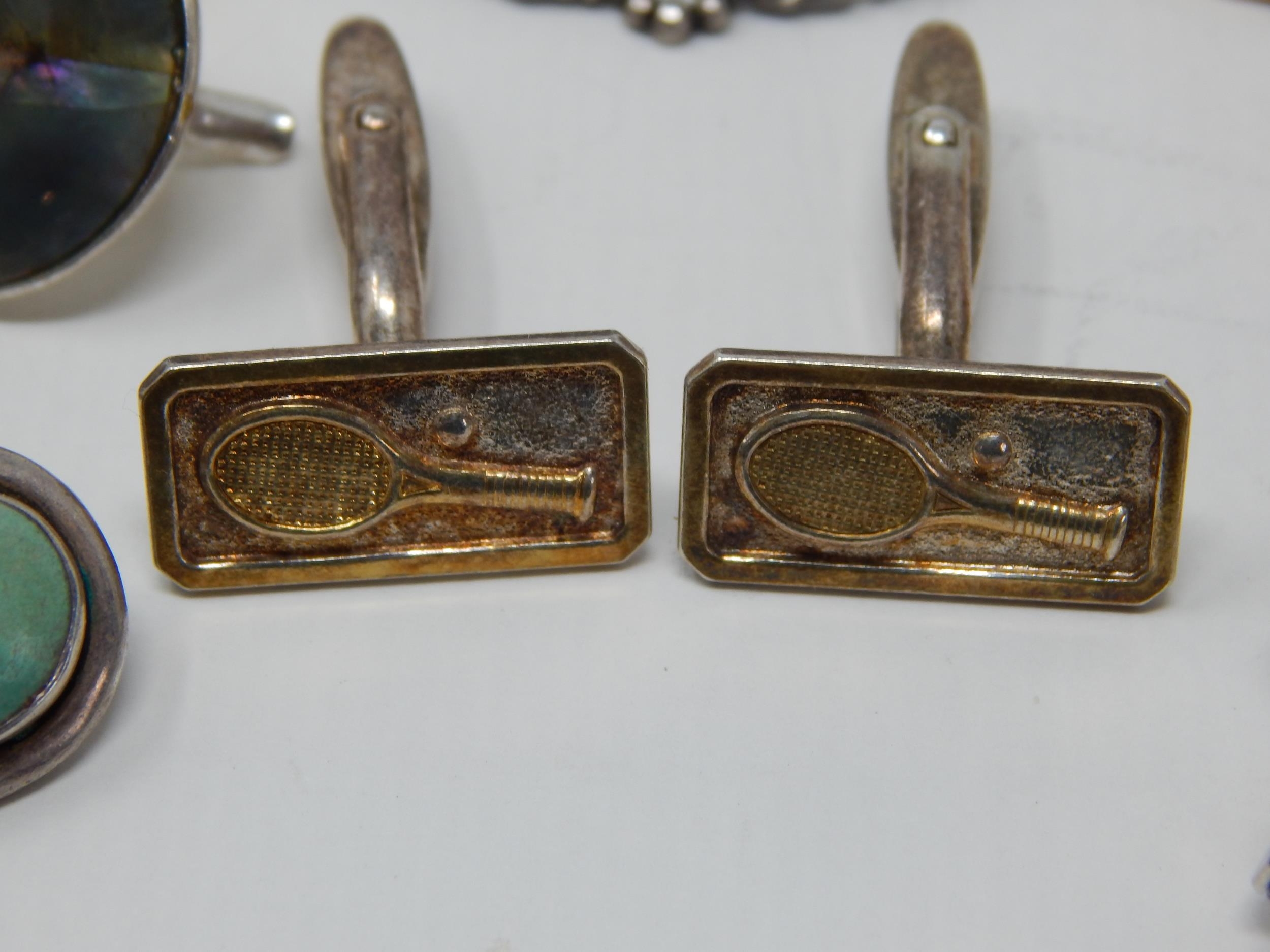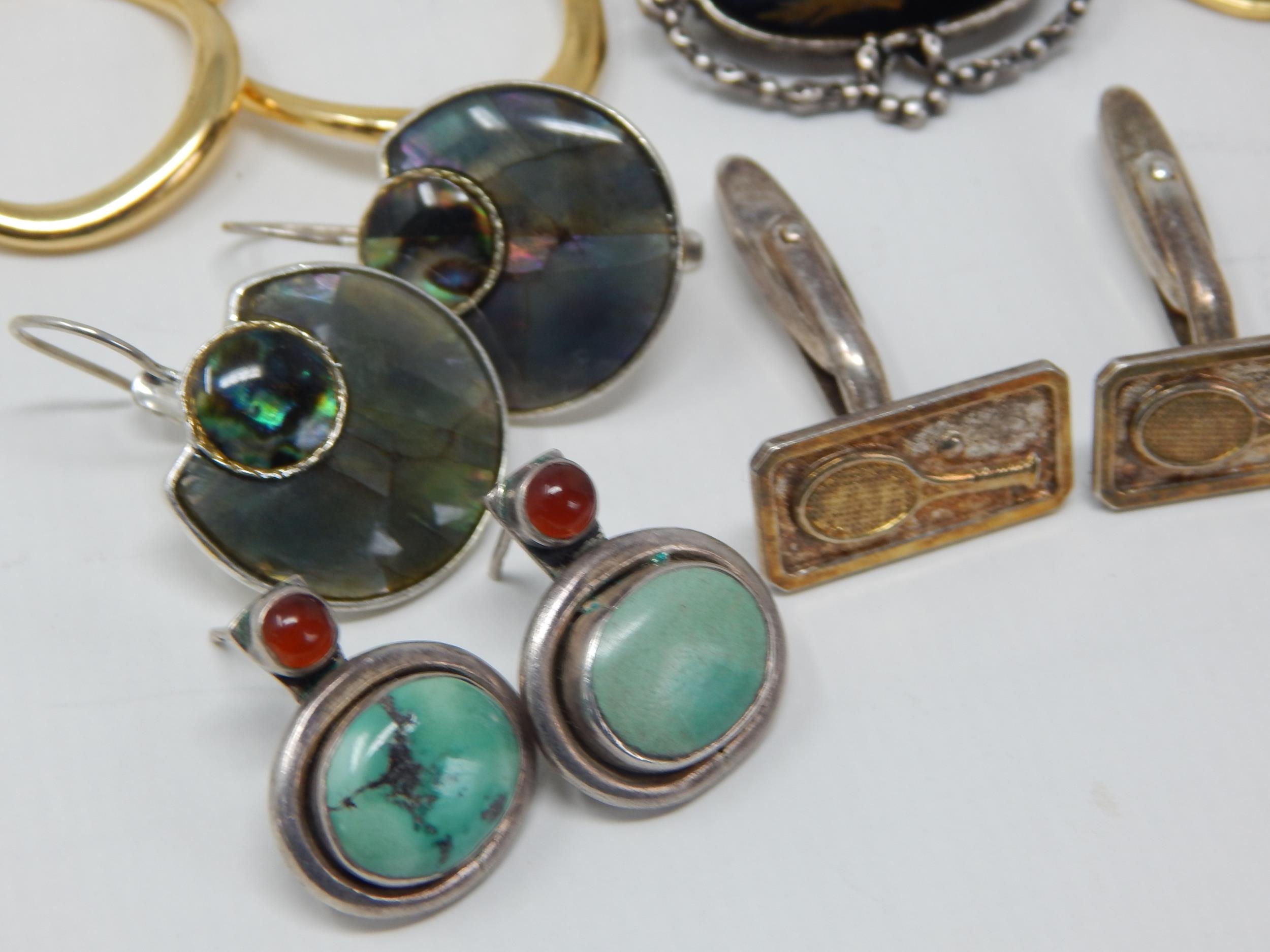 A Quantity of Silver Jewellery to Include a Pair of Tennis Related Cufflinks, Brooches, Earrings, Locket & Bangle.
