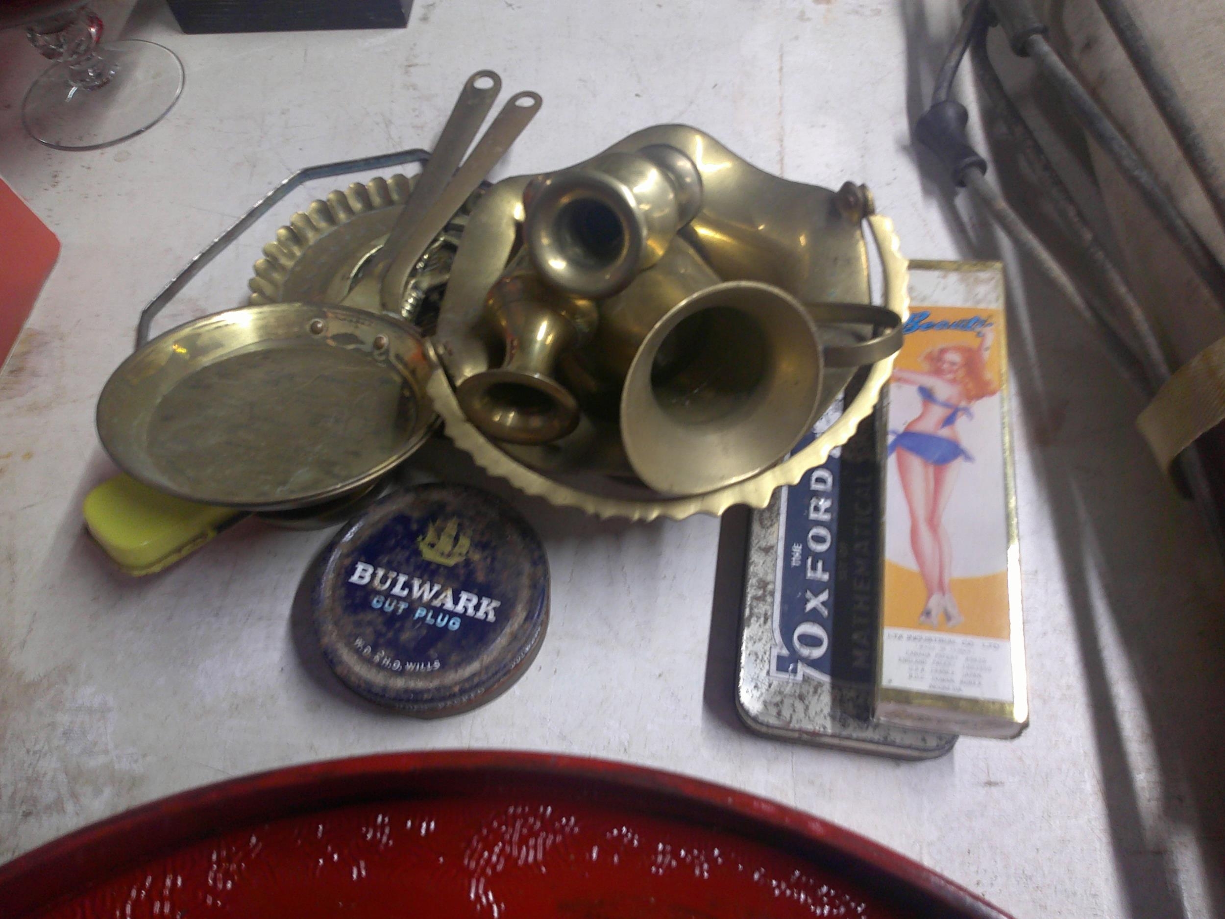 Brassware & two small vintage tin boxes