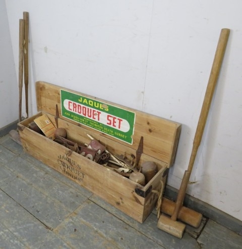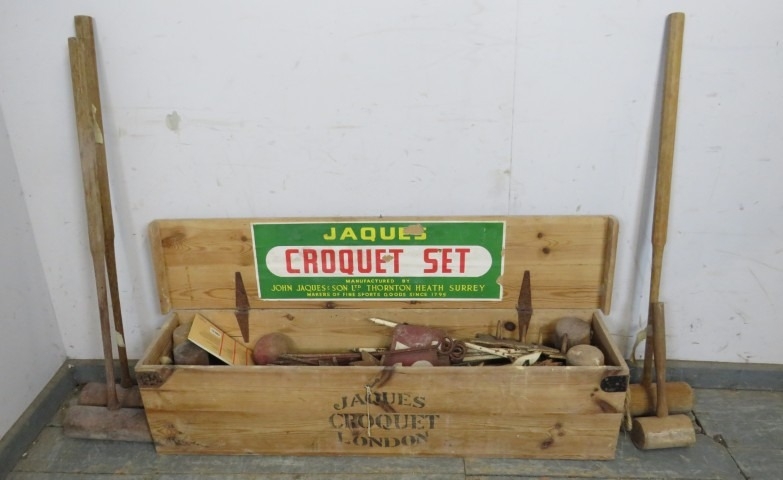 A fine Jacques croquet set, complete with seven mallets, hoops, flags, pointers etc. The box stamped Jacques and label to lid. H27cm x W110cm x D24cm approx.