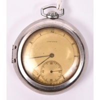 A Recta pocket watch, 1930s, with silvered dial, black numerals, and seconds dial, numbered inside the case 362809, the back of the case bearing large SA eagle above the flukes of an anchor which are inscribed “1936 MARINE SA SACHSEN”. GWO&C (the dial tarnished and some numerals worn). £50-80