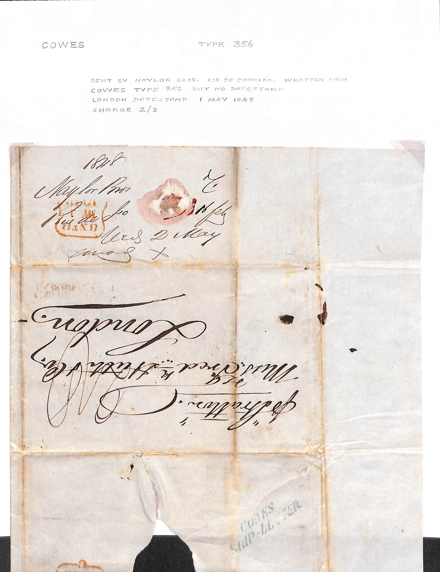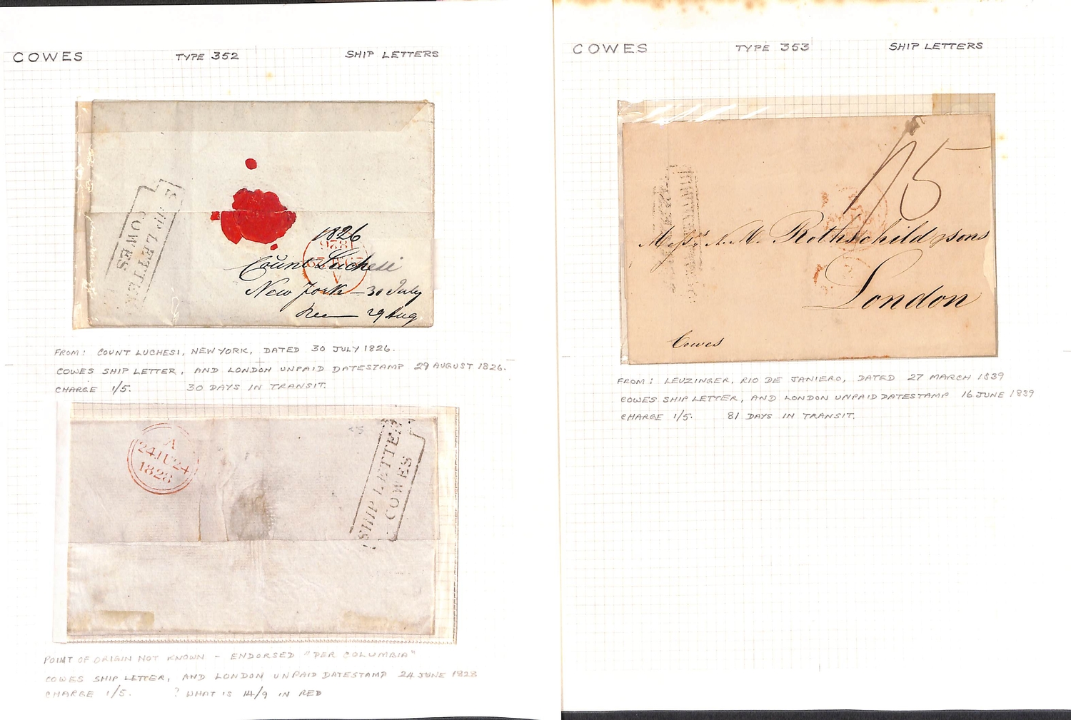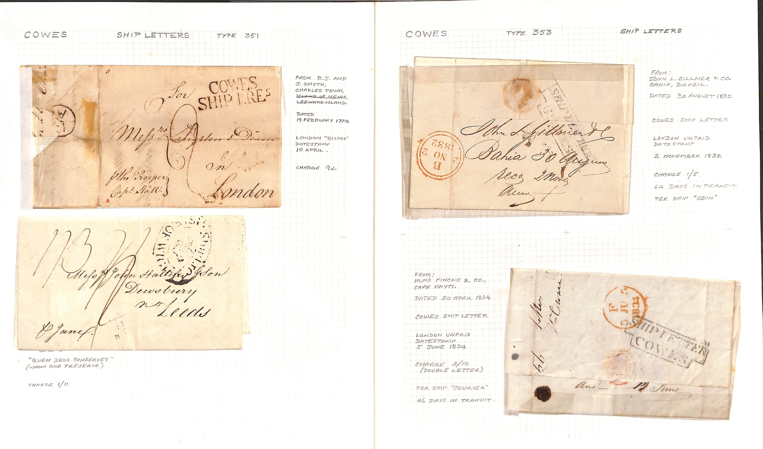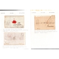 Cowes/Isle of Wight. 1770-1848 Entire letters (4), entires (3) and a part entire, seven with Cowes Ship Letter handstamps comprising types S1, S2 (2), S3 (3) or S6 in blue, also an 1825 entire letter from Singapore with boxed "SHIP LETTER / ISLE OF WIGHT" (Tabeart S2, not recorded by Robertson). (8).