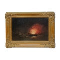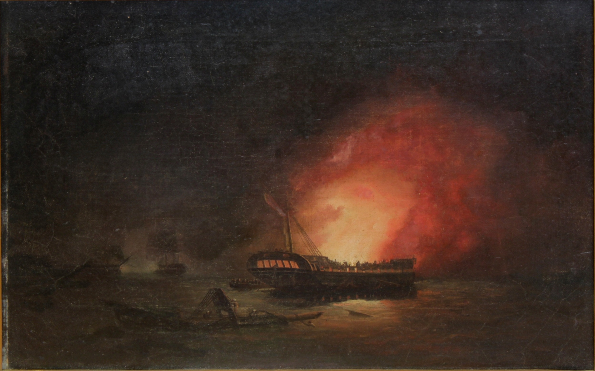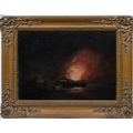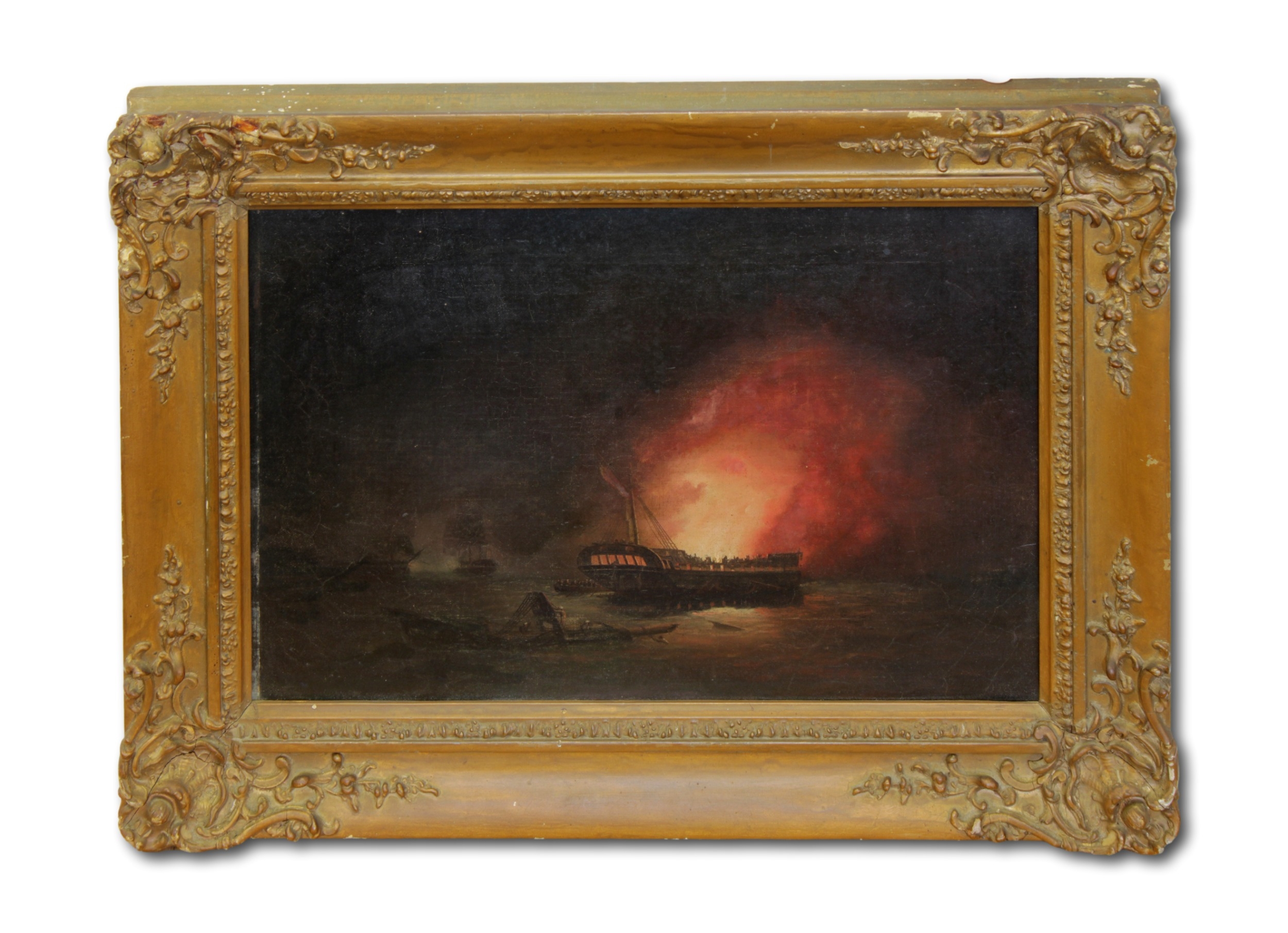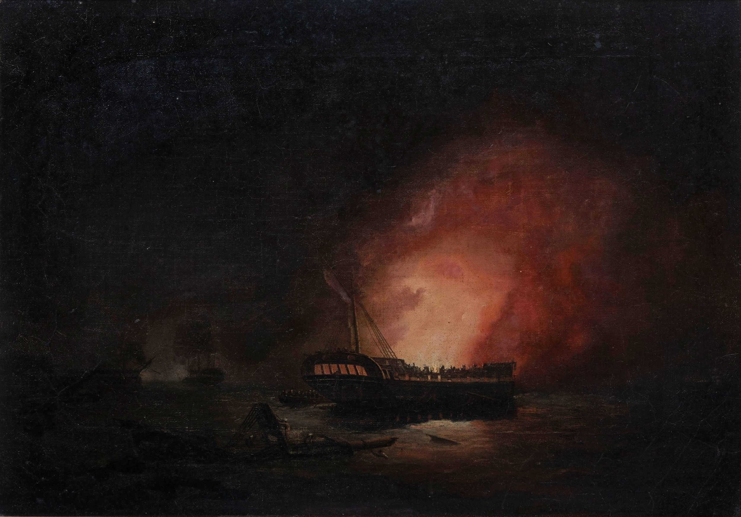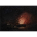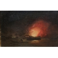 Attributed to Thomas Butterworth (British, 1768-1828), Burning the hulkoil on canvas, unsigned, 19th century swept frame, later gold painted27.3 x 39.4cm.
