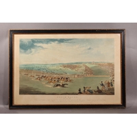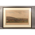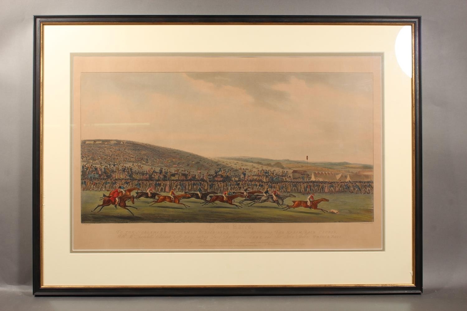 THOMAS SUTHERLAND after HENRY THOMAS ALKEN (British 1785-1851), Epsom Races with Mr Thornhill's Chestnut Colt Sam beating Lord Darlington's Grey and Sit John Shelly's Prince Paul for the Derby Stakes May 28th 1818, horse racing themed coloured print, published by Fuller 1819, image 31cm x 61cm, modern Hogarth style frame 58cm x 81cm.