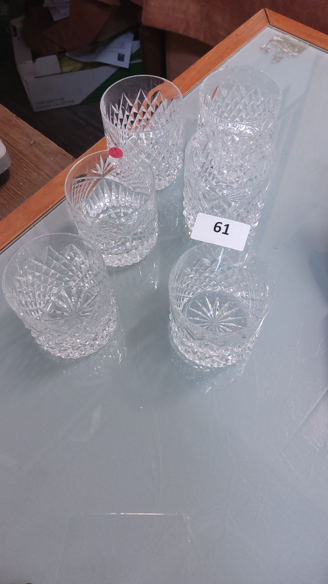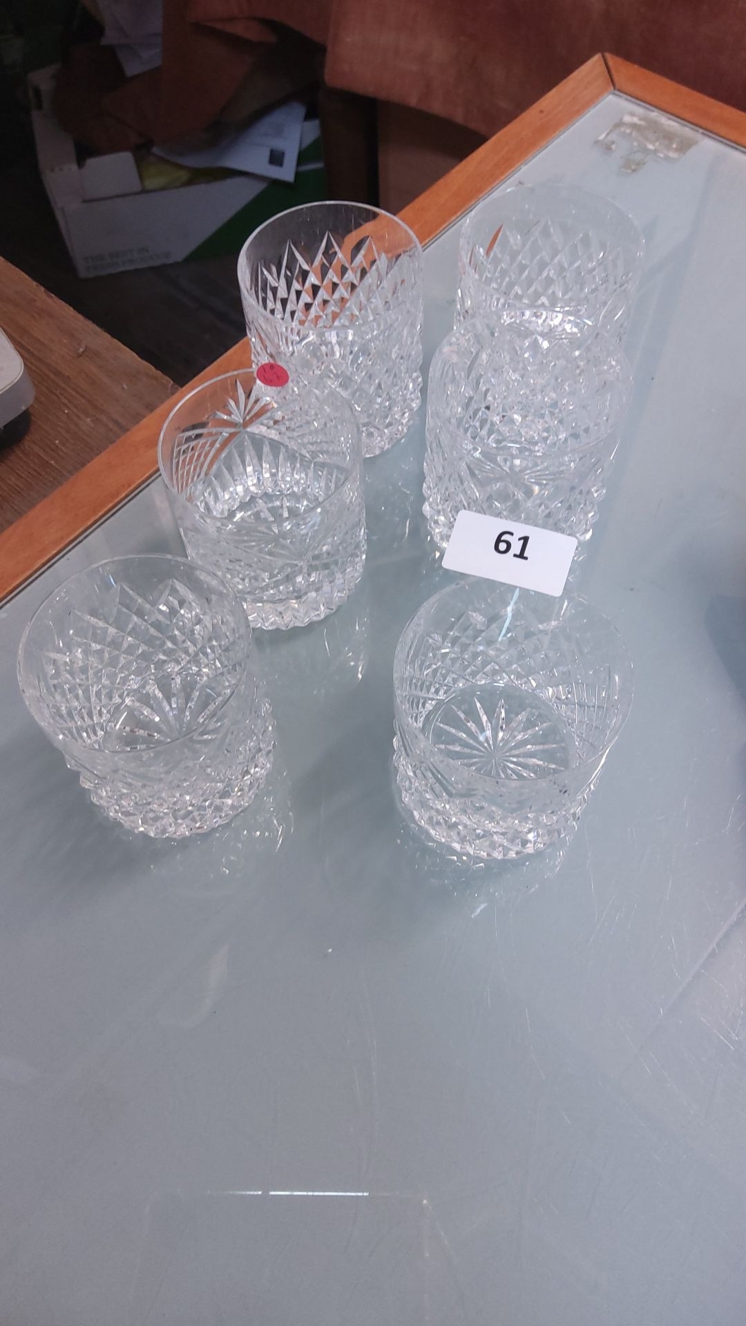 Set of six cut crystal whiskey tumblers, featuring intricate starburst patterns