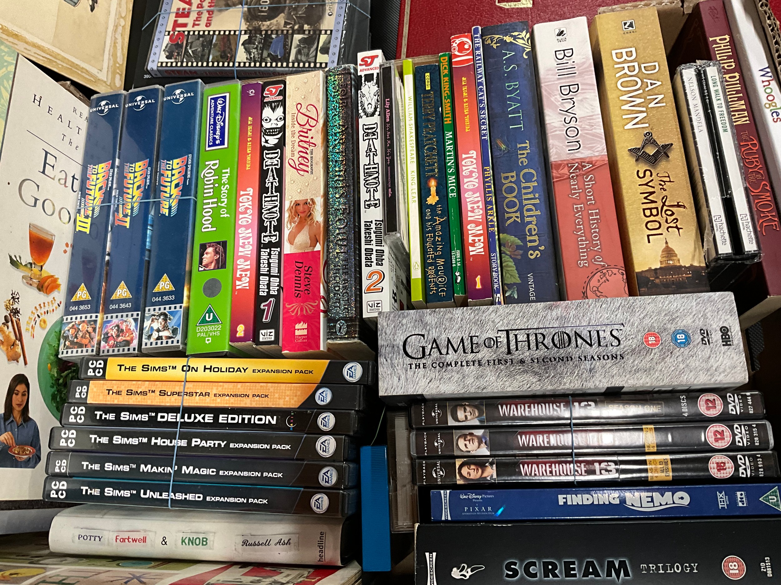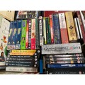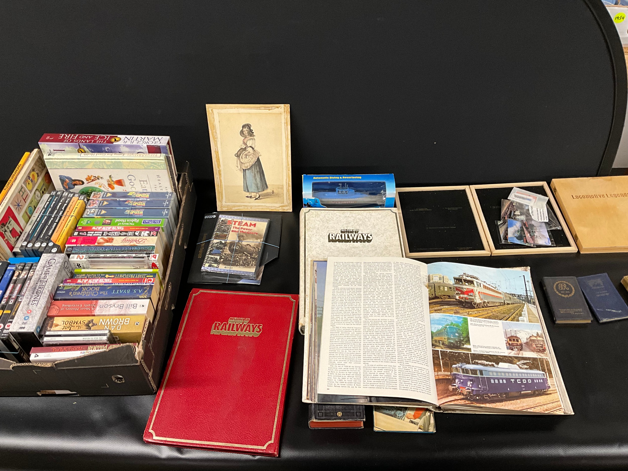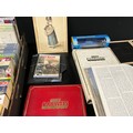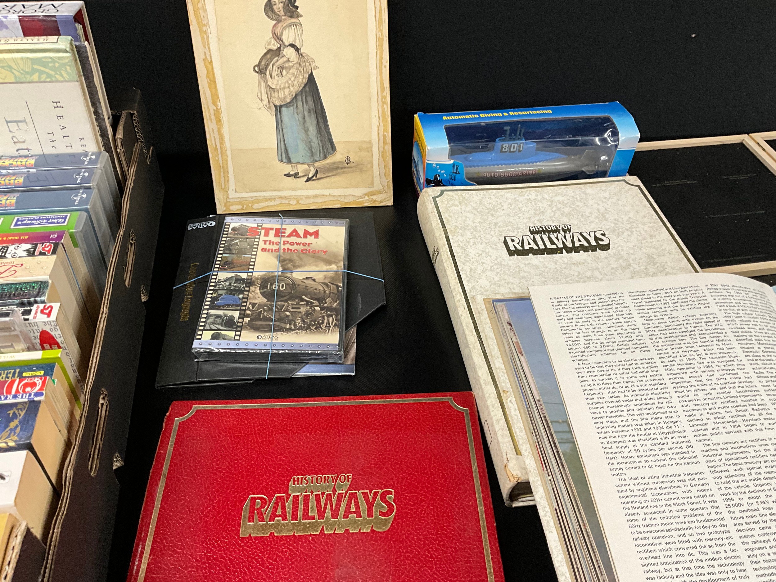 BOX AND CRATE OF BOOKS DVDS HOLY BIBLE ETC