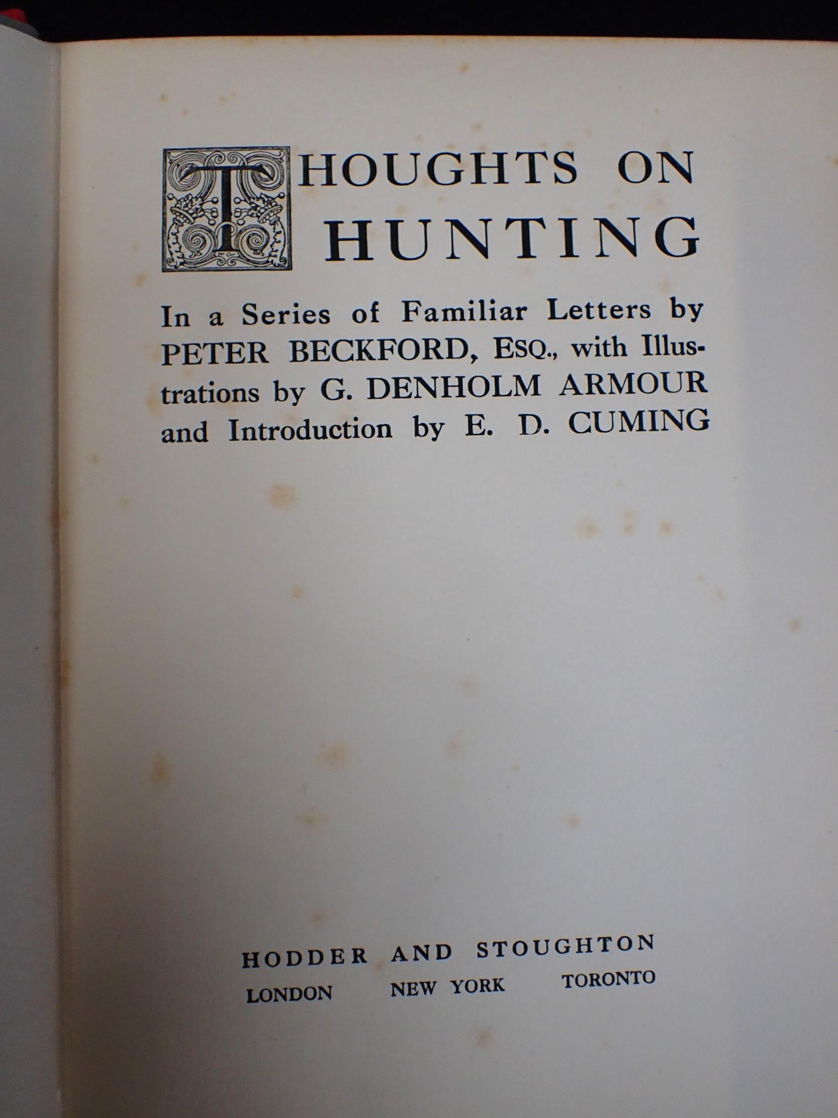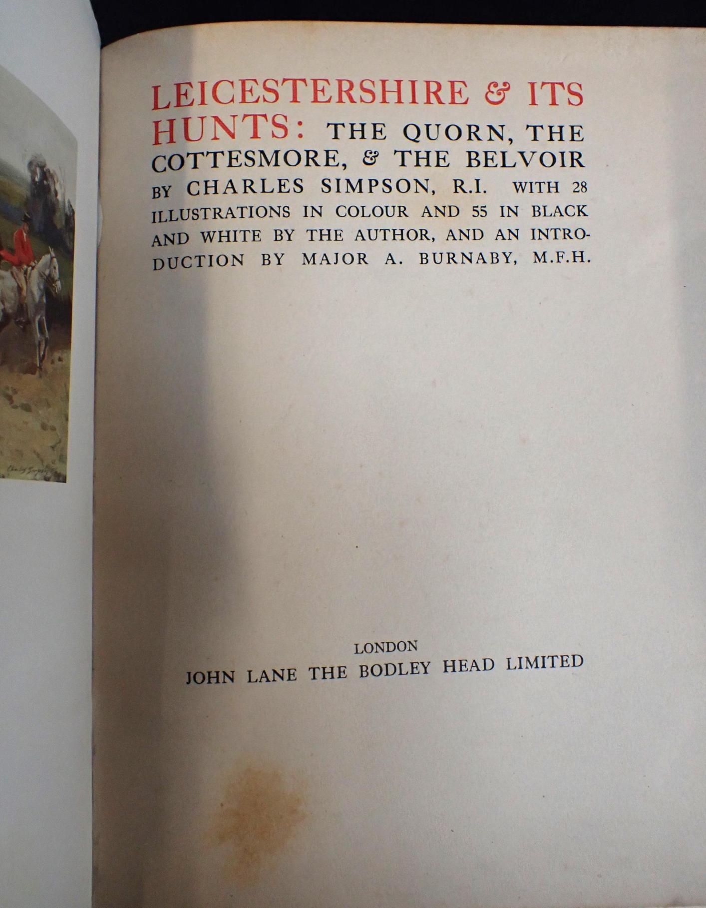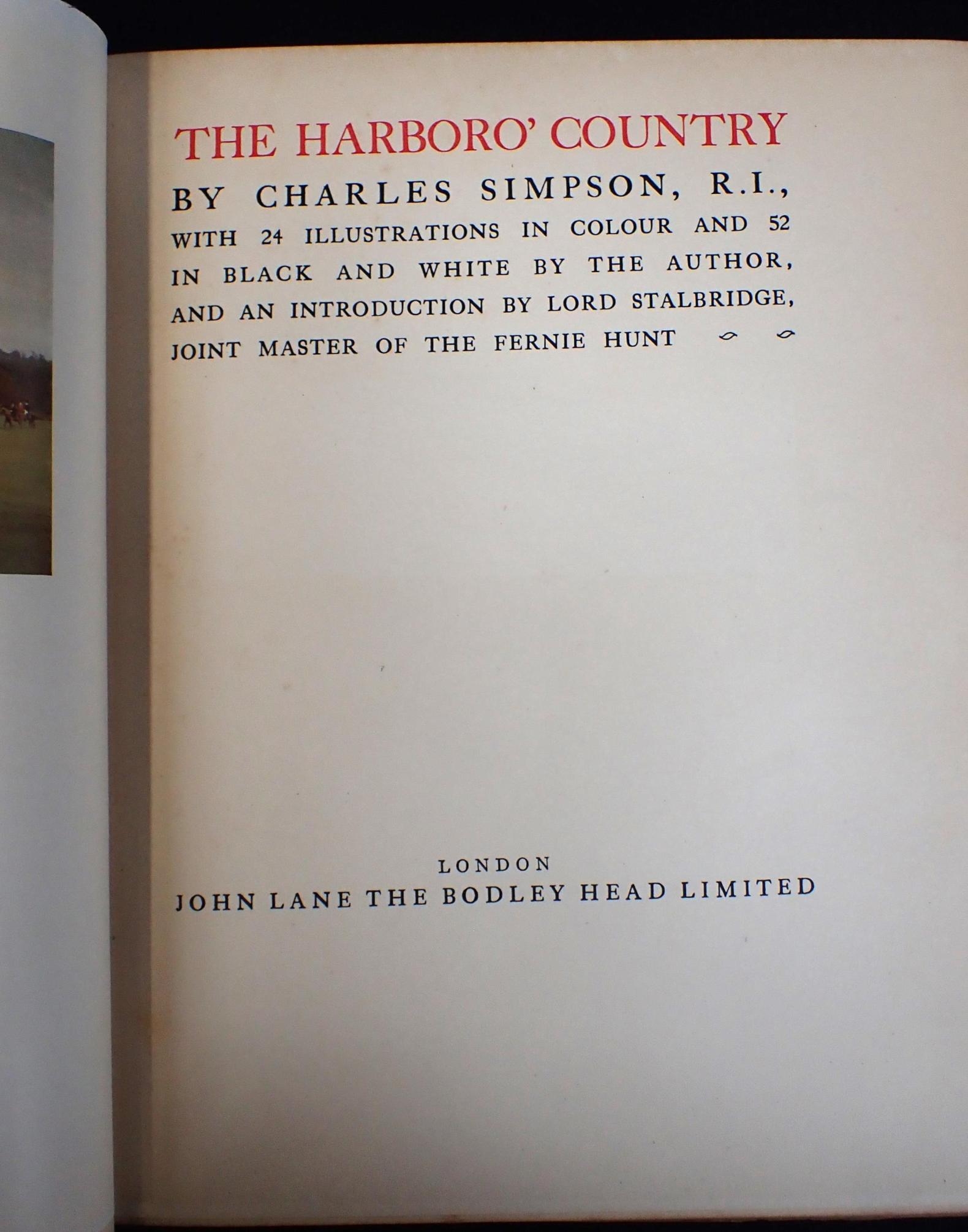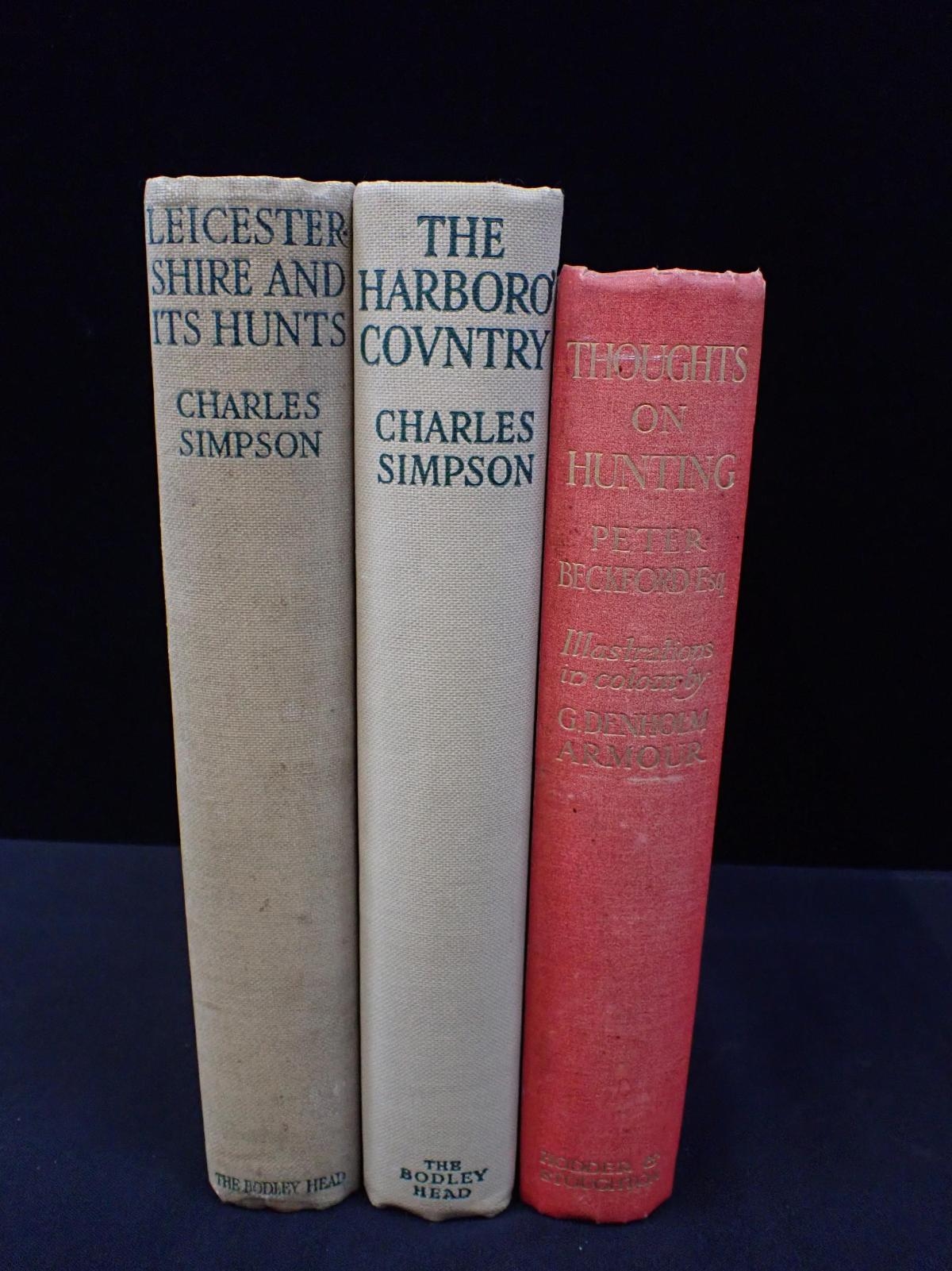 CHARLES SIMPSON: THE HARBORO' COUNTRY and CHARLES SIMPSON: LEICESTERSHIRE AND ITS HUNTS both 1st editions, 1926 and 1927, with Peter Beckford, Thoughts on Hunting, with illustrations by G Denholm Armour