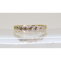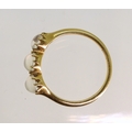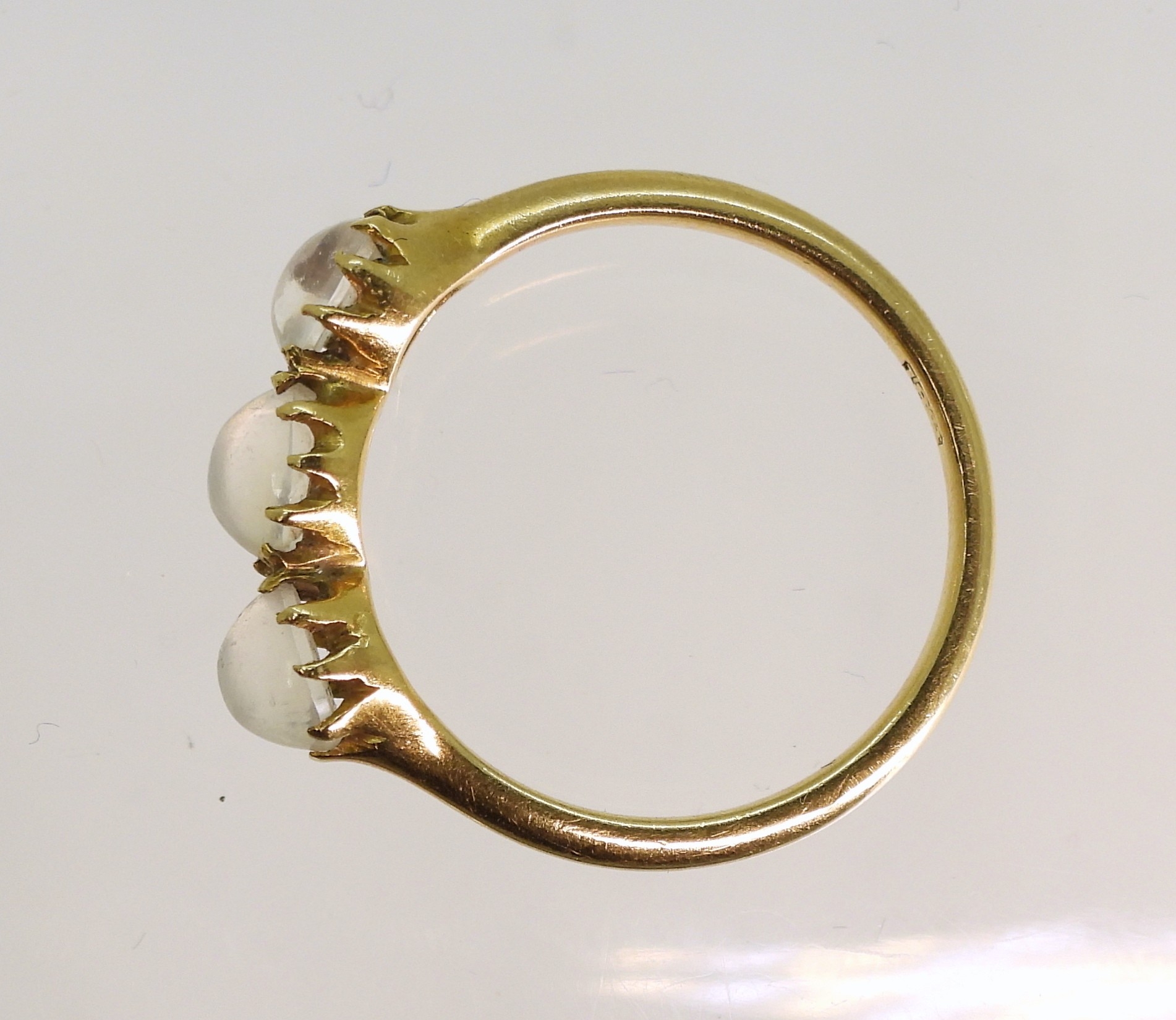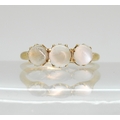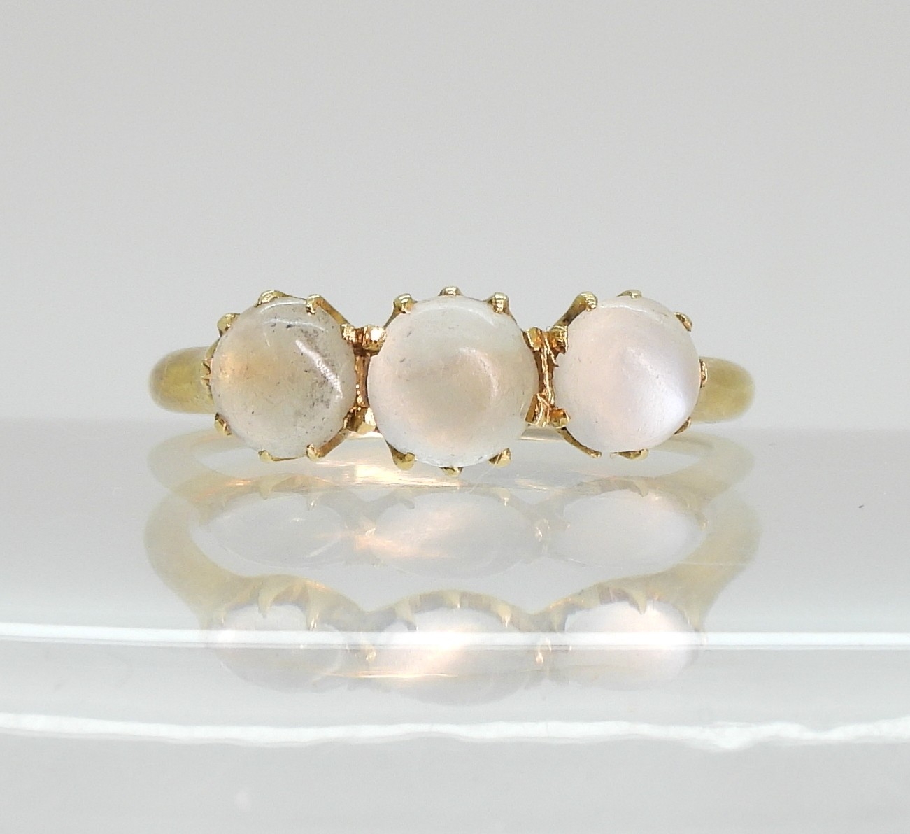 An 18ct ring set with three moonstones in multi claw settings, size M1/2, weight 2.7gms