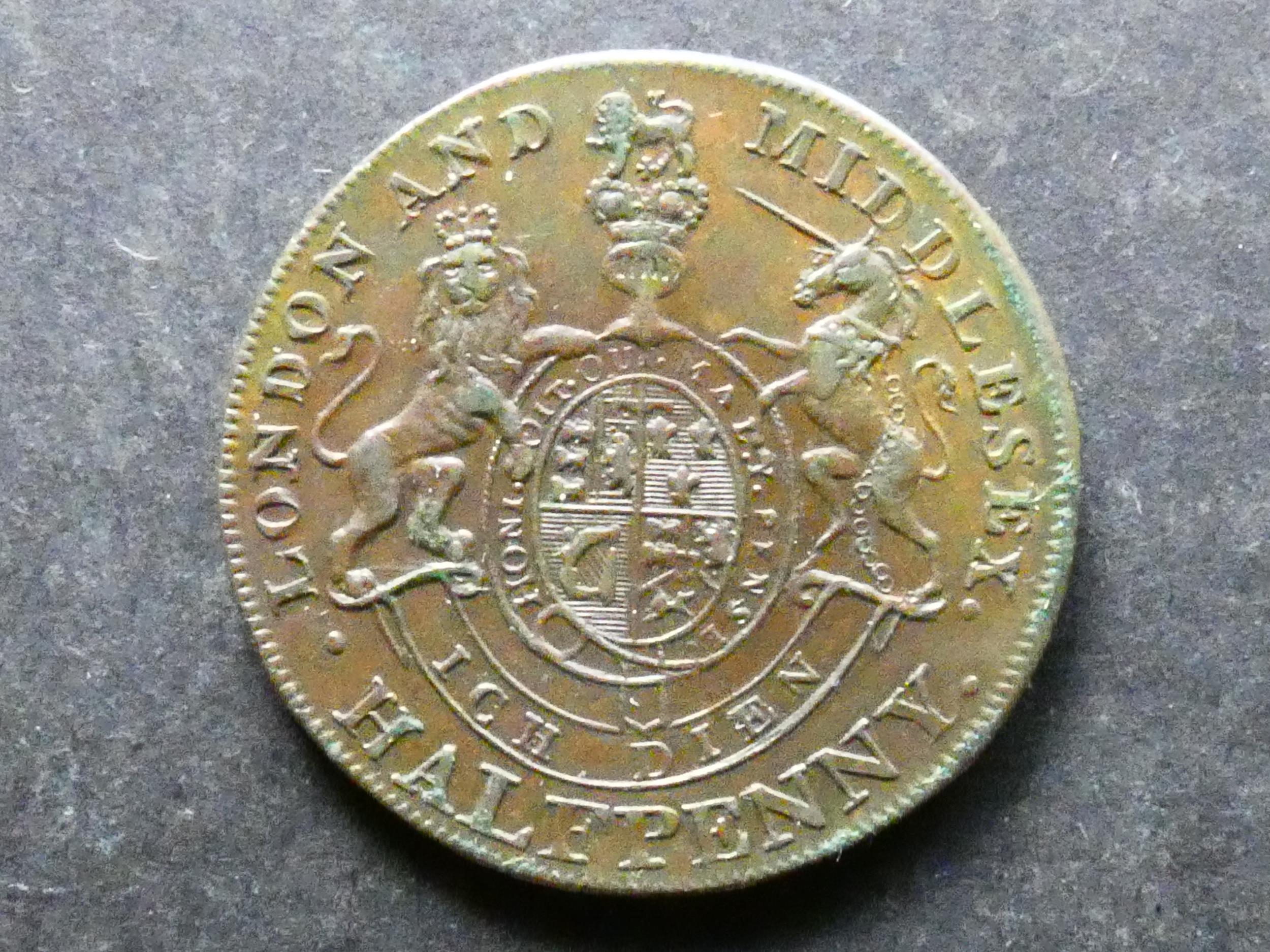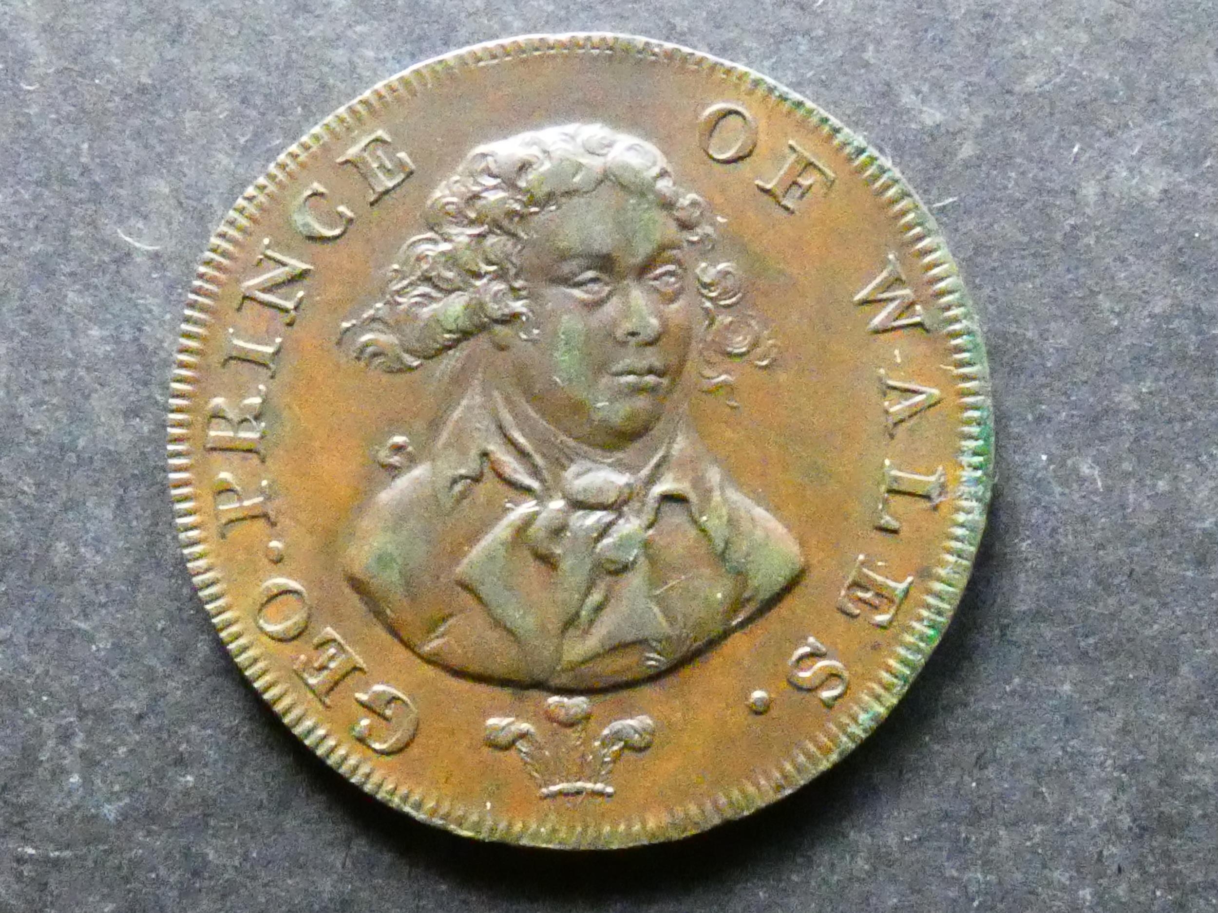 TRADESMEN'S TOKENS, 18TH CENTURY. Middlesex, Halfpenny, national series, 1794, obverse; GEO. PRINCE OF WALES, bust ¾ right, reverse; LONDON AND MIDDLESEX HALFPENNY, the royal arms, &c., edge; BRIGHTON CAMP HALFPENNY MDCCXCIV, D&H-952, NEF