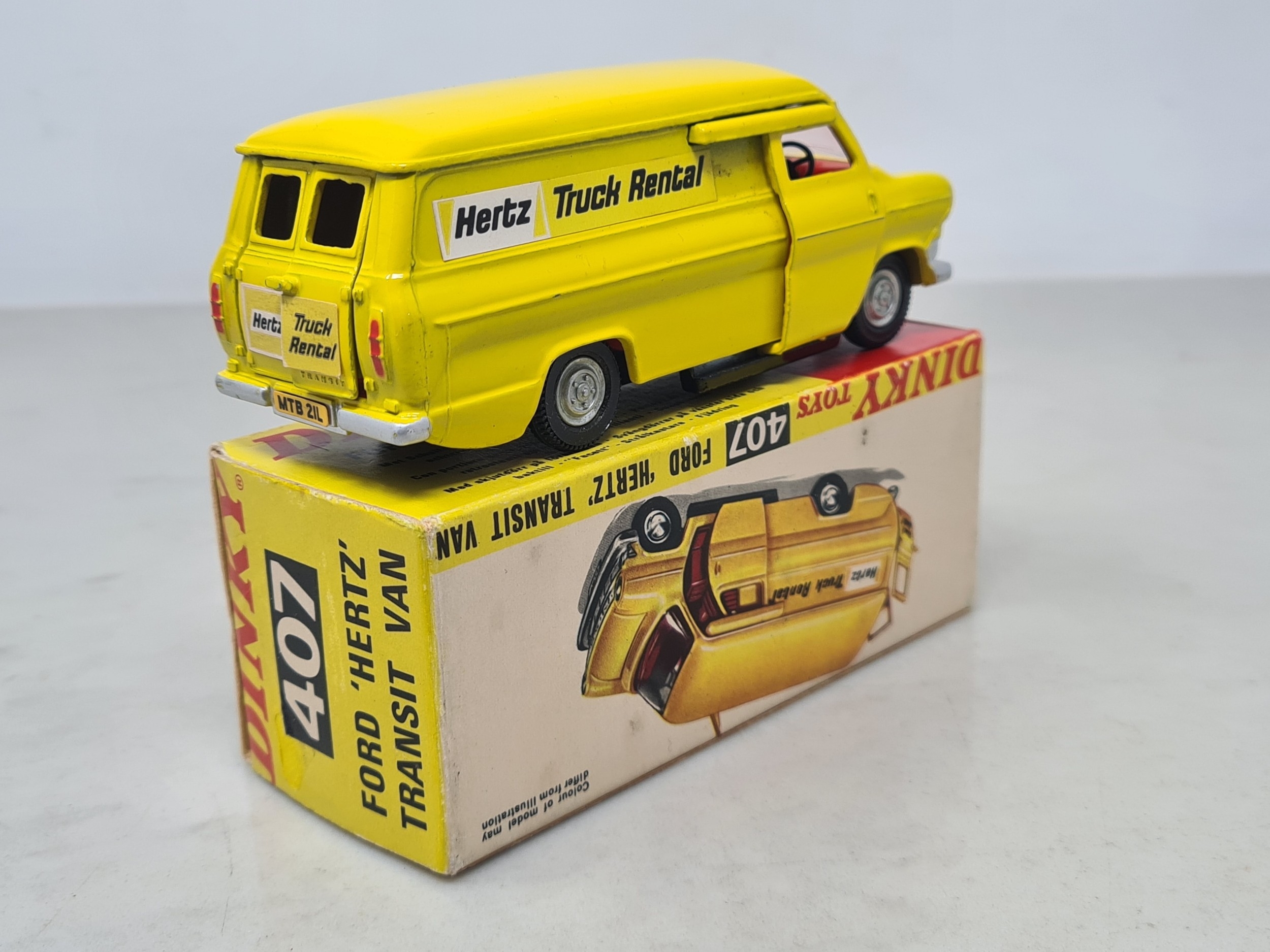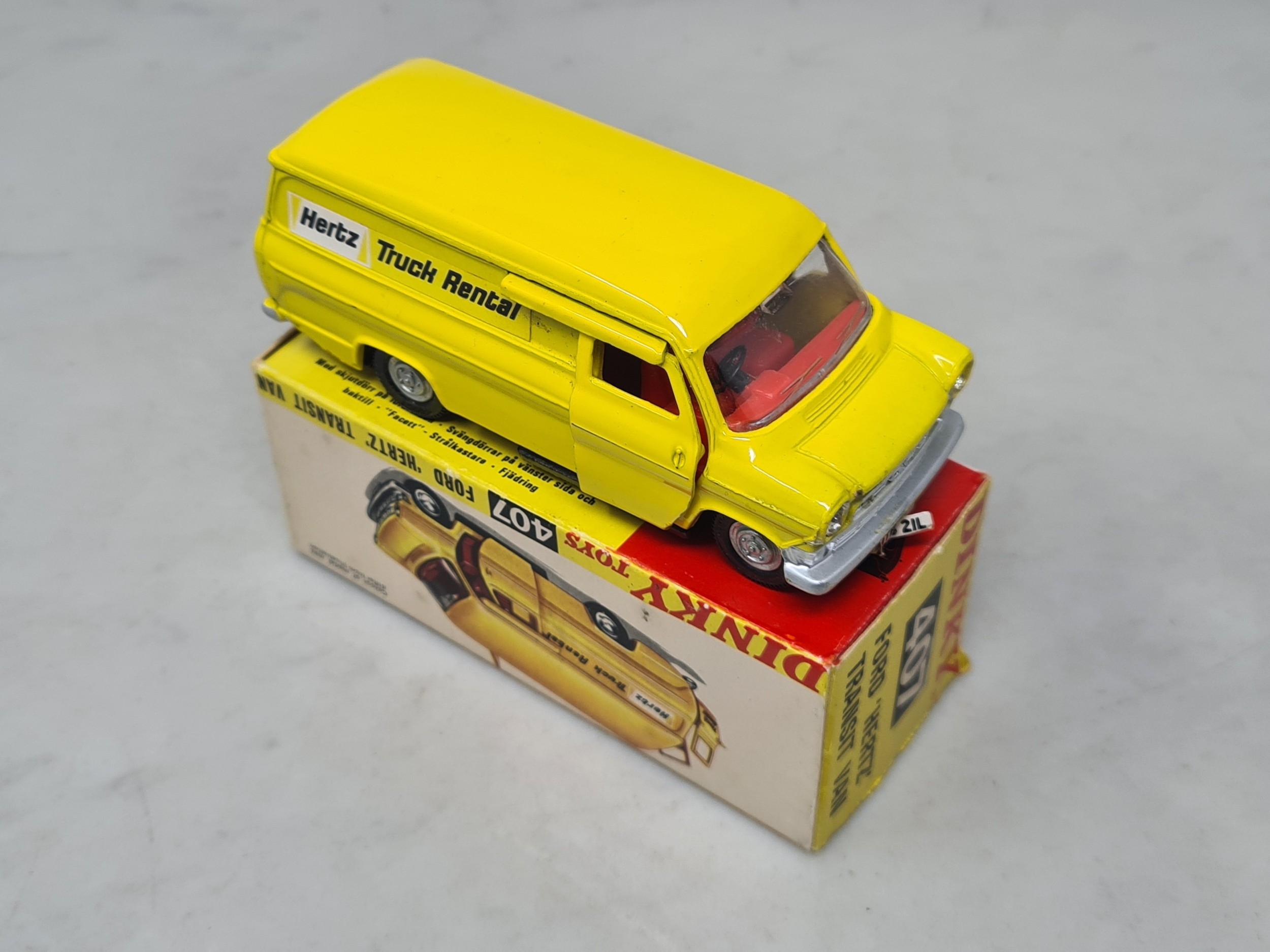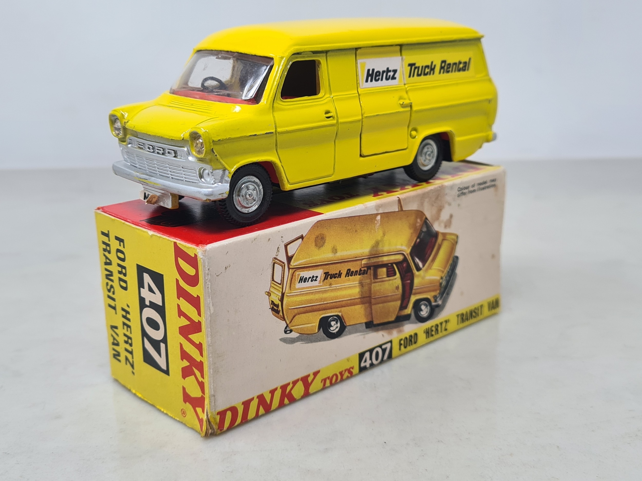 A boxed Dinky Toys No.407 Ford 'Hertz' Transit Van, Nr M, box VG, has stain on one side