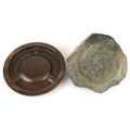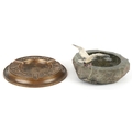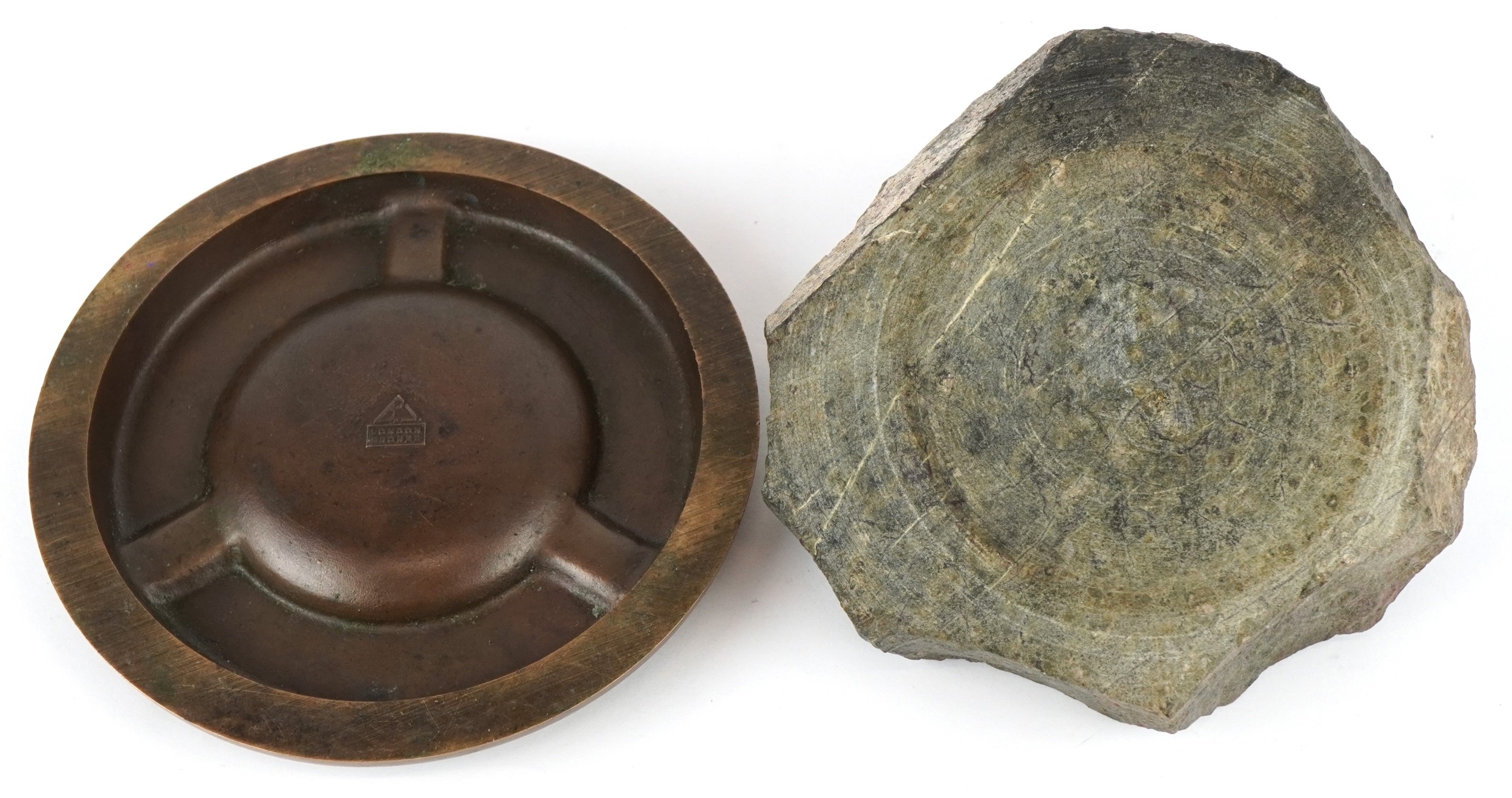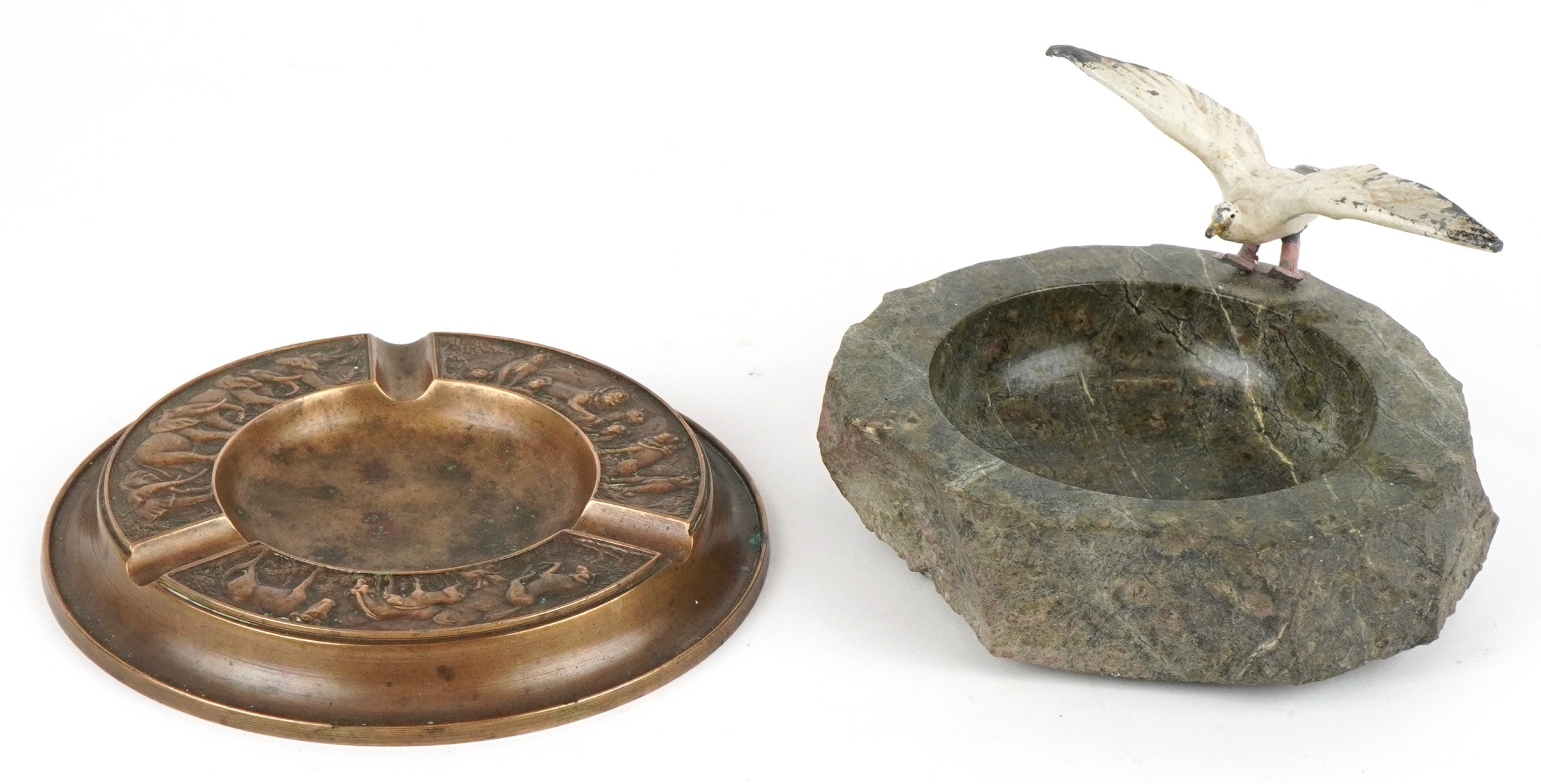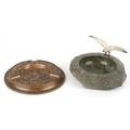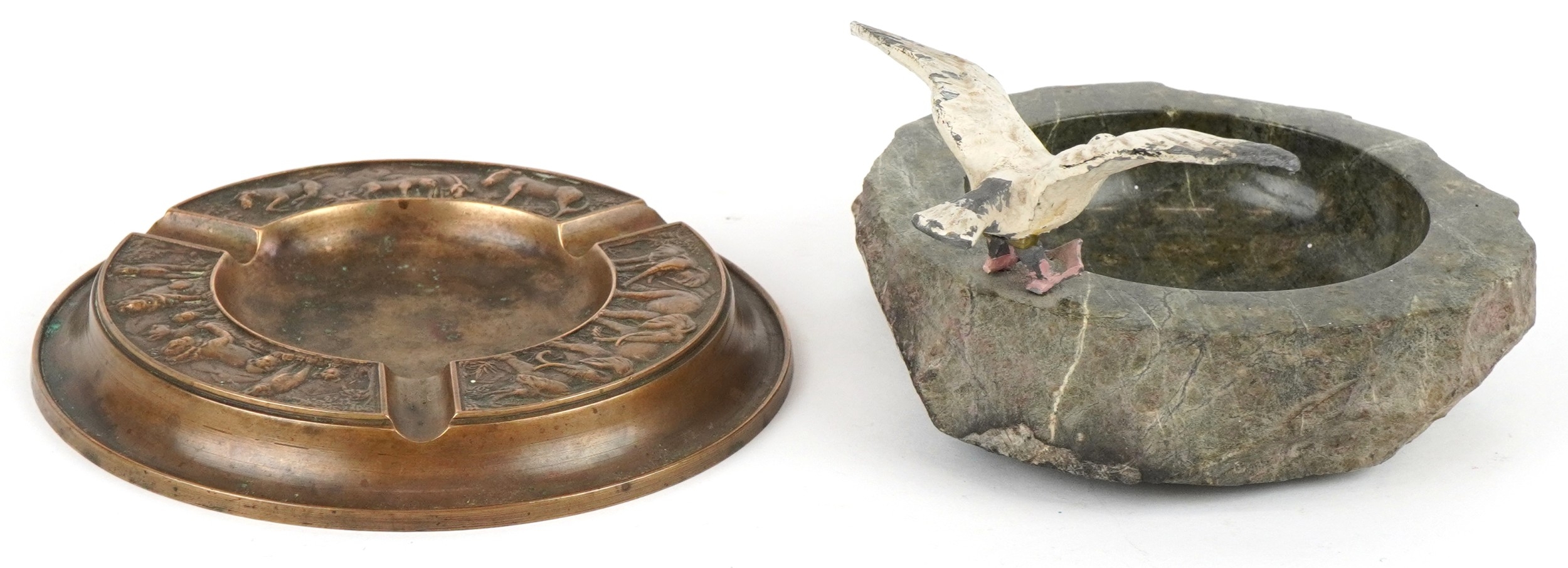 Two ashtrays comprising a London Bronze ashtray embossed with animals and a Cornish serpentine ashtray mounted with a metal seagull, the largest 14cm in diameter.