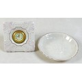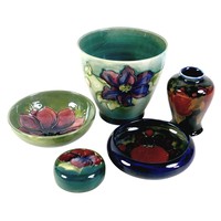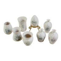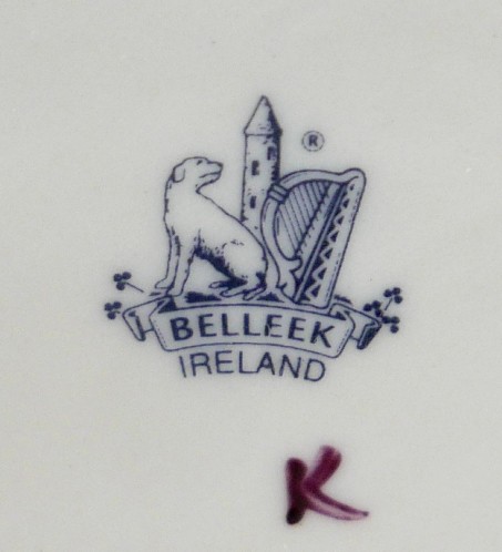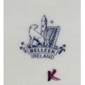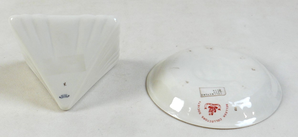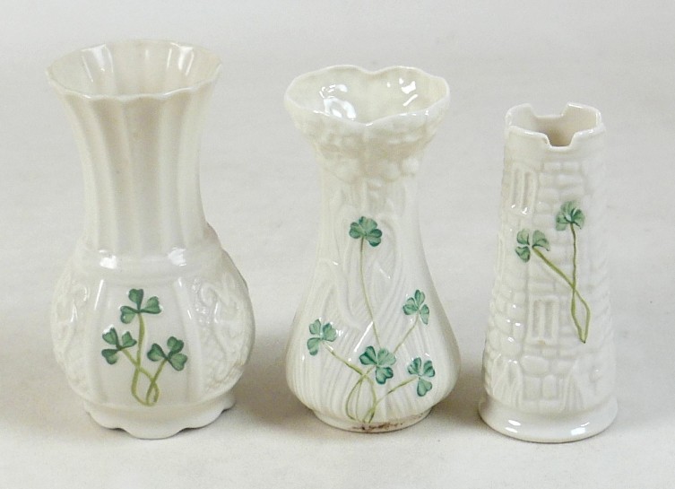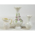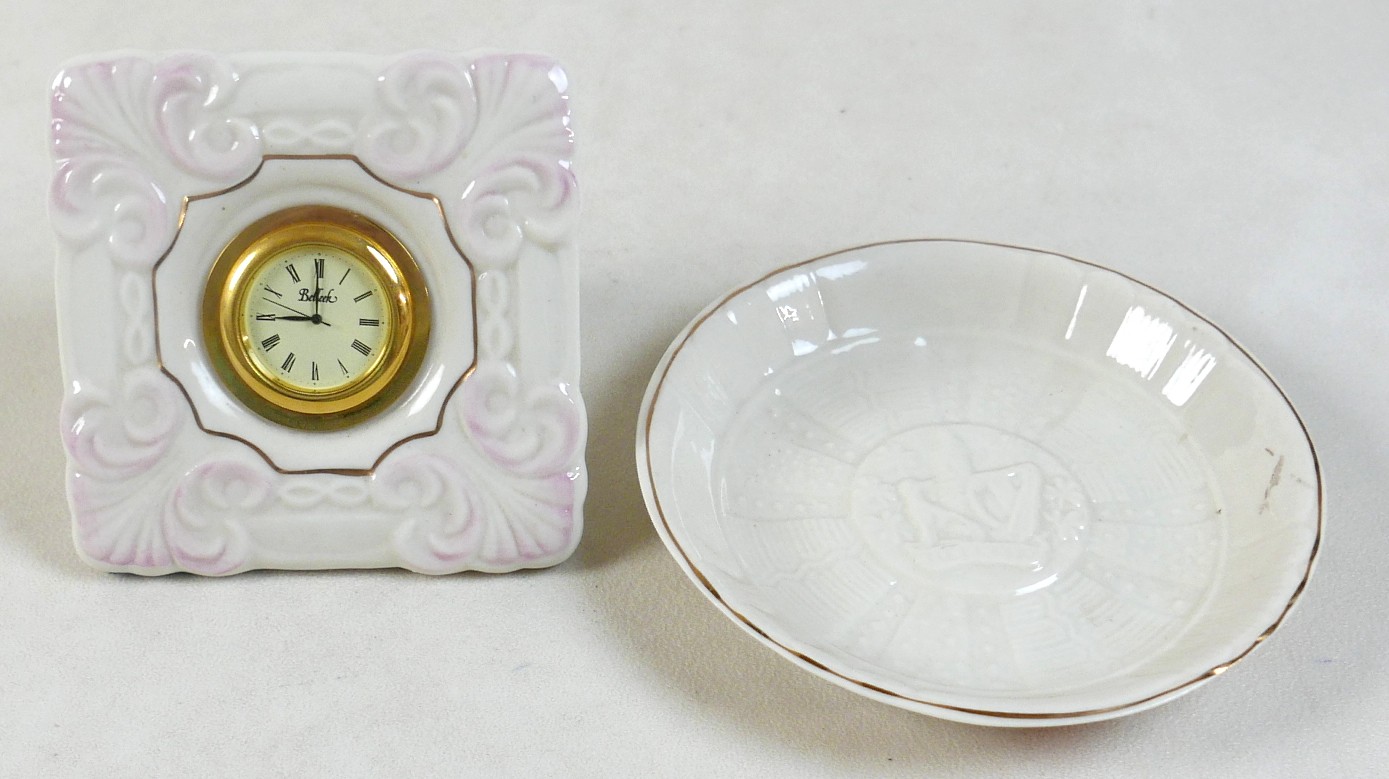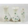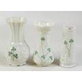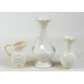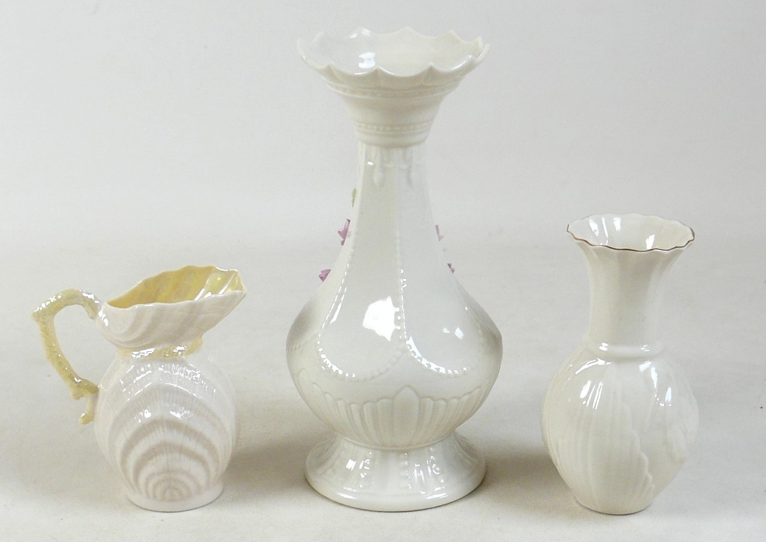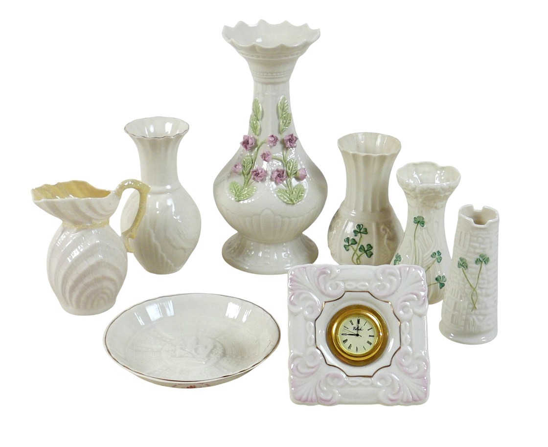 A collection of seven Belleek pieces of pottery to include three shamrock vases and a shell designed jug, largest 21cm high and a Belleek clock 9 x 10 x 9cm high. (8)