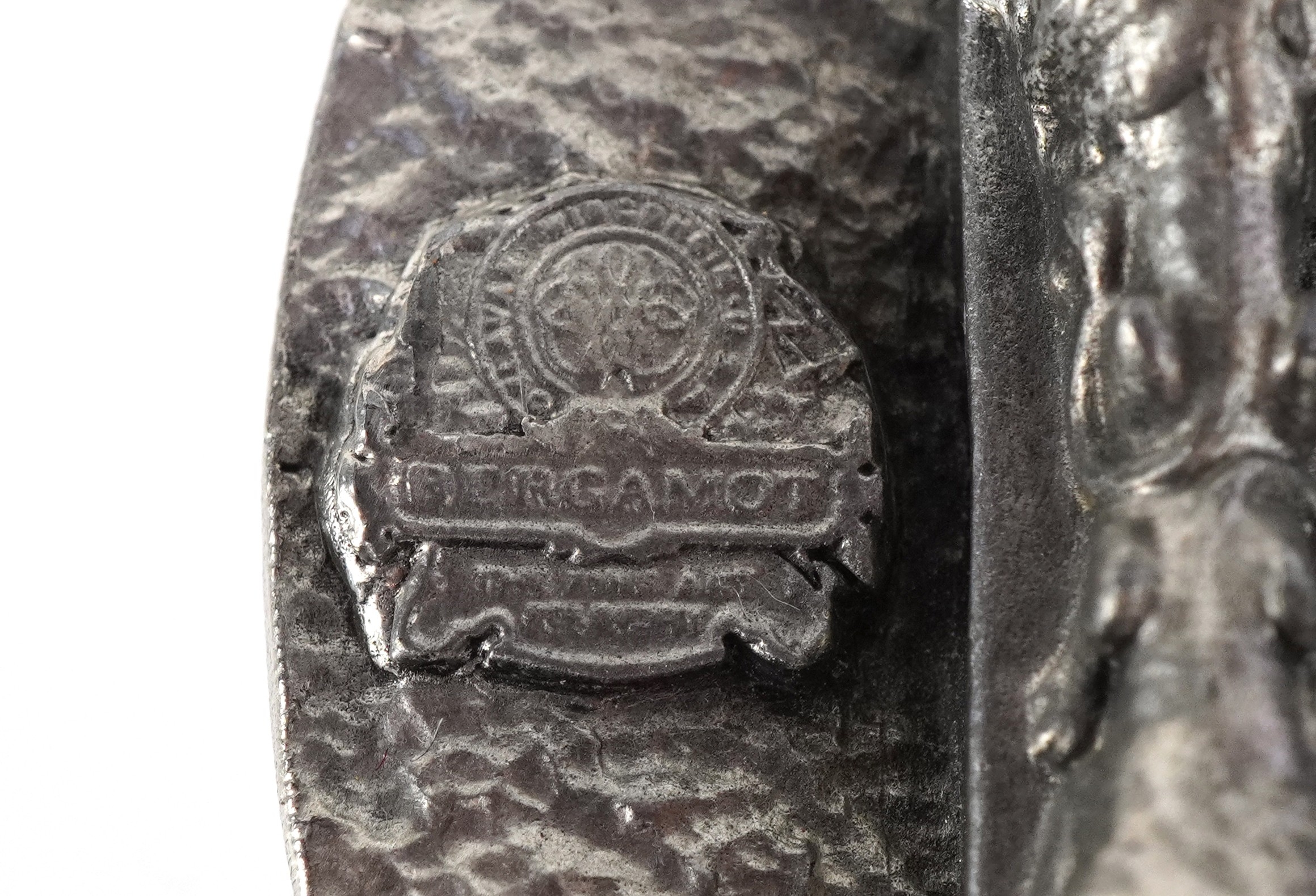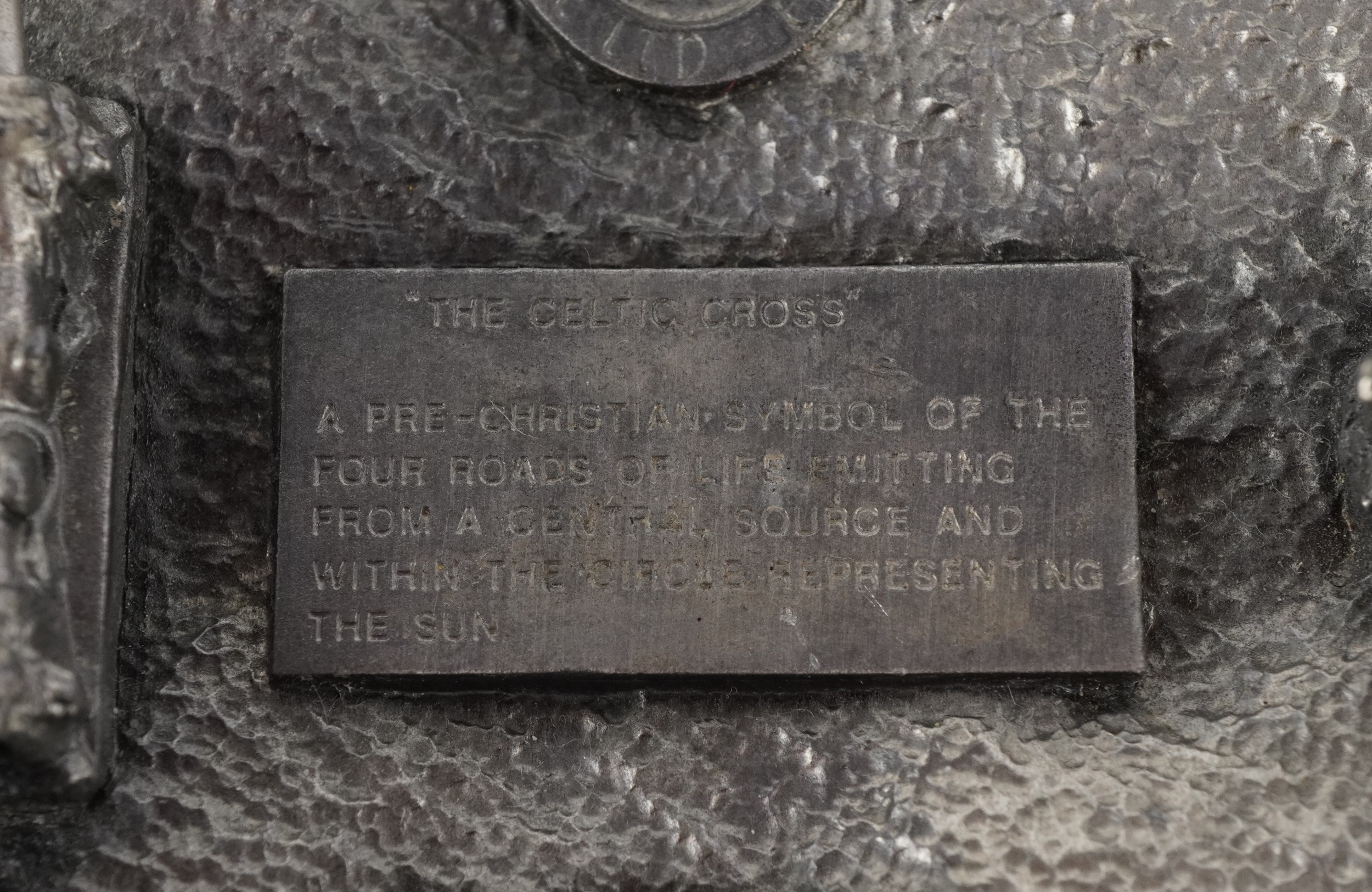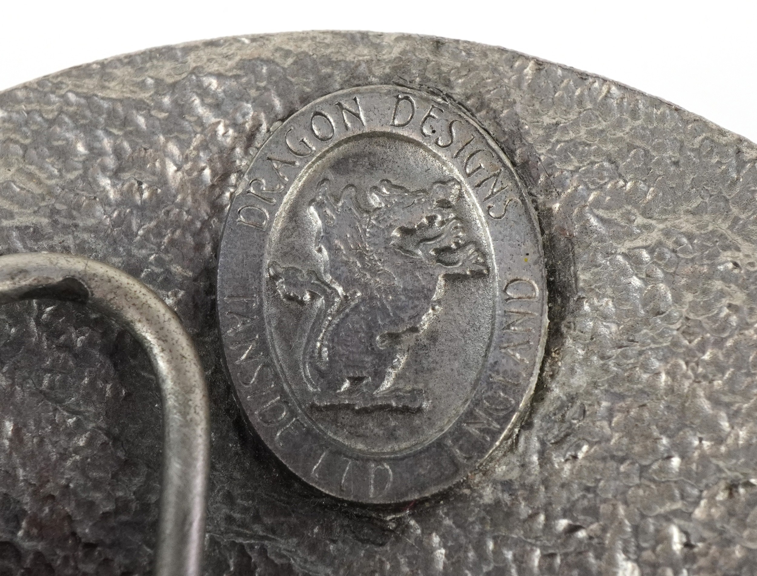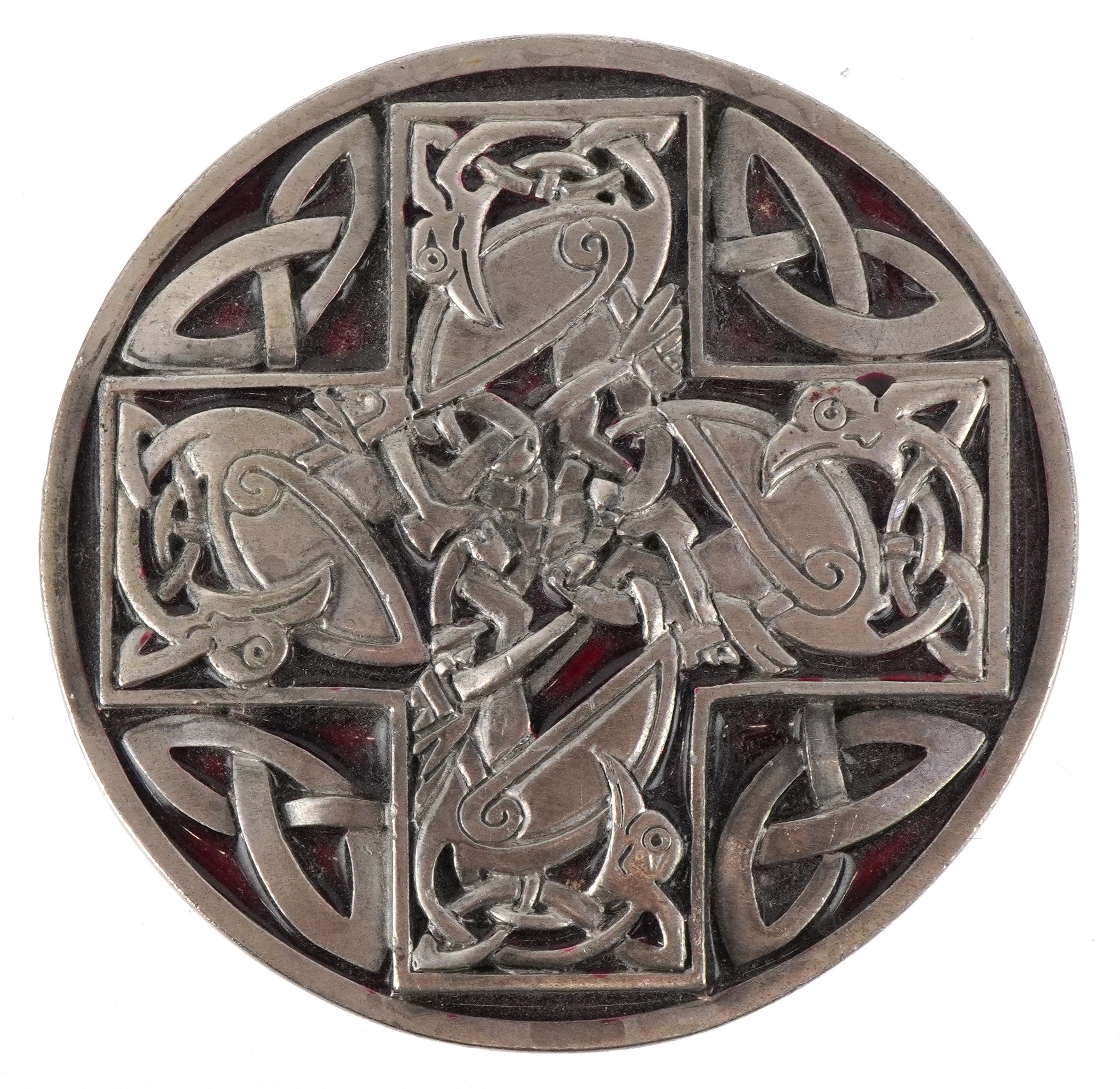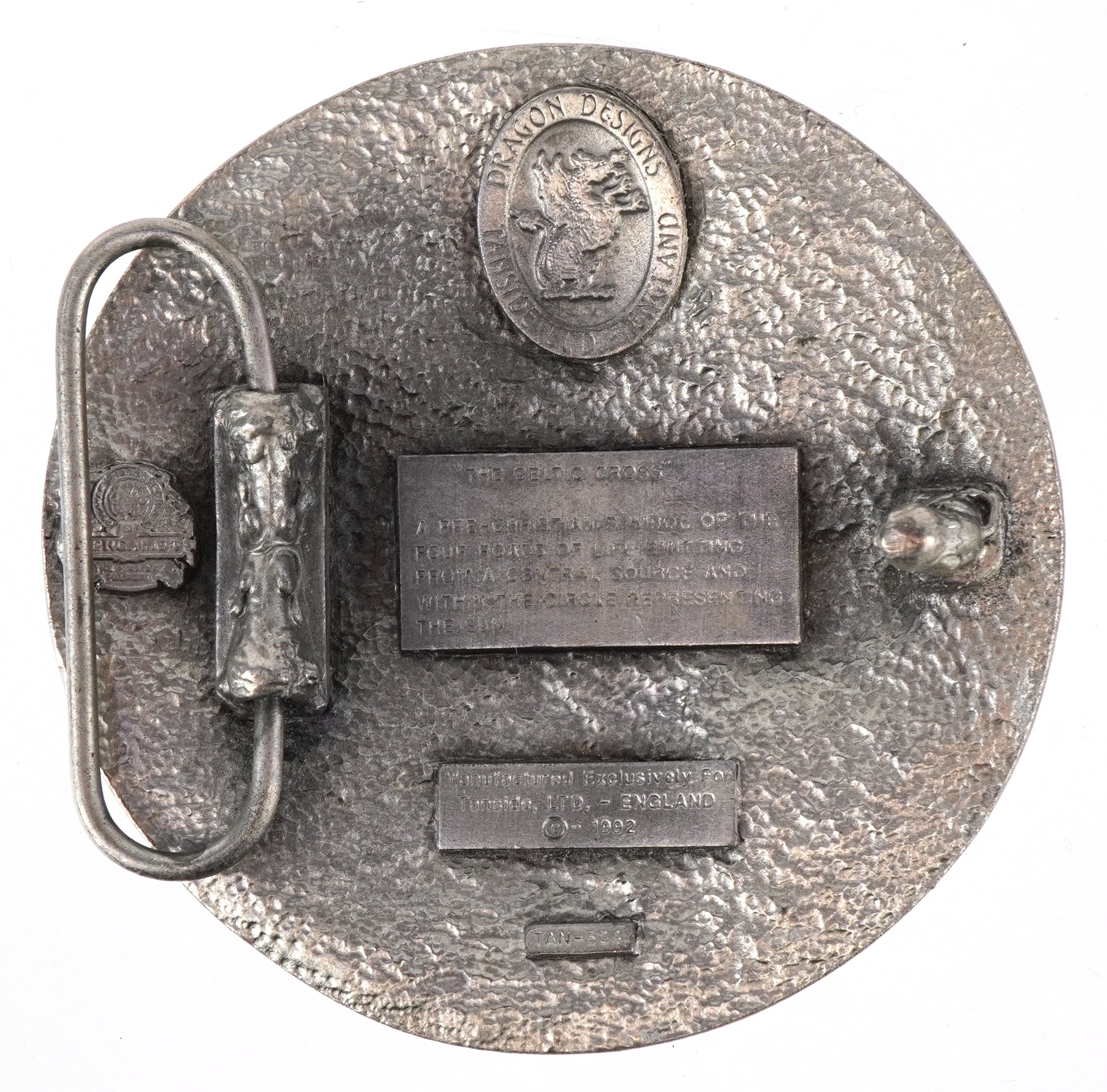 Dragon Designs Tanside, a white metal and enamel Celtic cross belt buckle, 8cm in diameter.