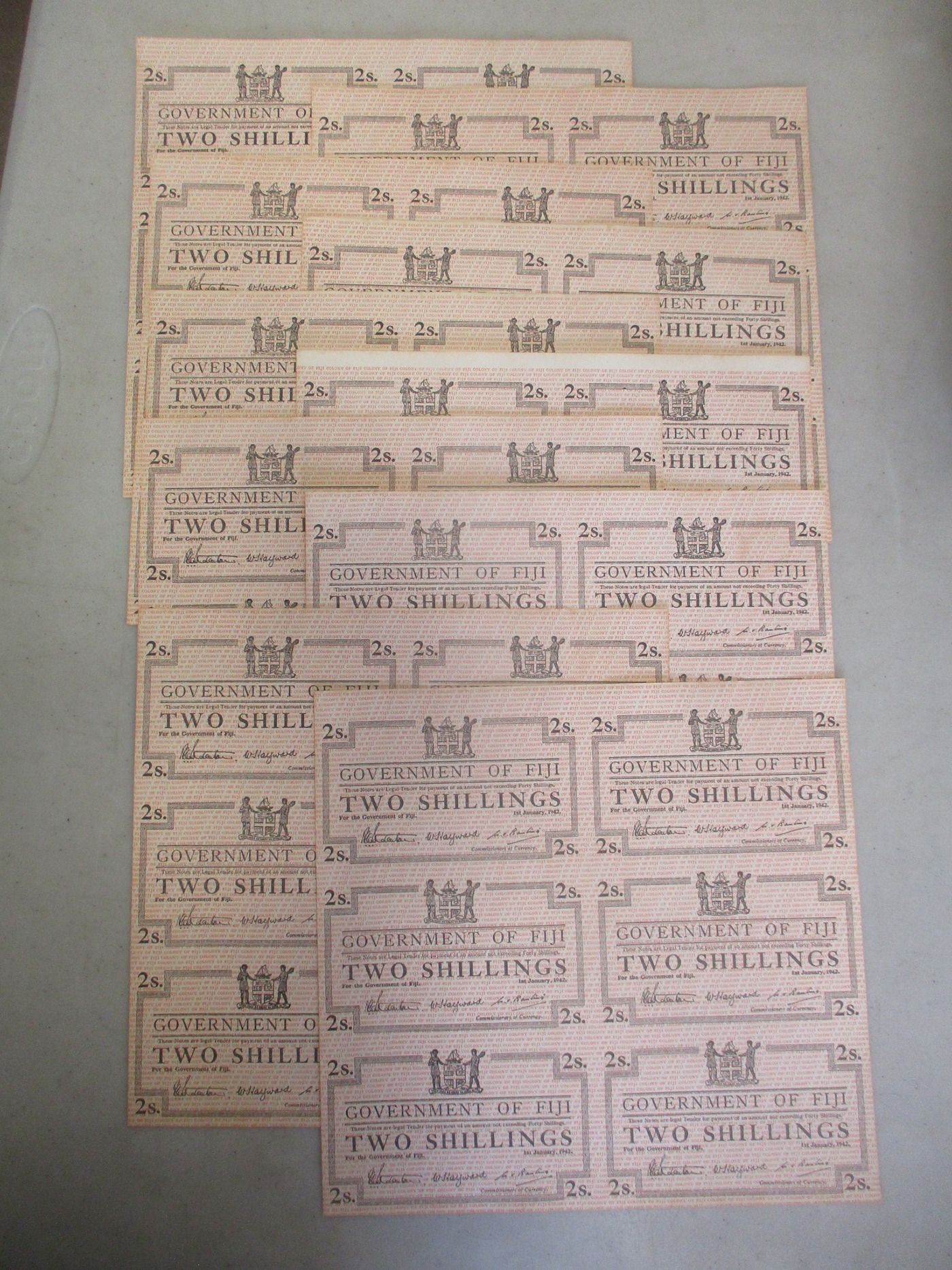 Fiji. Uncirculated range of 1942 2 shillings remainder without serial numbers sheets of 6. (Krause 50r2) cat $9500 Qty 10 sheets (R)