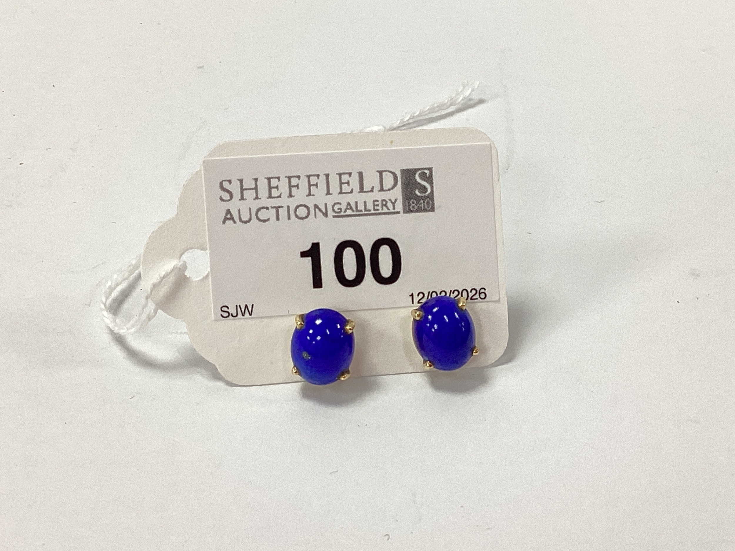 A Pair of Lapis Lazuli Single Stone Earrings, each oval cabochon four claw set, butterfly backs stamped "14kt".
