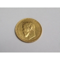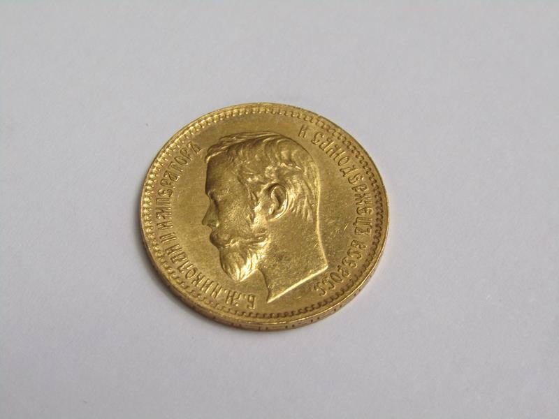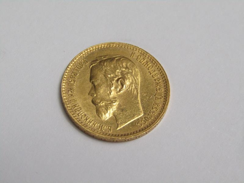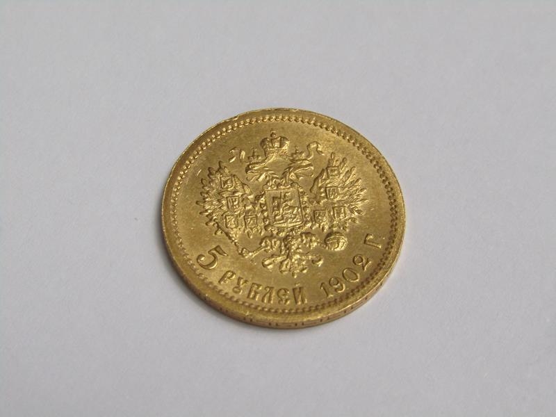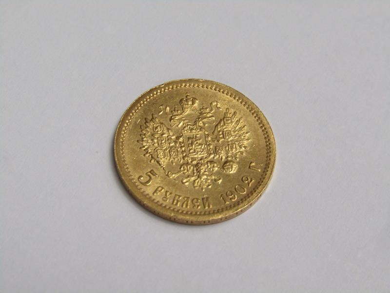 A 1902 Russia five Roubles Tsar Nicholas II gold coin.