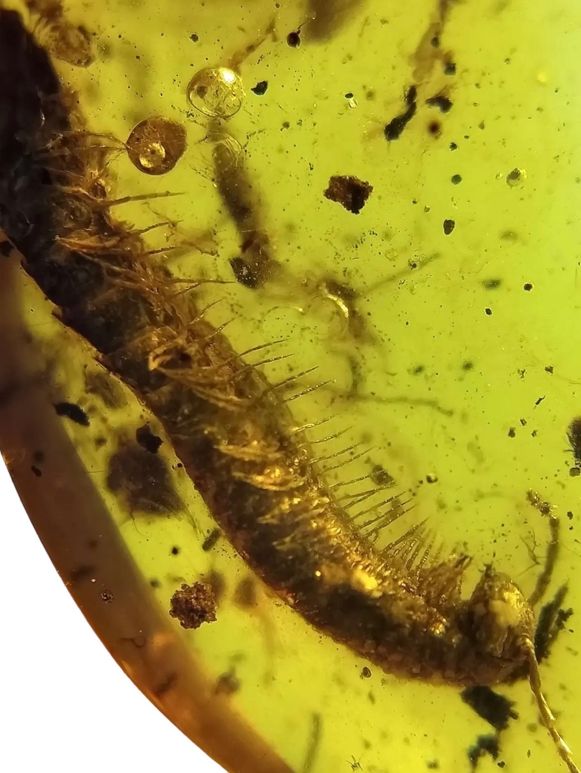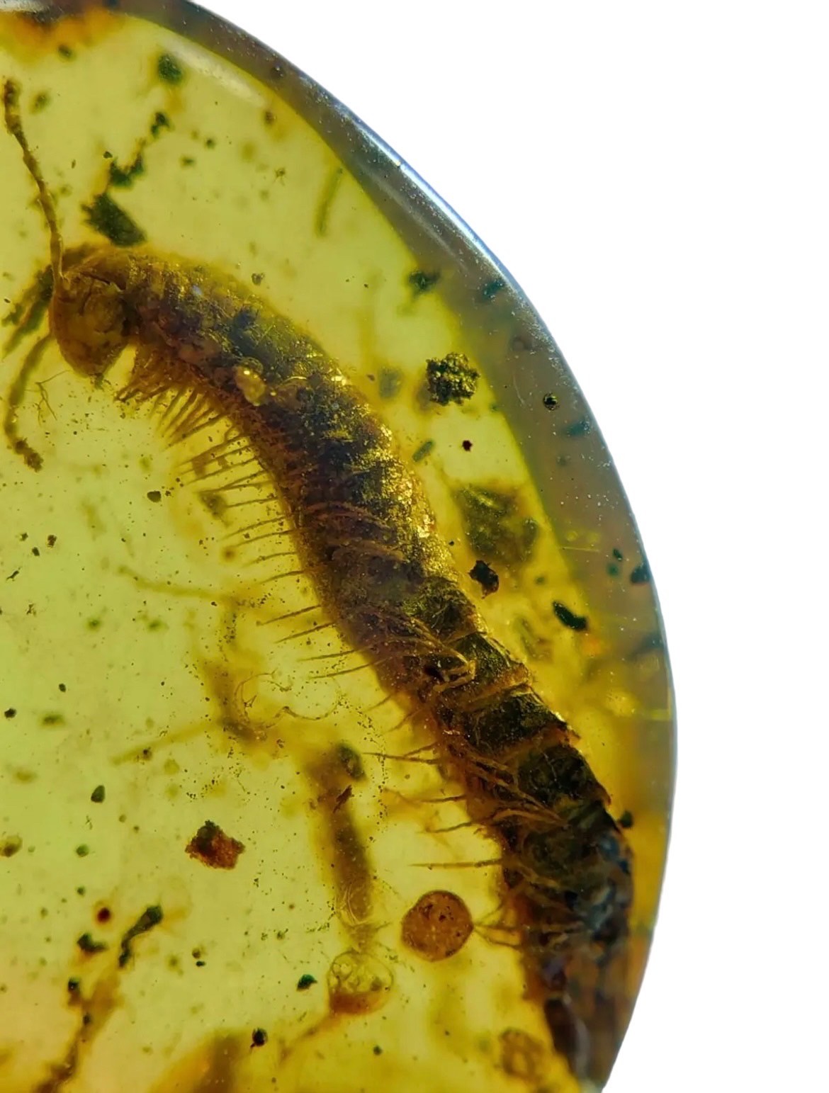 This fossilised millipede encased in dinosaur-aged Burmese amber shows fantastic detail, with even its eyes preserved. From the amber mines of Kachin, Myanmar - fossilised during the Cretaceous, crawling in the foot steps of dinosaurs. Circa 99 million years old.