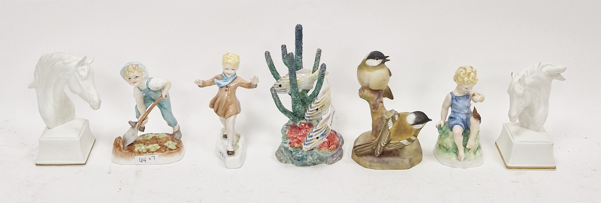 Group of Royal Worcester figures of children after F G Doughty, comprising Teatime, two others unmarked, a Royal Worcester bone china model of coal tits perched on a branch, a figure of yellow grunt model no.3576 amongst coral and rockwork, modelled by Ronald Van Ruyckevelt and two white biscuit busts of horses, titled Bronte and Phlegon, various printed factory marks and painted letters and numerals, tallest 14.5cm high (7)
