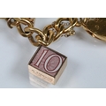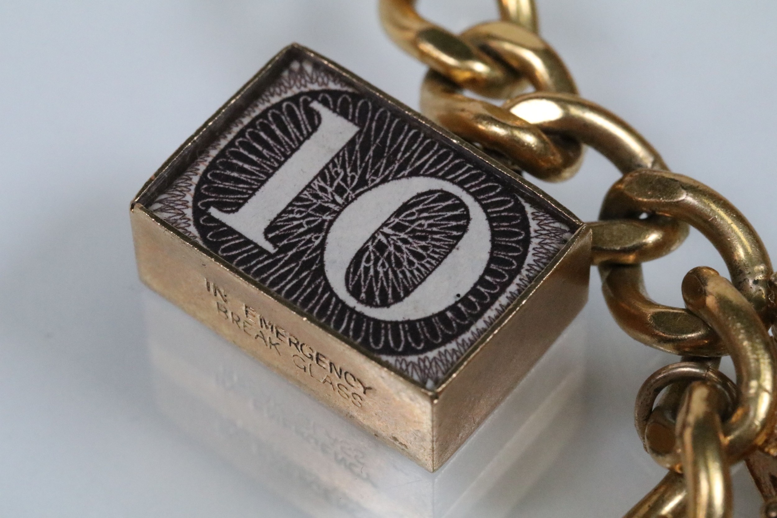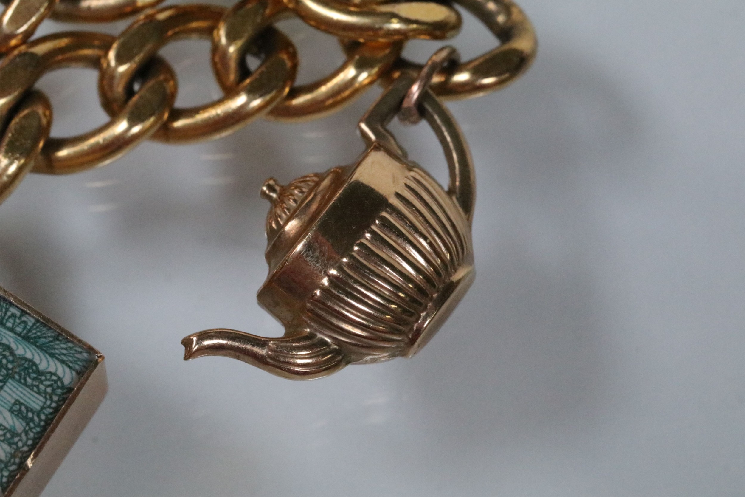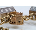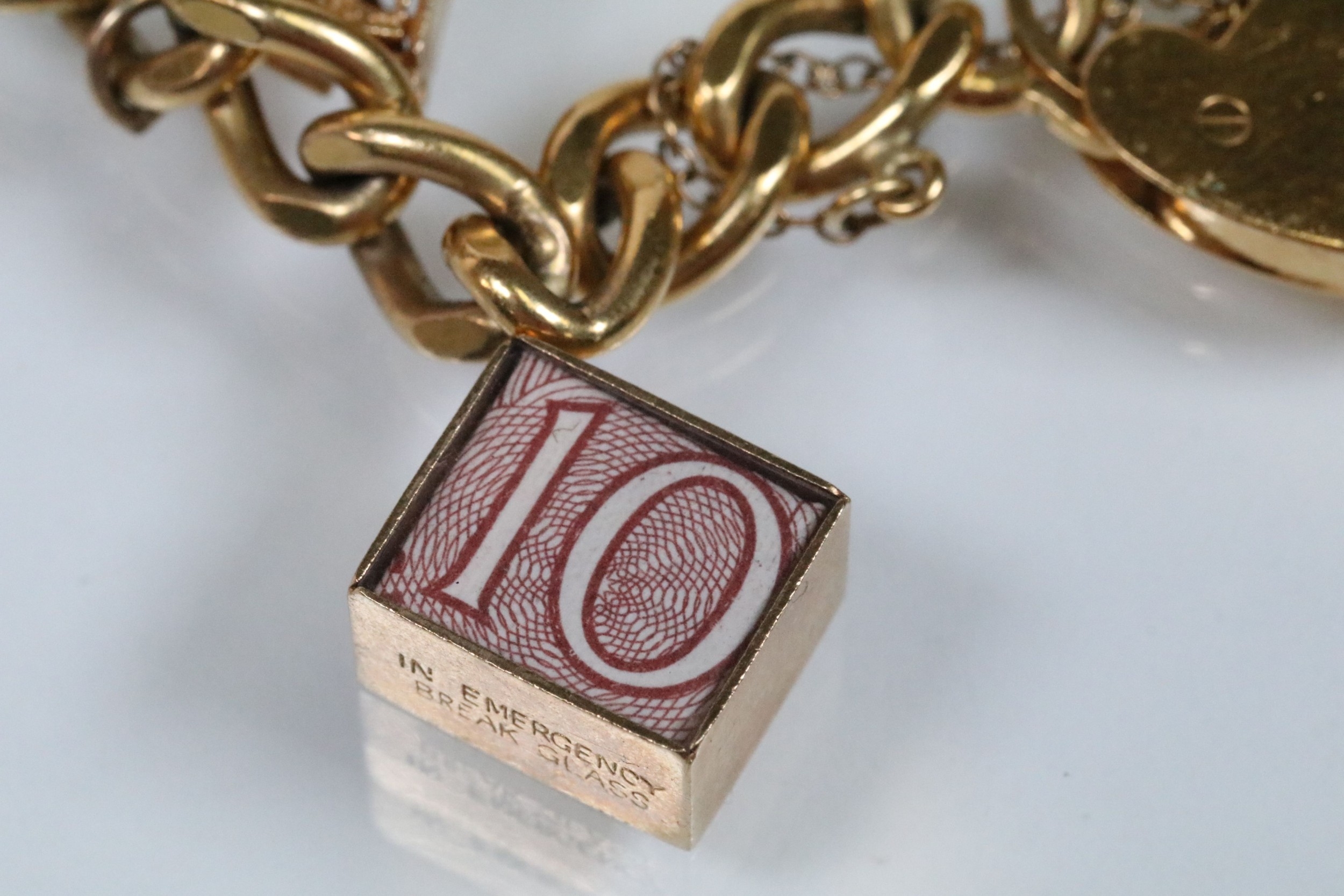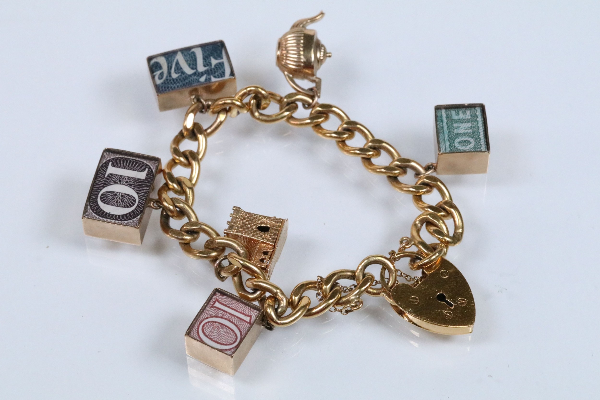 Vintage rolled gold charm bracelet with a curb link chain having four 9ct gold bank note charms (all hallmarked), a 9ct gold teapot charm and a yellow metal church charm. Chain measures 7 inches.