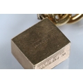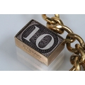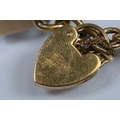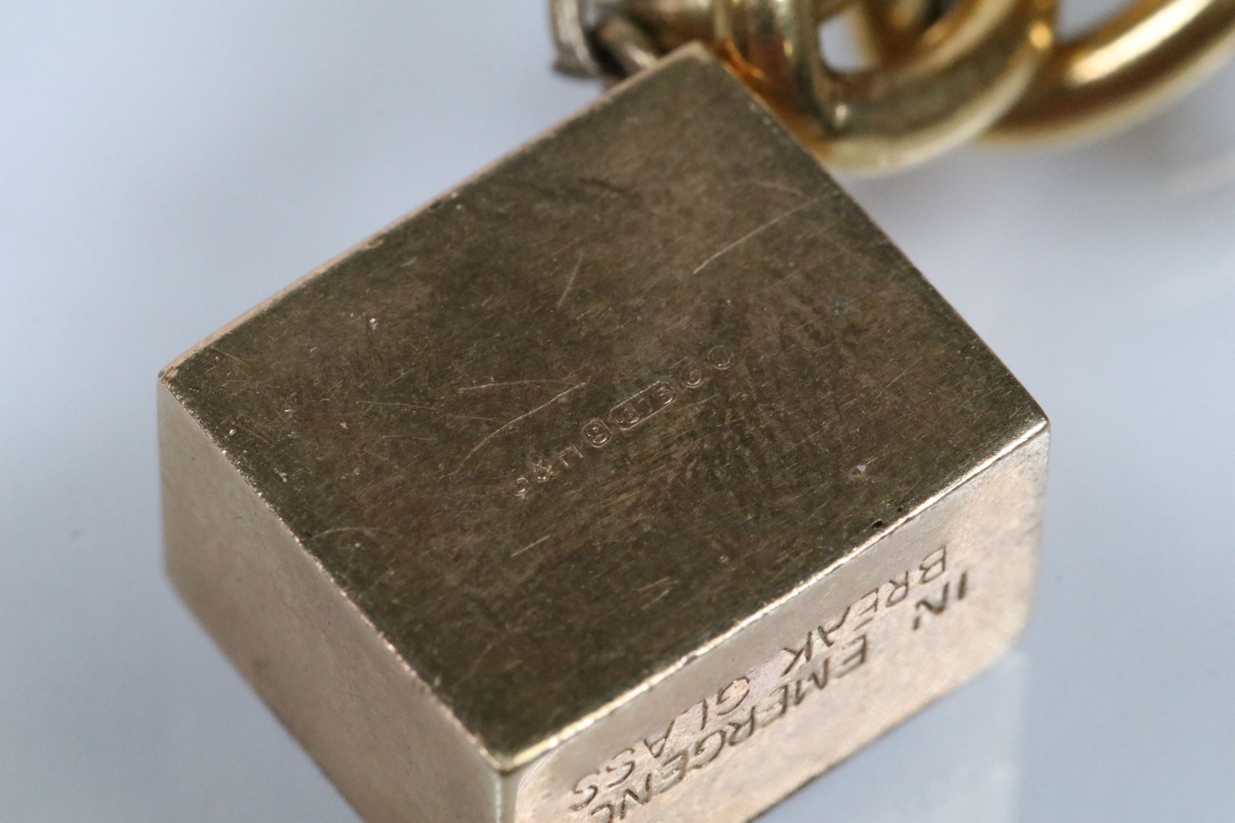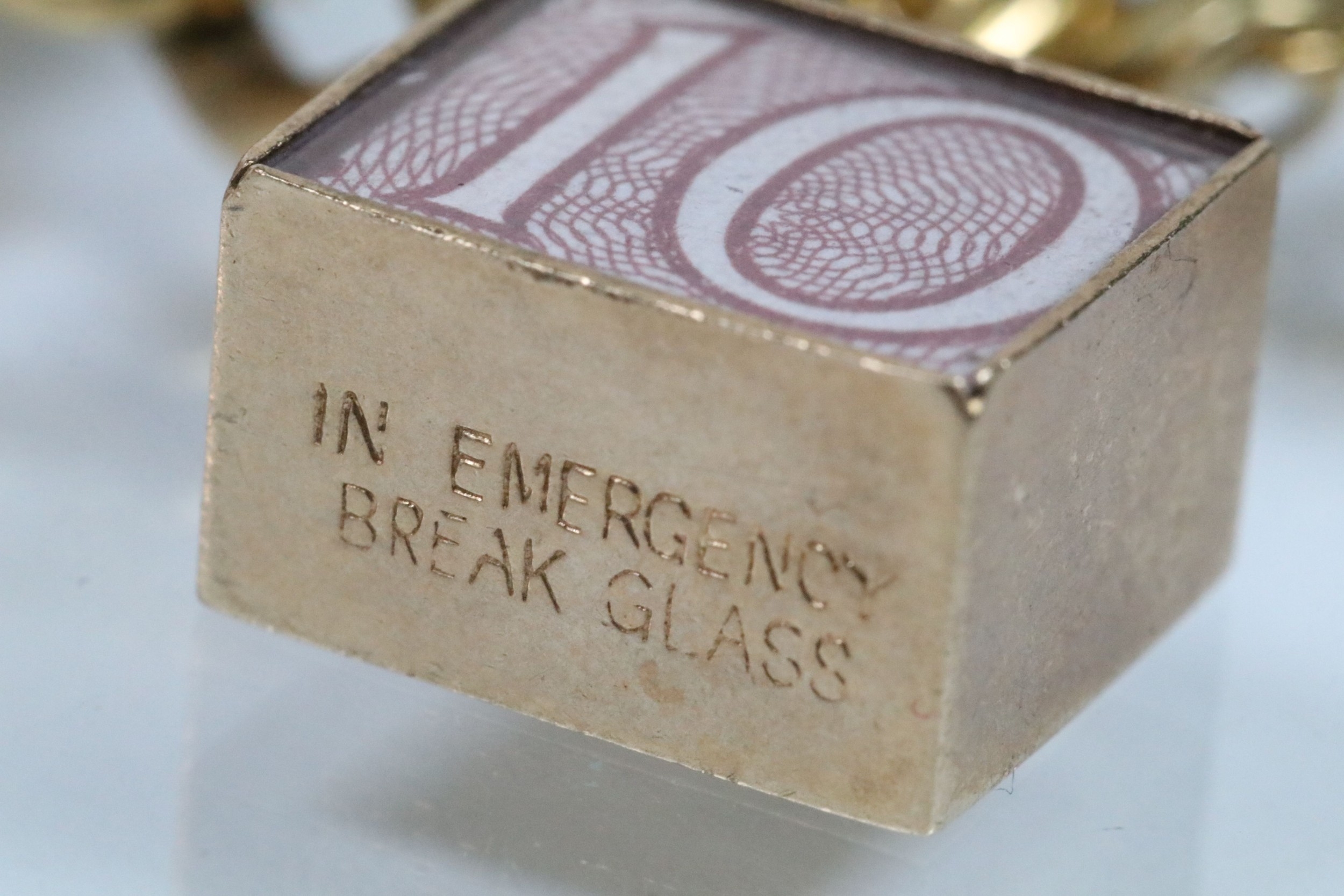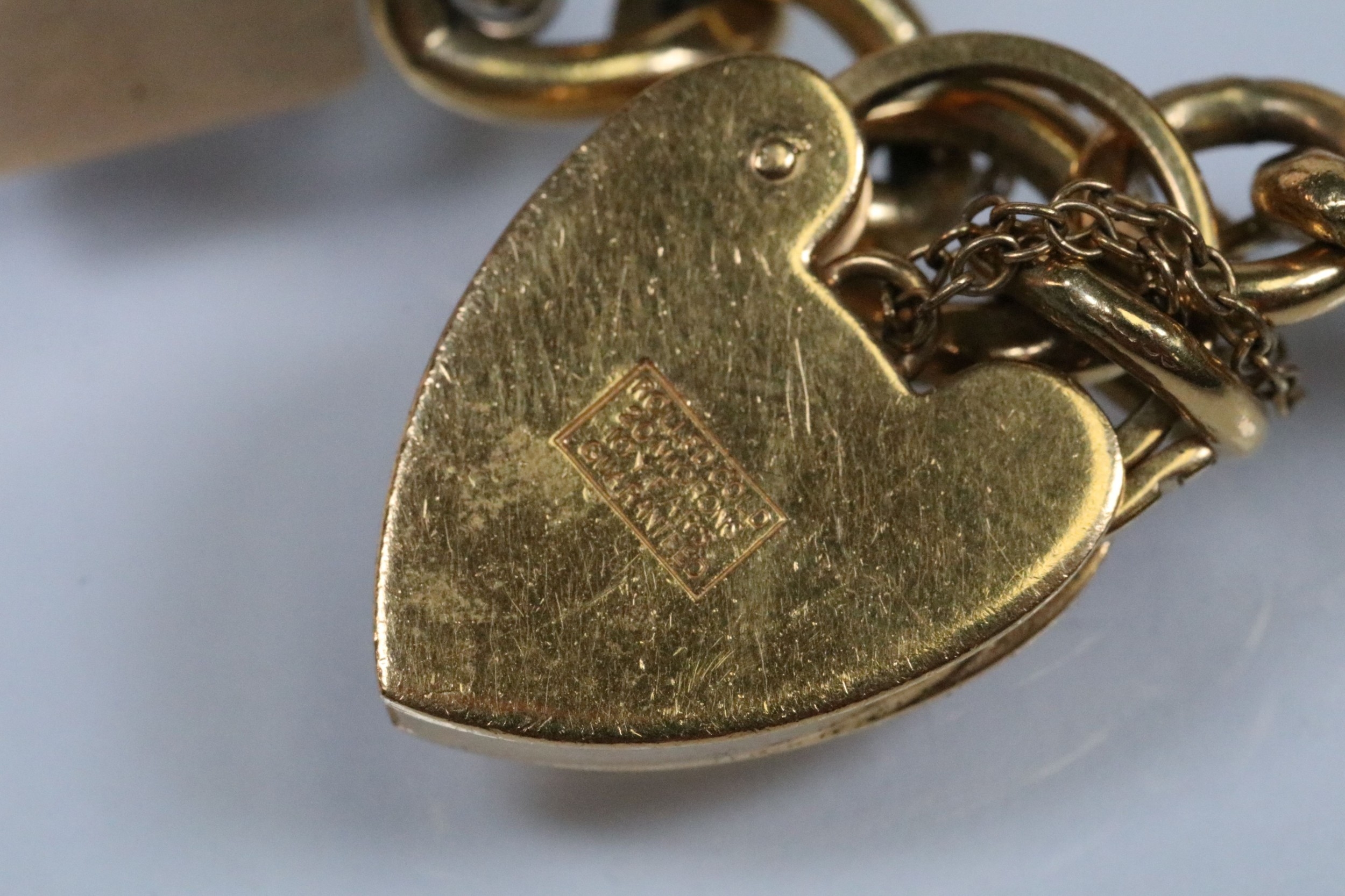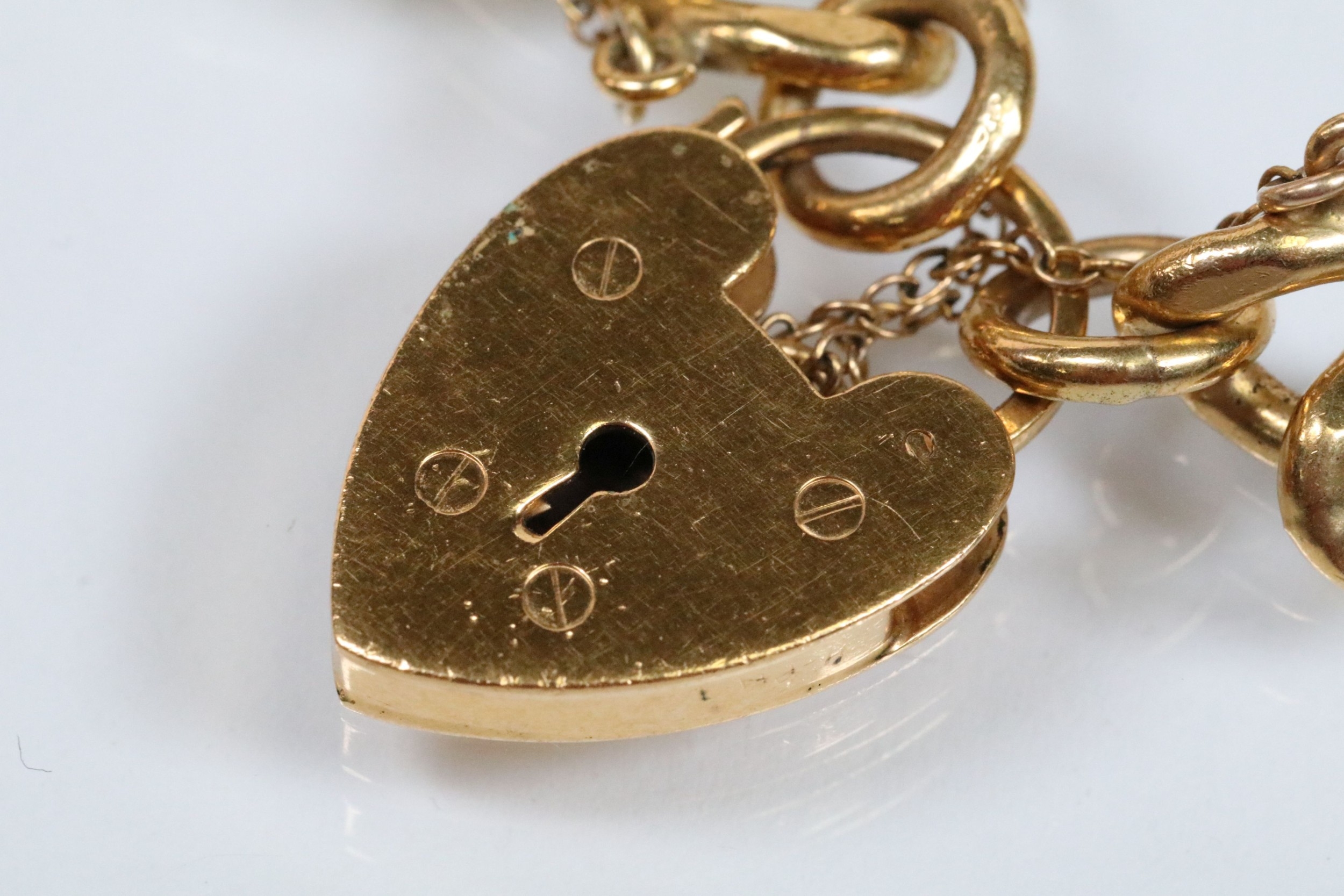 Vintage rolled gold charm bracelet with a curb link chain having four 9ct gold bank note charms (all hallmarked), a 9ct gold teapot charm and a yellow metal church charm. Chain measures 7 inches.