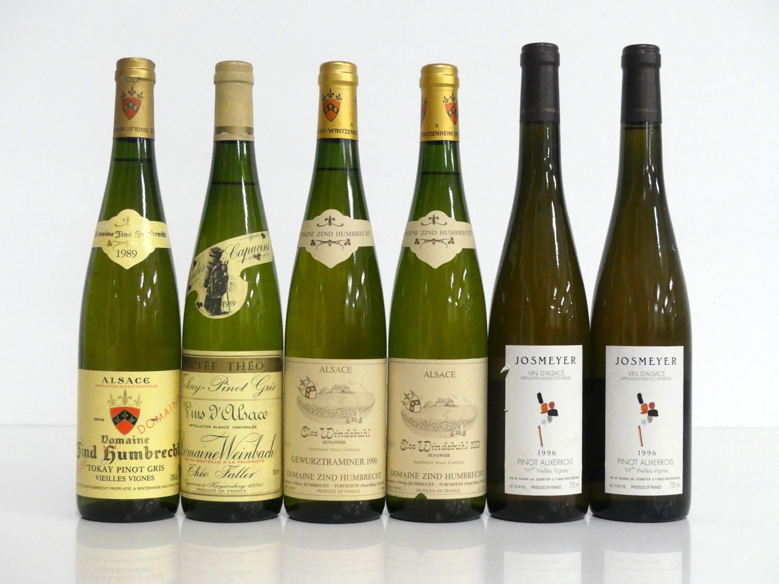 1 bt Dom Zind Humbrecht Tokay Pinot Gris V.V. 1989 1 bt Dom Weinbach Tokay Pinot Gris Cuvée Théo Clos des Capucins 1989 1 bt Dom Zind Humbrecht Clos Windsbuhl Hunawihr Gewurztraminer 1990 1 bt Dom Zind Humbrecht Clos Windsbuhl Hunawihr Gewurztraminer 1991 2 bts Josmeyer Pinot Auxerrois 'H' V.V. 1996 vsl torn label Above 6 bottles