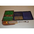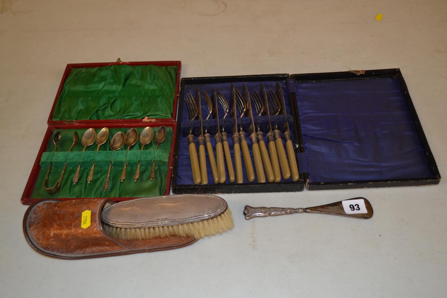 SILVER BACK CLOTHES BRUSH, SHOE HORN, SIX SILVER PLATED TEASPOONS AND SUGAR BOWS IN CASE AND SIX FISH KNIVES AND FORKS IN CASE