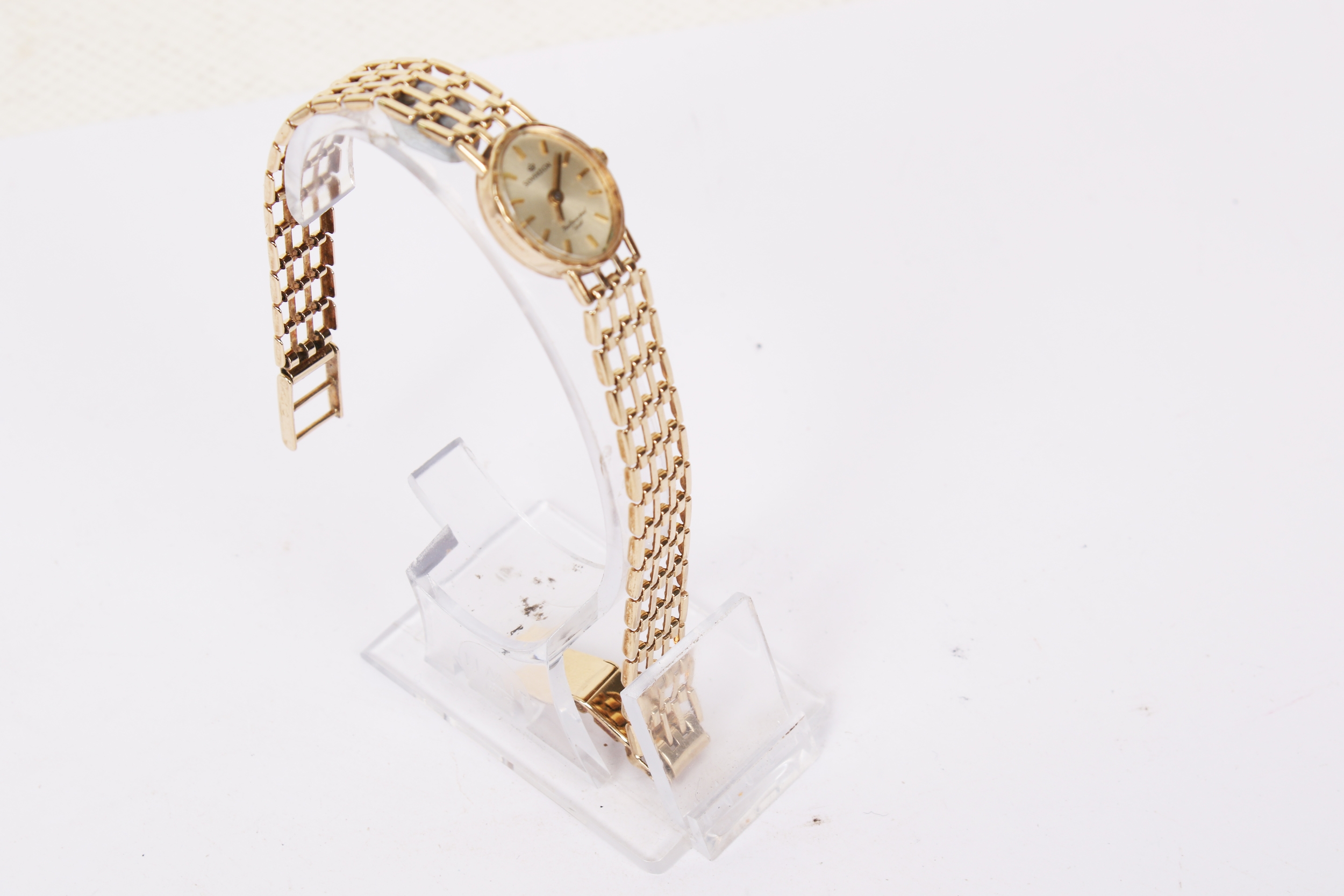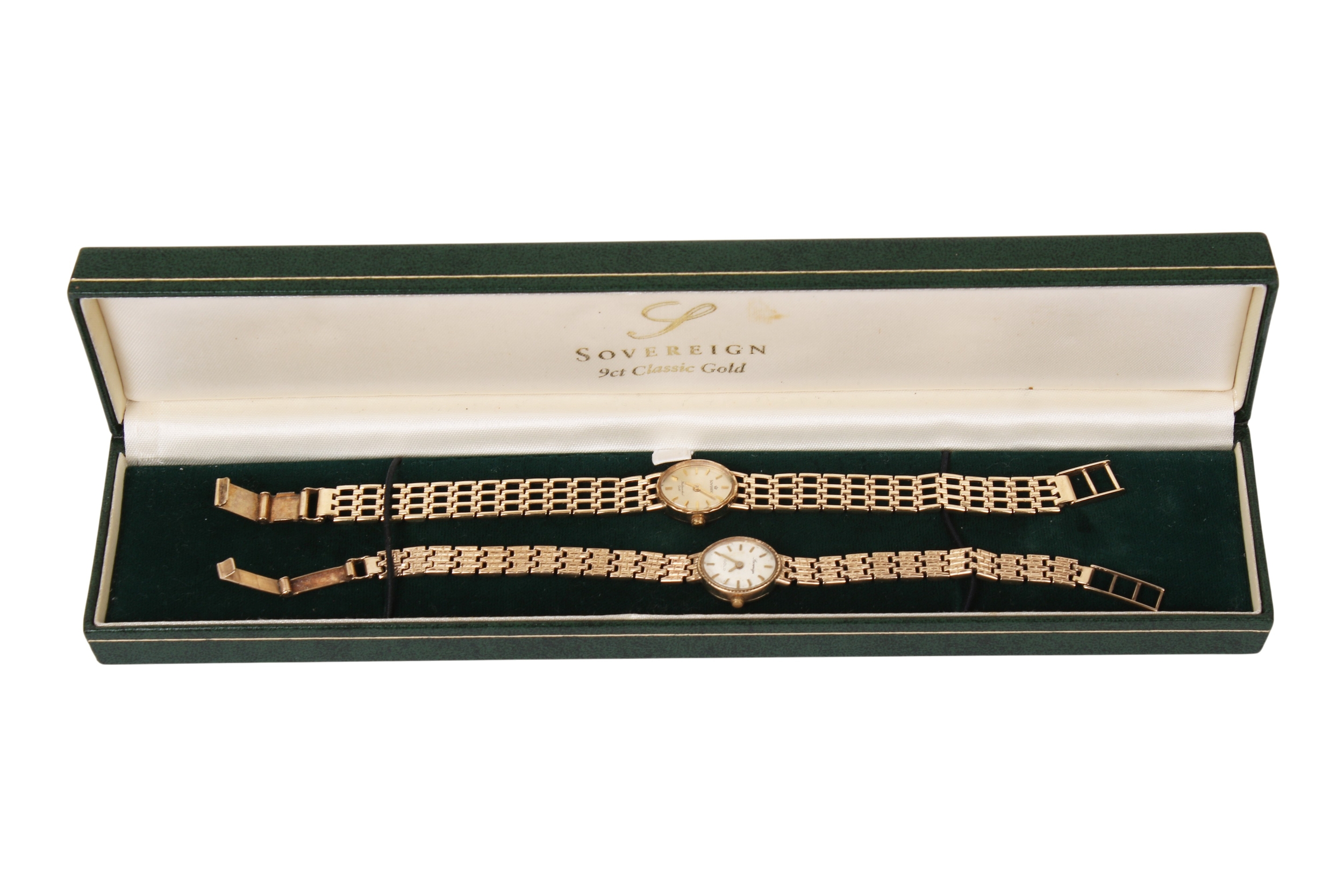 Two 9ct gold ladies' 'Sovereign' dress watches. Both hallmarked to inside back case and bracelet strap clasps, both cases circa 1.7cm x 1.3cm. Gross weight 22.7g.