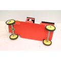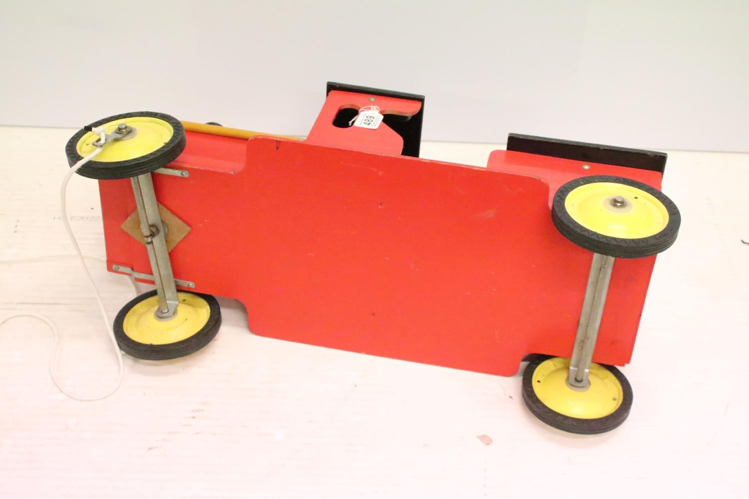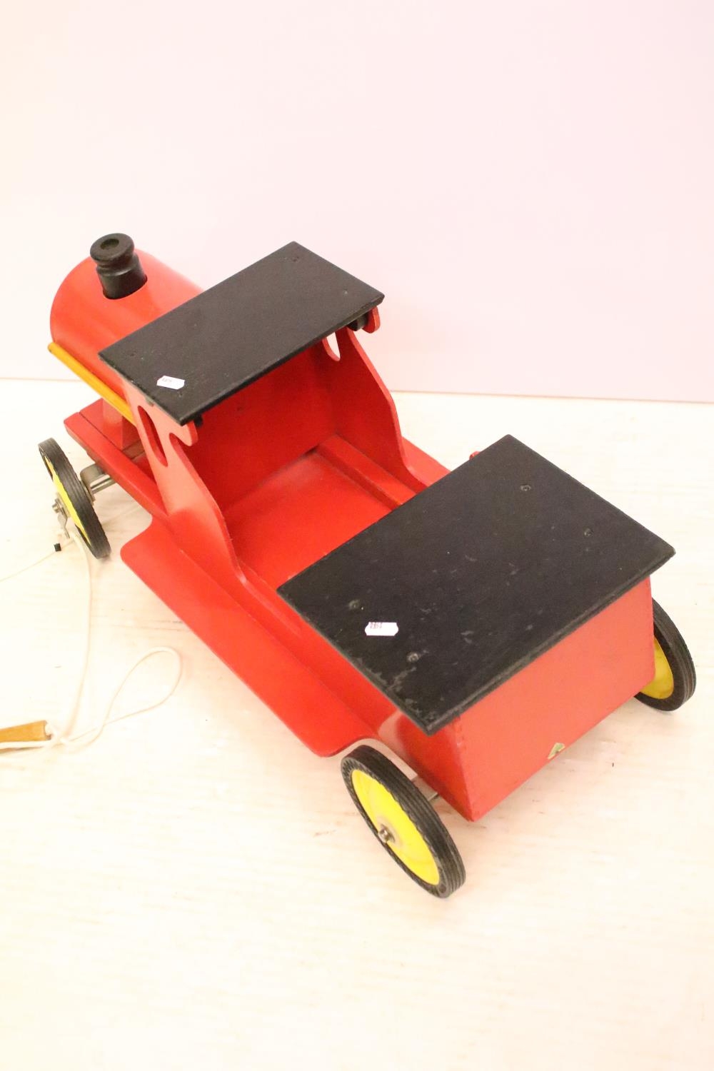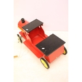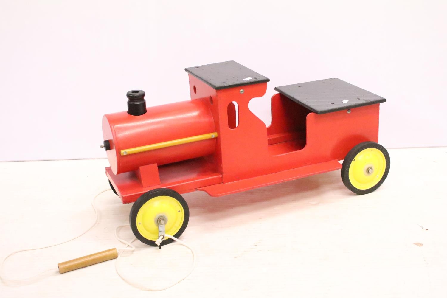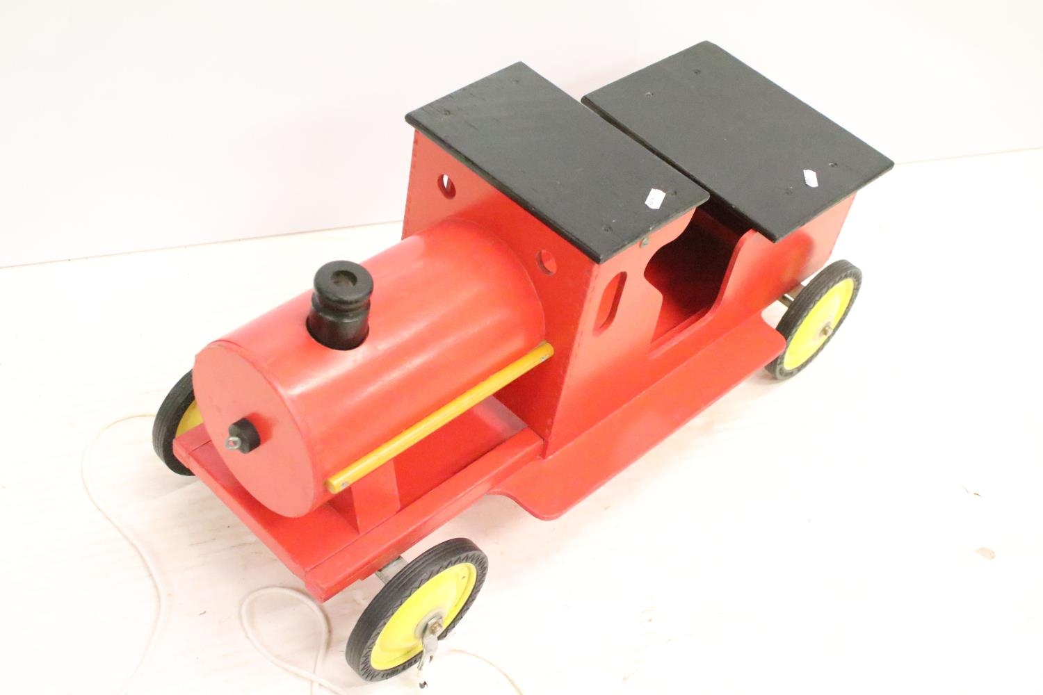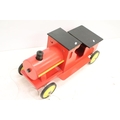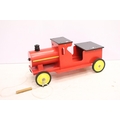 Painted wooden model of a train, raised on four wheels with metal hubs, approx 73cm long
