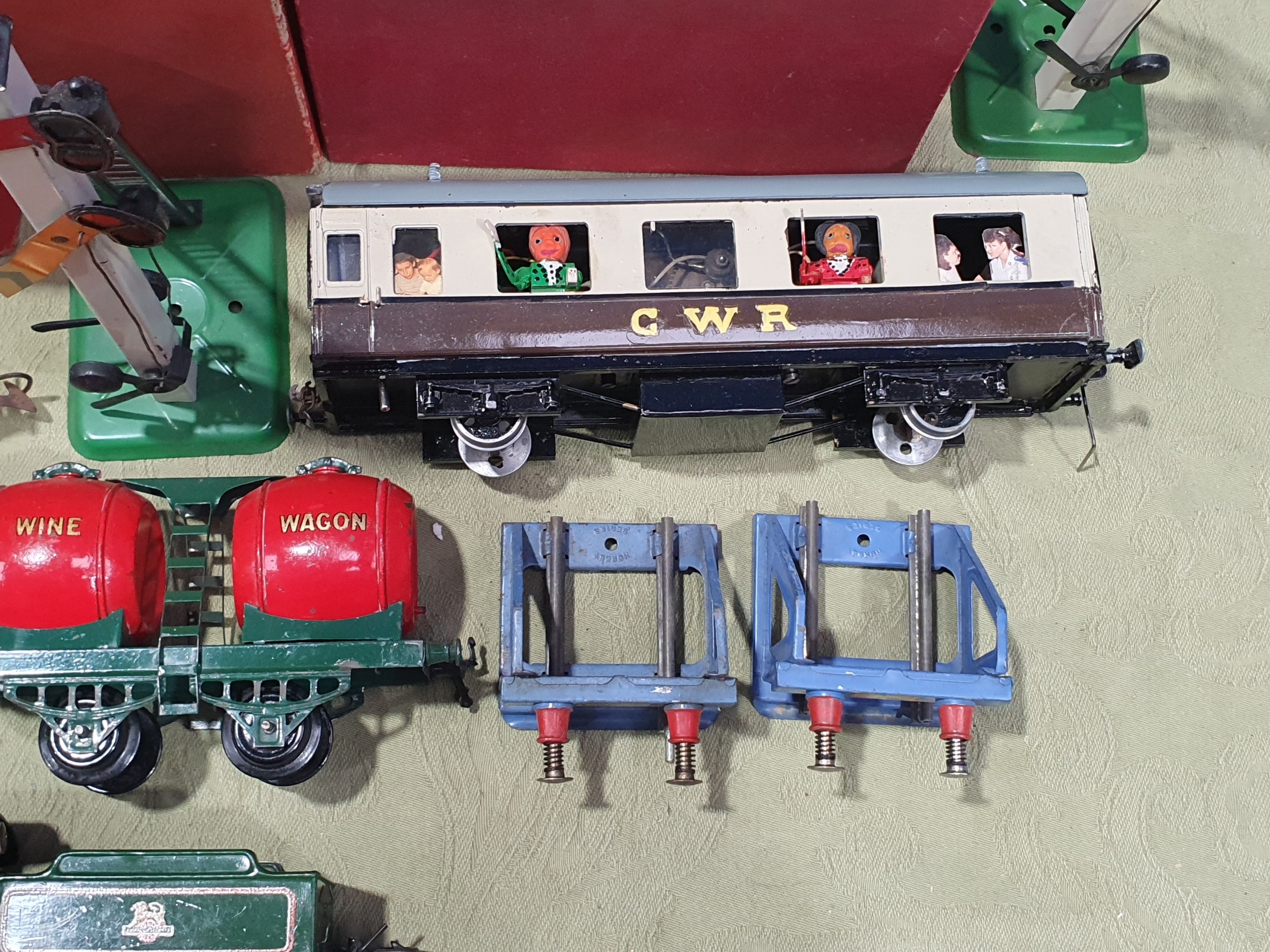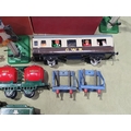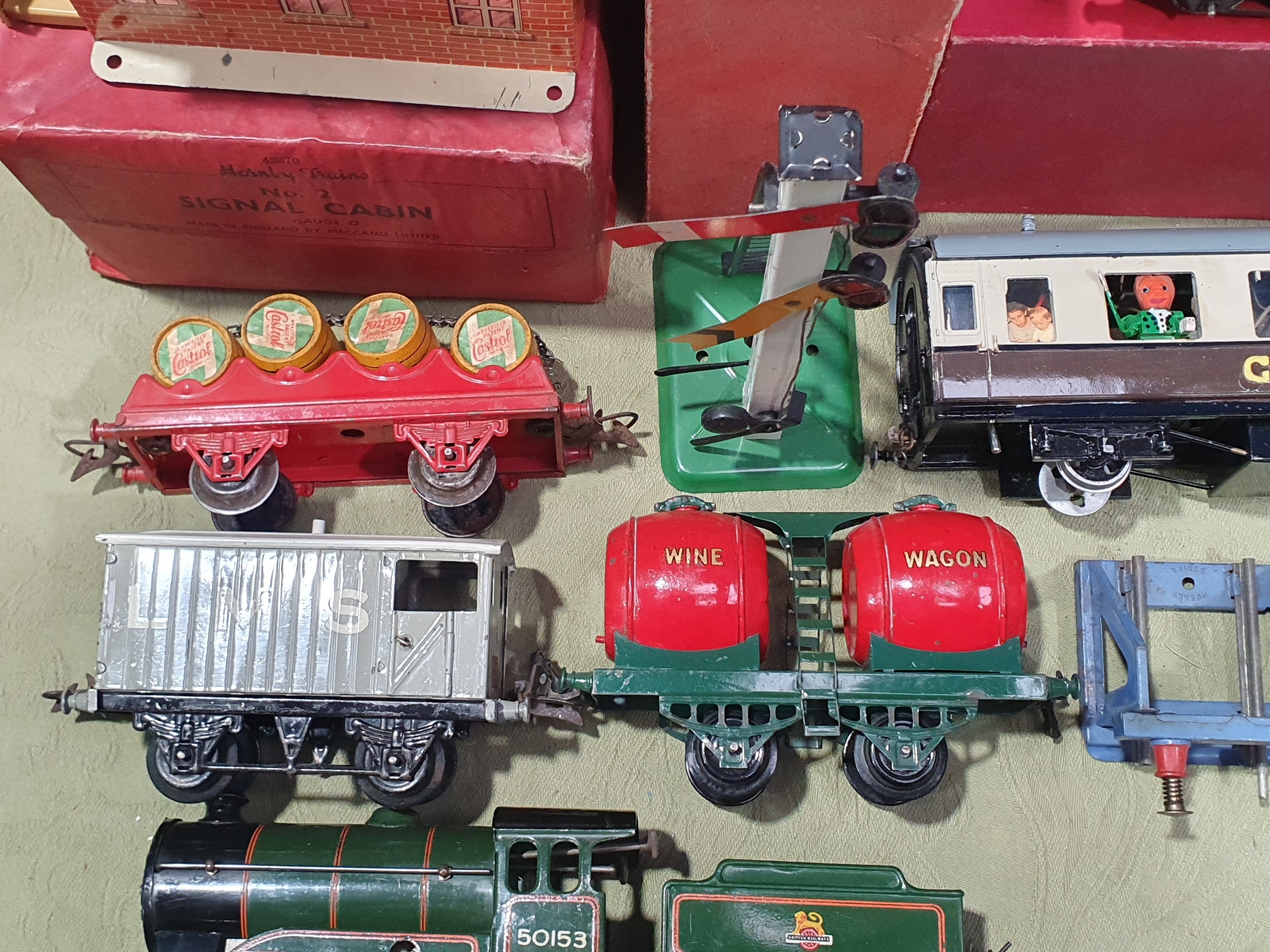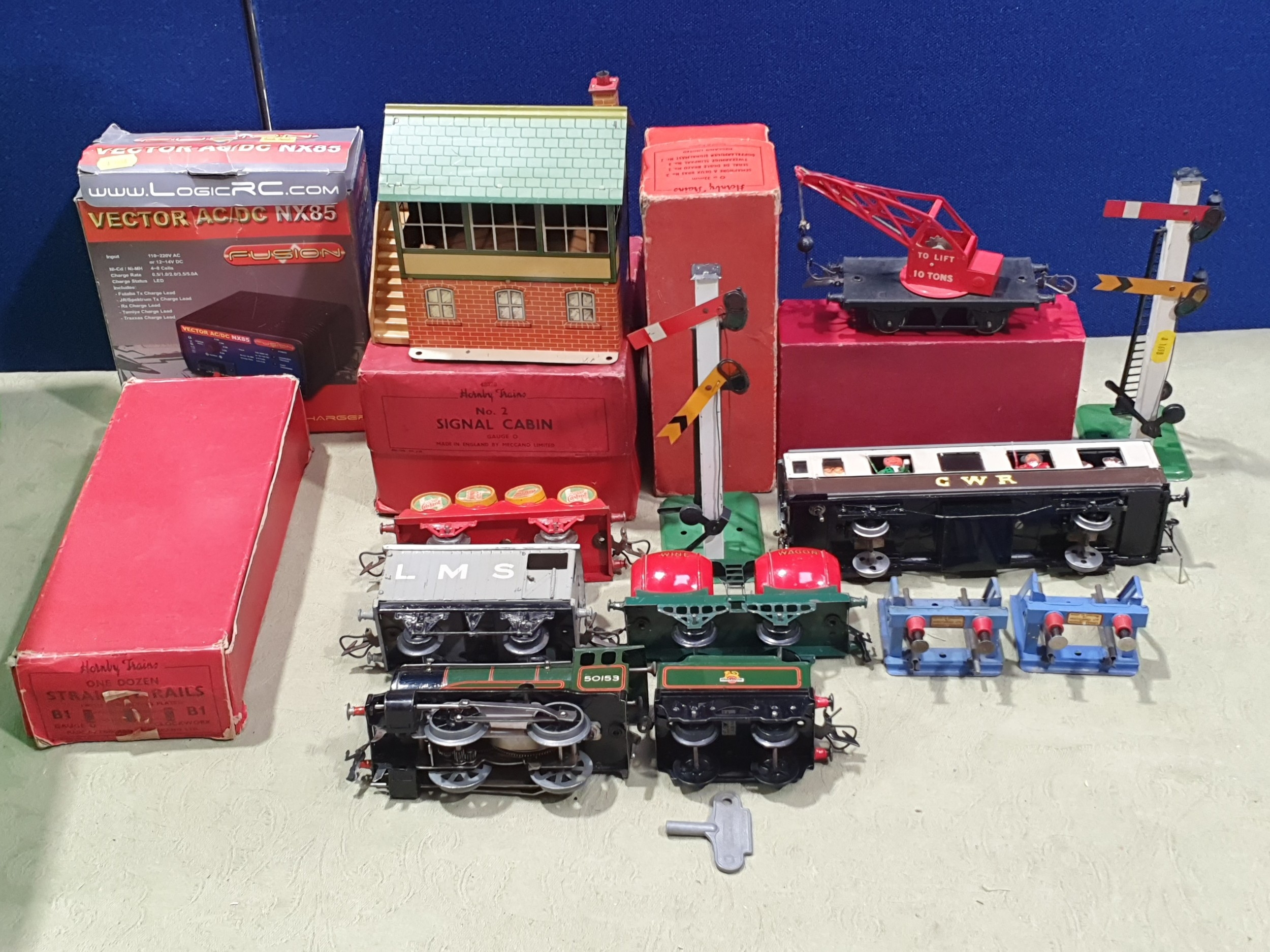A quantity of Hornby 0 gauge including a clockwork No.501 0-4-0 Locomotive and tender in BR green livery with key, Wine Wagon, Castrol Barrel Wagon, LMS Goods Brake Van, a boxed No.1 Crane Truck, a boxed No.2 Signal Cabin, boxed No.2 Double Arm Signal, unboxed Signal, a scratch built GWR Coach, a quantity of clockwork and 3-rail electric Track and a Battery Charger