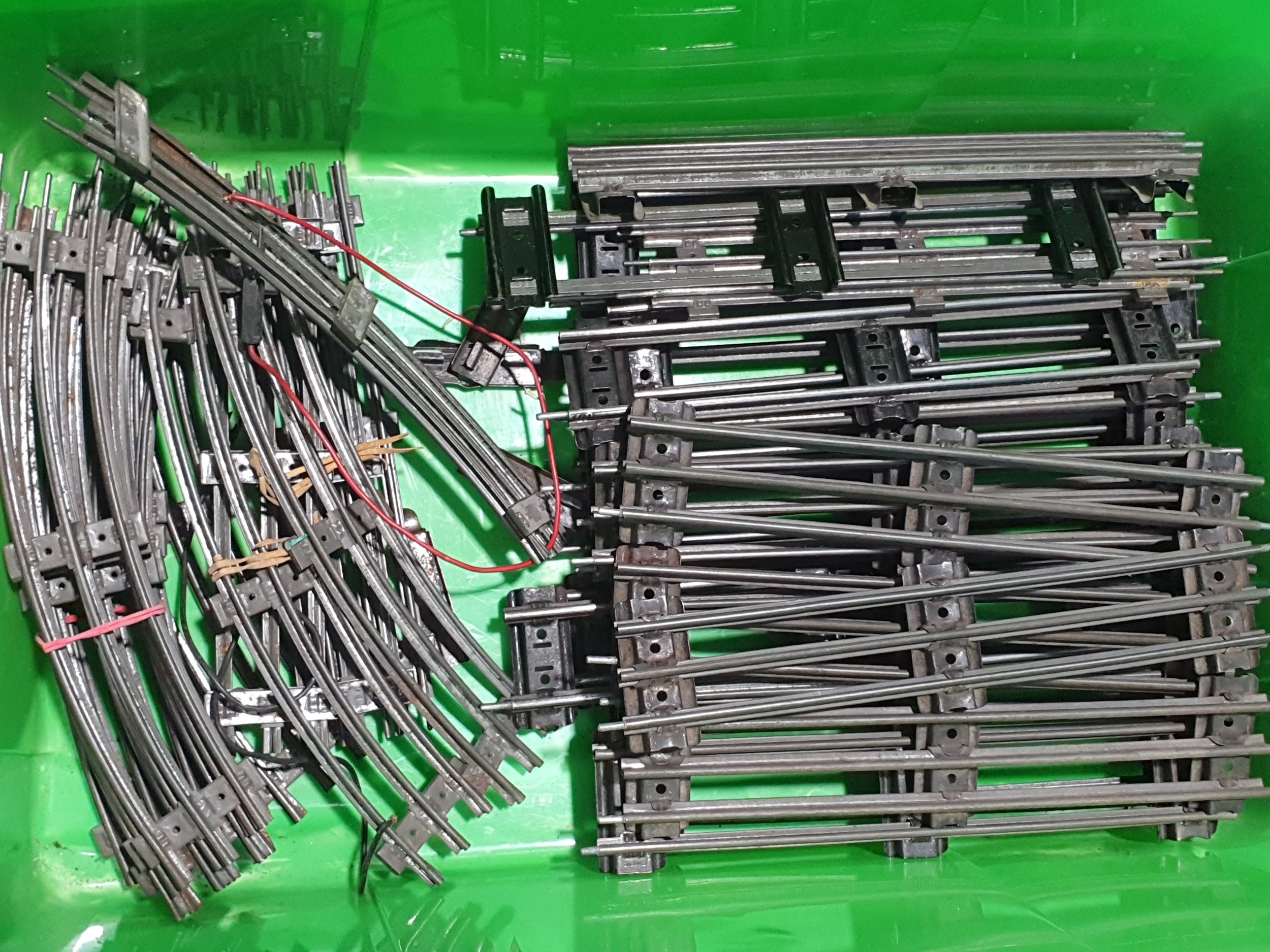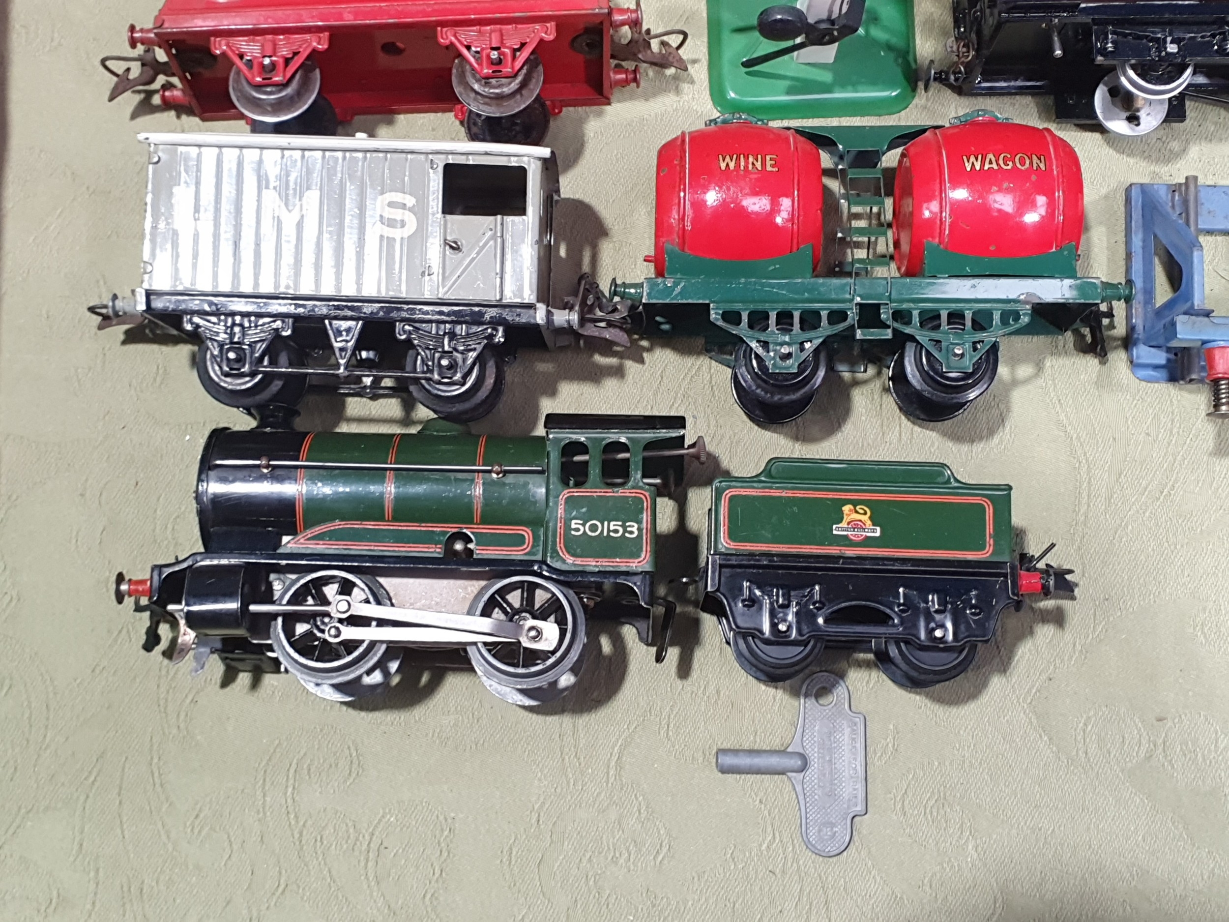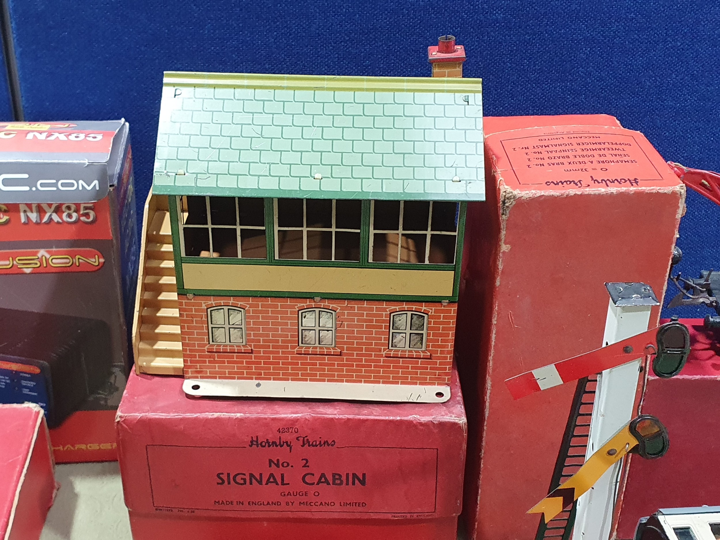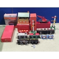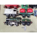 A quantity of Hornby 0 gauge including a clockwork No.501 0-4-0 Locomotive and tender in BR green livery with key, Wine Wagon, Castrol Barrel Wagon, LMS Goods Brake Van, a boxed No.1 Crane Truck, a boxed No.2 Signal Cabin, boxed No.2 Double Arm Signal, unboxed Signal, a scratch built GWR Coach, a quantity of clockwork and 3-rail electric Track and a Battery Charger