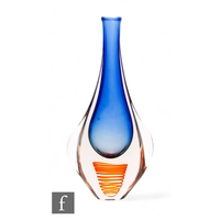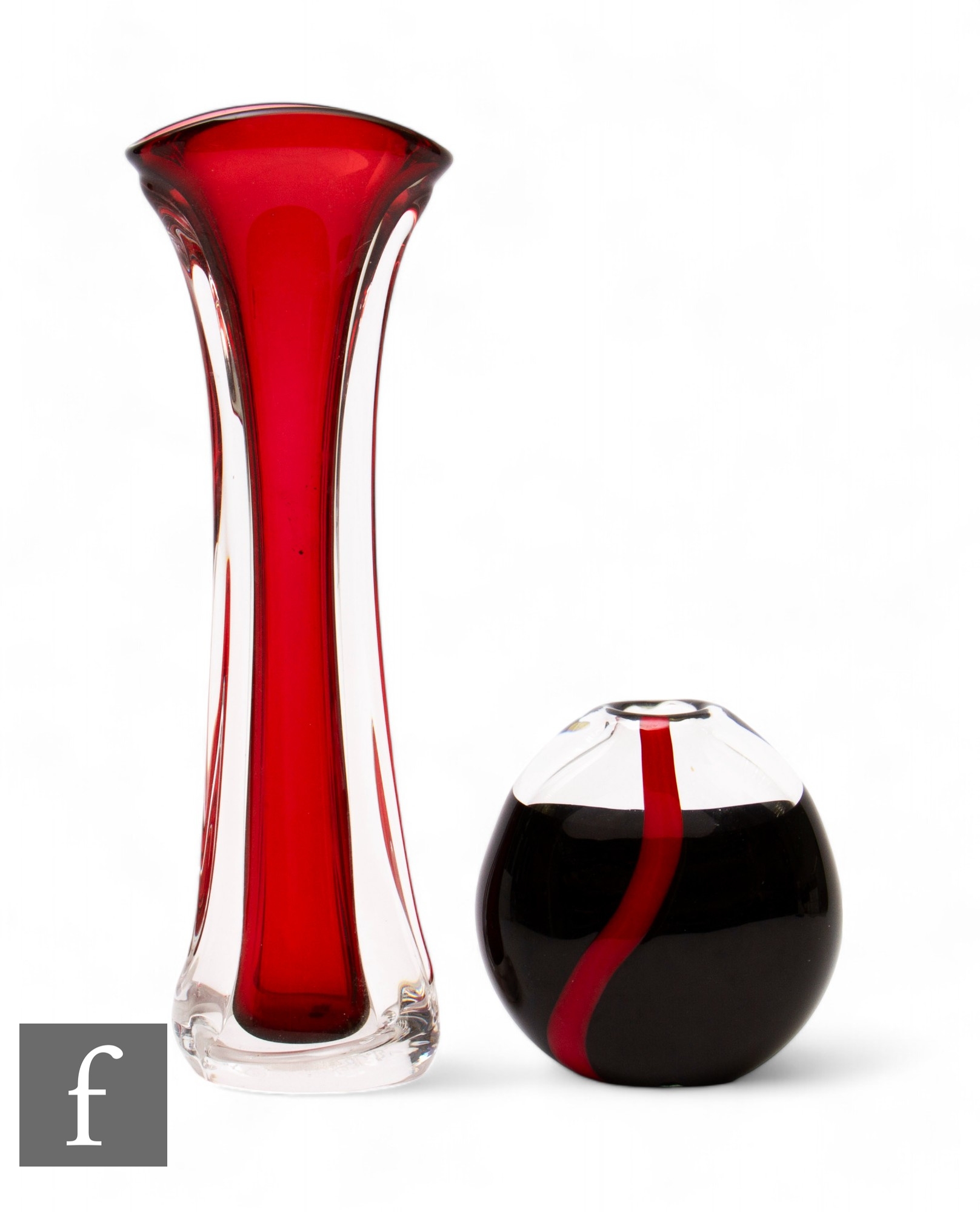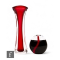 Peter Kuchinke - Seguso - A contemporary Murano glass vase of compressed ovoid form, the black core cased in clear with a contrasting red stripe, engraved signature, height 14cm, together with a tall tapering vase by Matthew Buechner for Thames Glass with ruby core, engraved signature. (2)