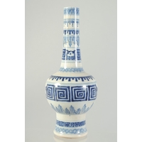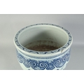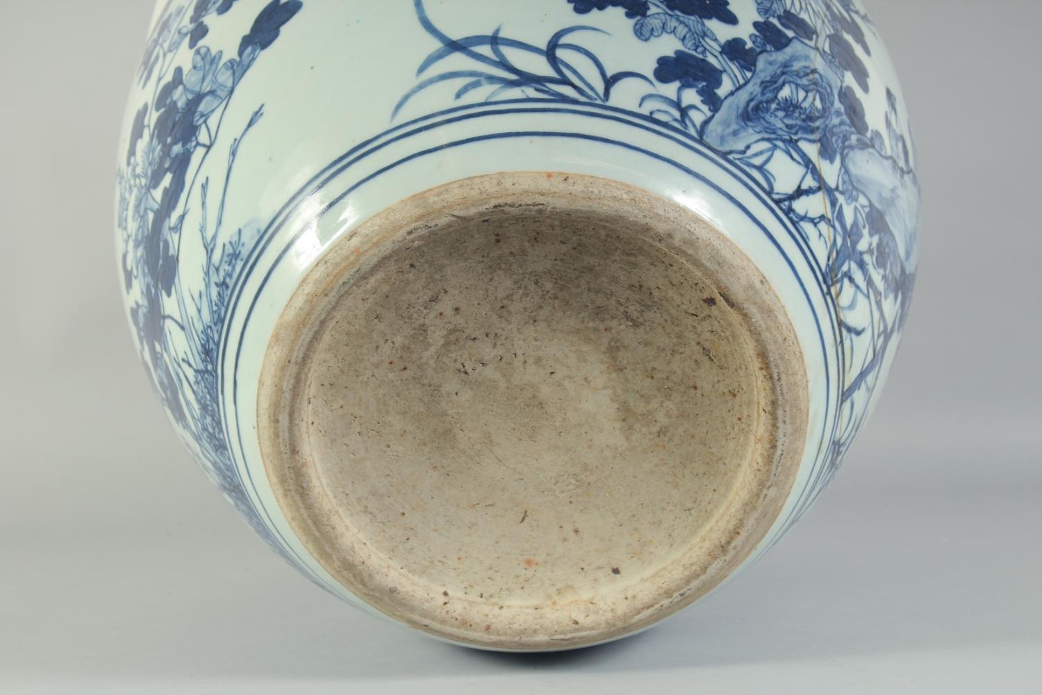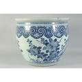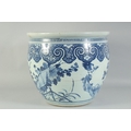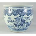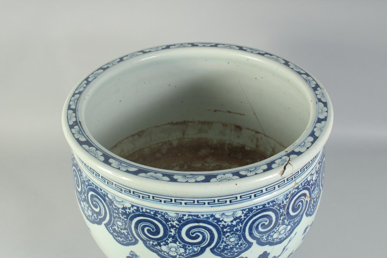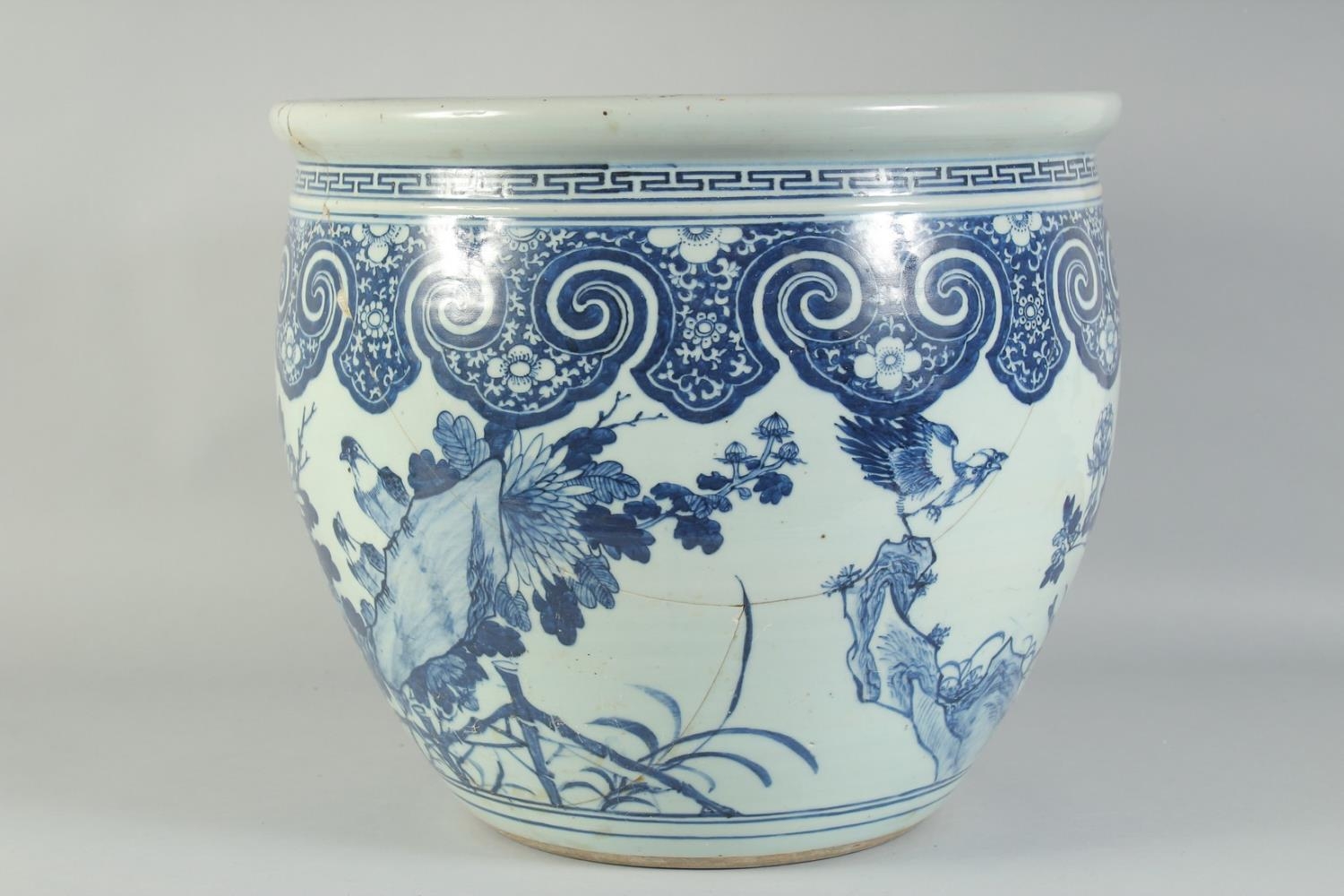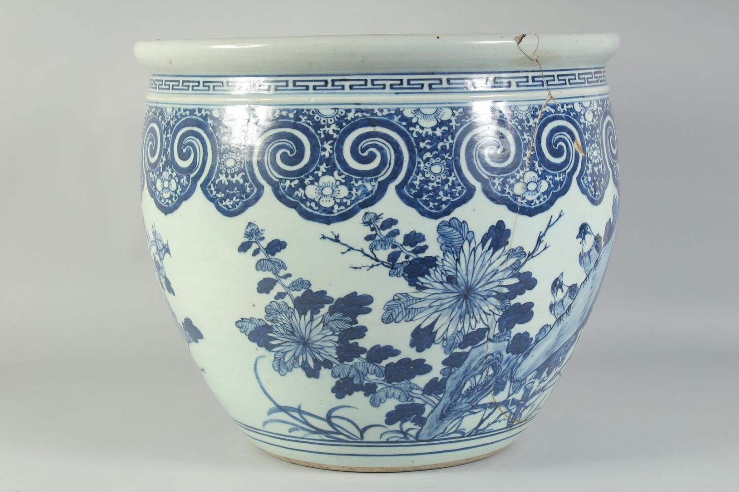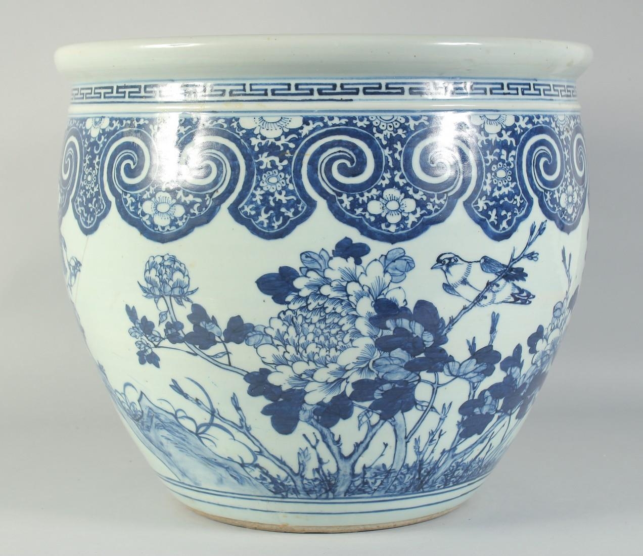A LARGE 19TH CENTURY CHINESE BLUE AND WHITE PORCELAIN JARDINIERE, painted with birds and flora, (af), 34.5cm x 40.5cm diameter.