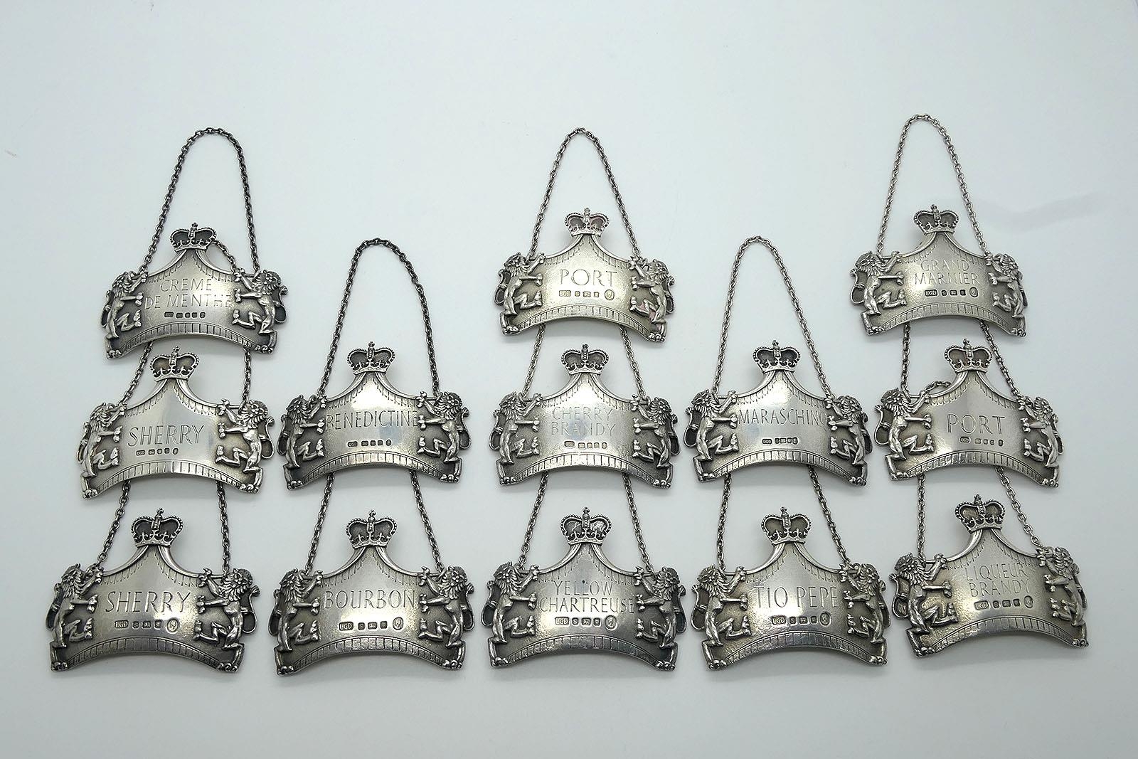 Leslie Durbin; A Collection of Thirteen Hallmarked Silver Commemorative Coronation Decanter Labels, LGD, London 1953, comprising "Yellow Chartreuse", "Tio Pepe", "Cherry Brandy", "Benedictine", "Bourbon", "Liqueur Brandy", "Maraschino", "Grand Marnier", "Creme De Menthe", "Sherry" (2), "Port" (2), each on chain suspension (overall weight 400grams). (13)