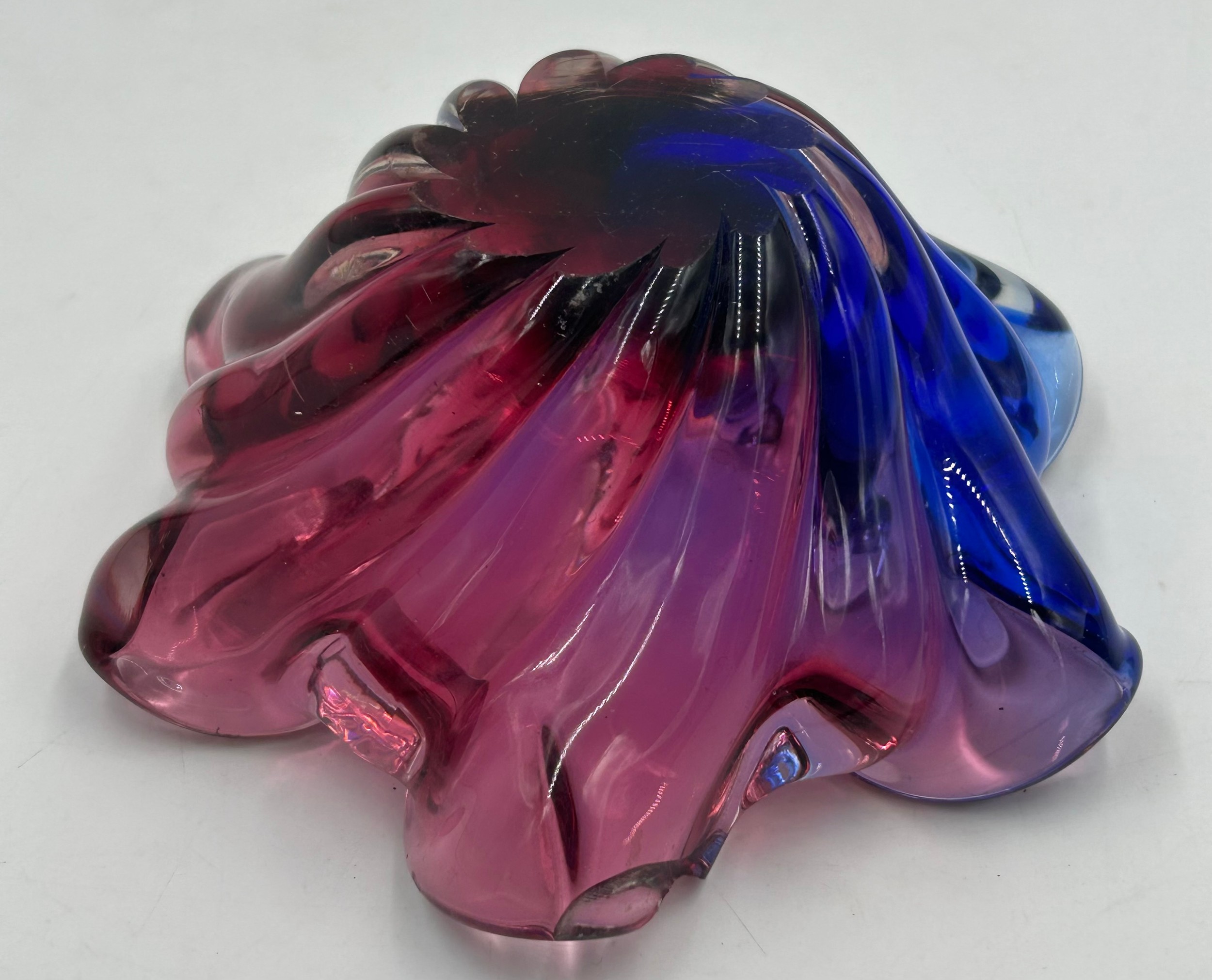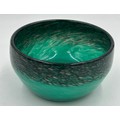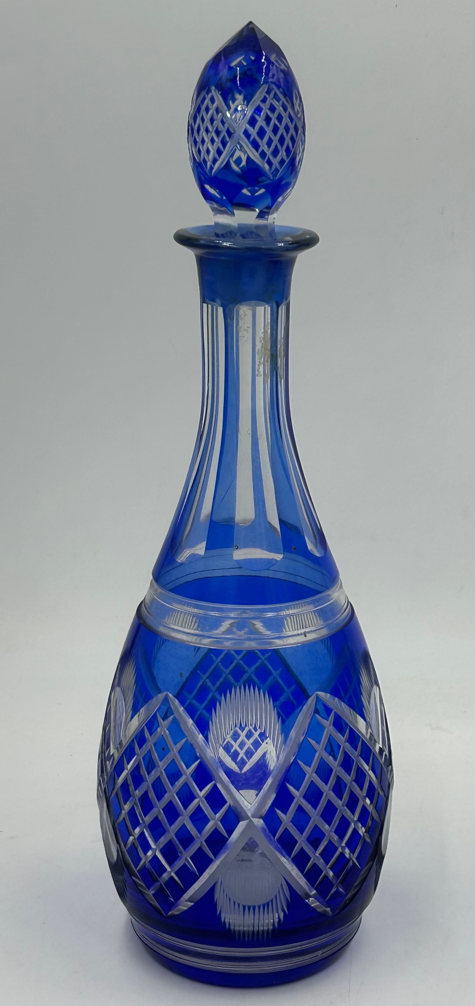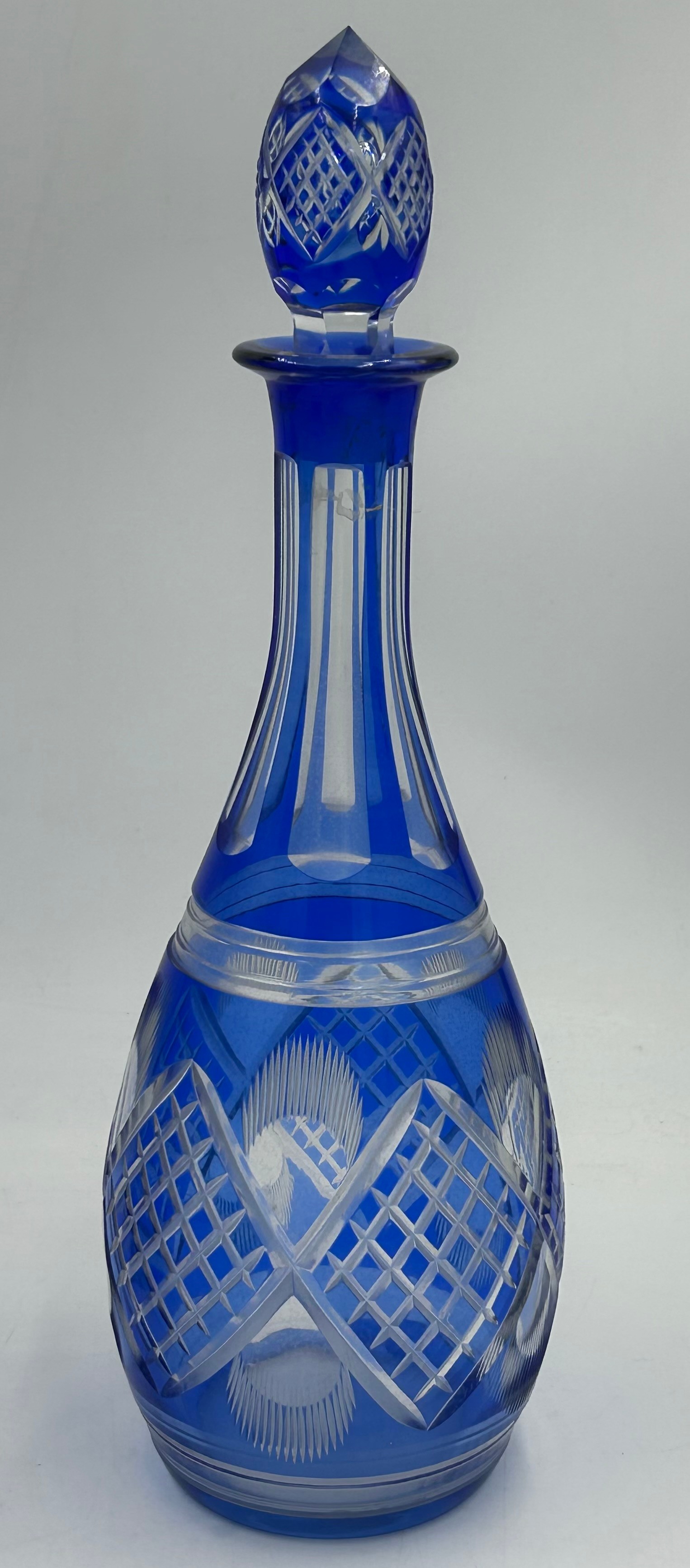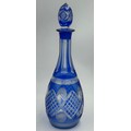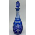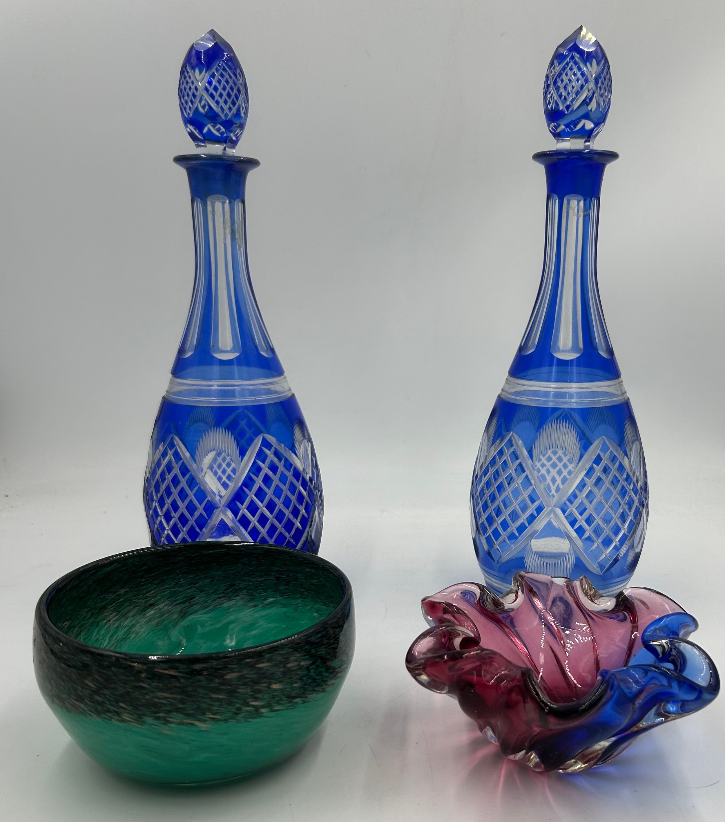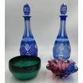 Glass ware to include a Strathearn 1960's green and gold fleck bowl with impressed leaping salmon mark to base, 14.5cm d, a pair of Bohemian blue overlaid crystal decanters with stoppers 35cms h and a heavy vintage dish with fluted sides. (4).