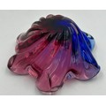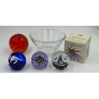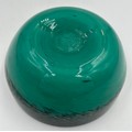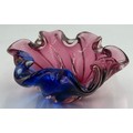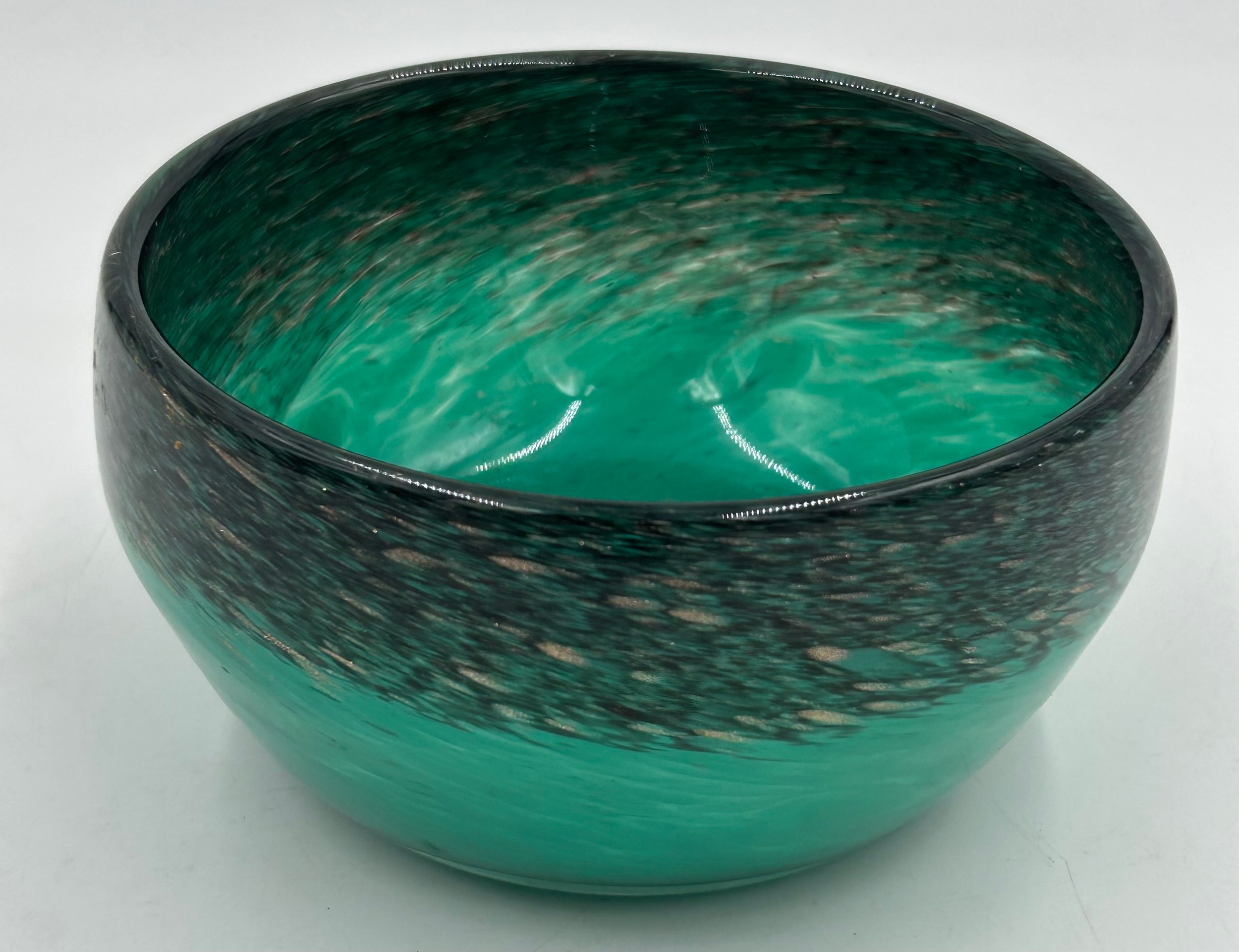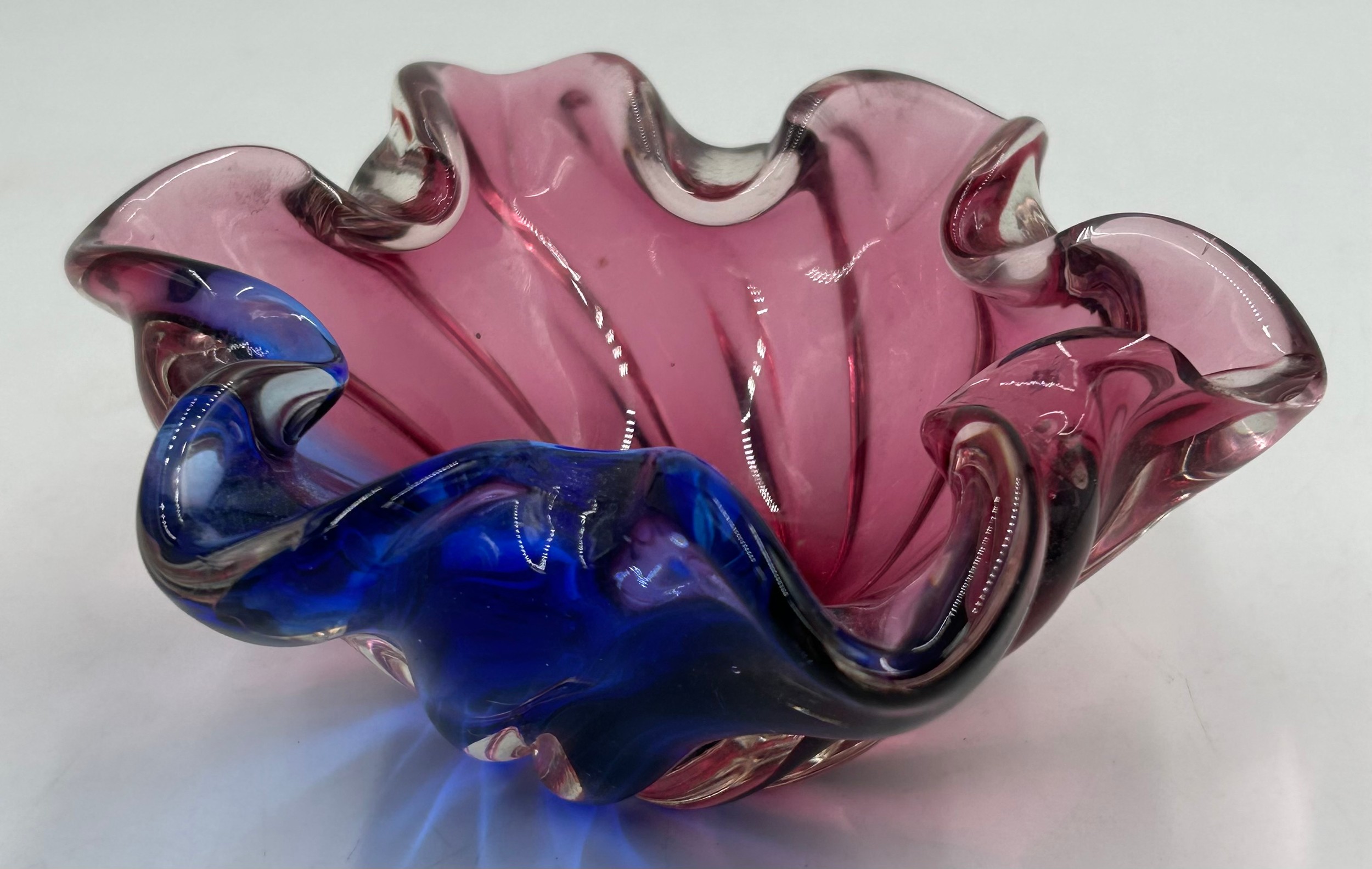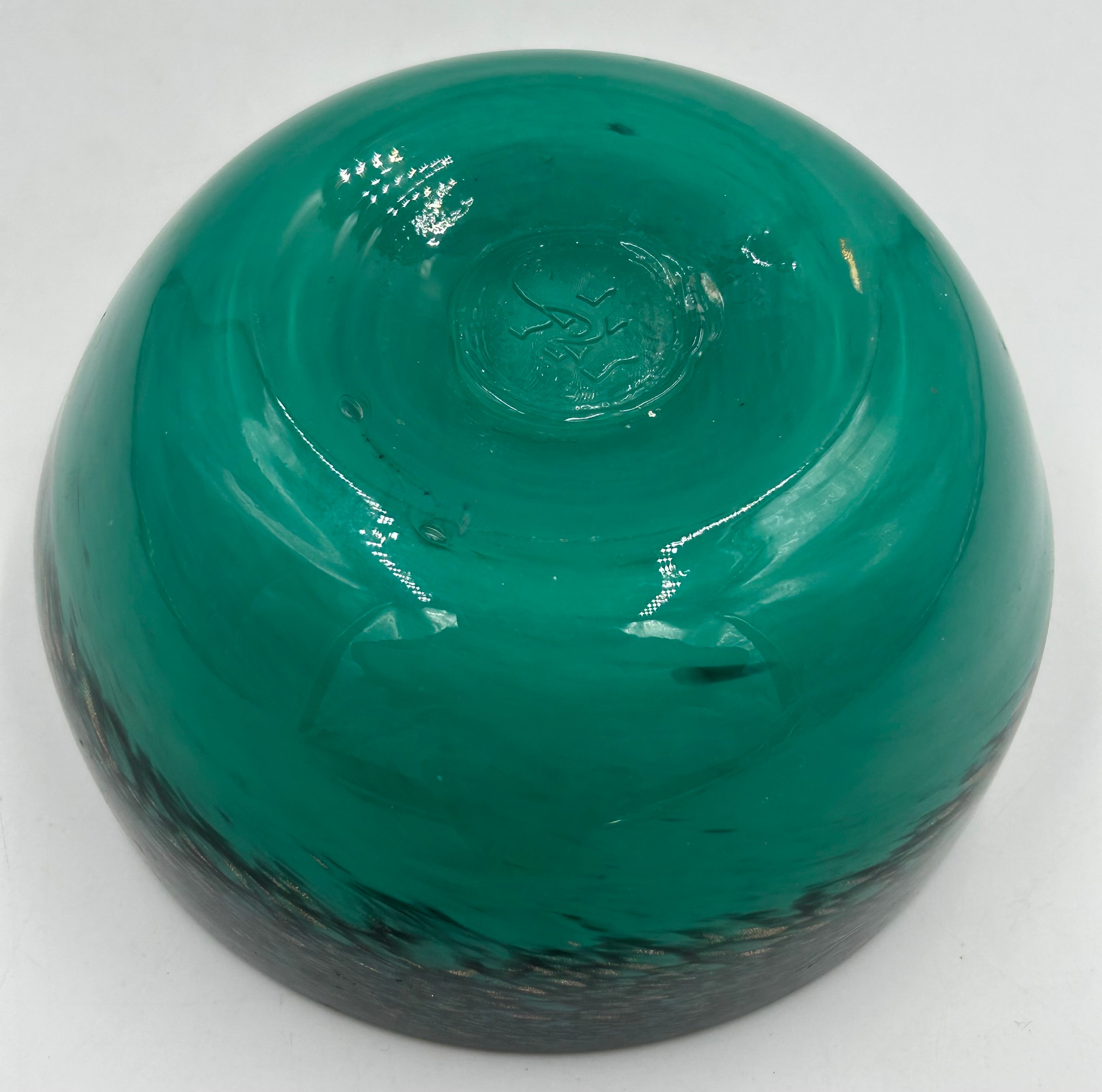 Glass ware to include a Strathearn 1960's green and gold fleck bowl with impressed leaping salmon mark to base, 14.5cm d, a pair of Bohemian blue overlaid crystal decanters with stoppers 35cms h and a heavy vintage dish with fluted sides. (4).