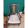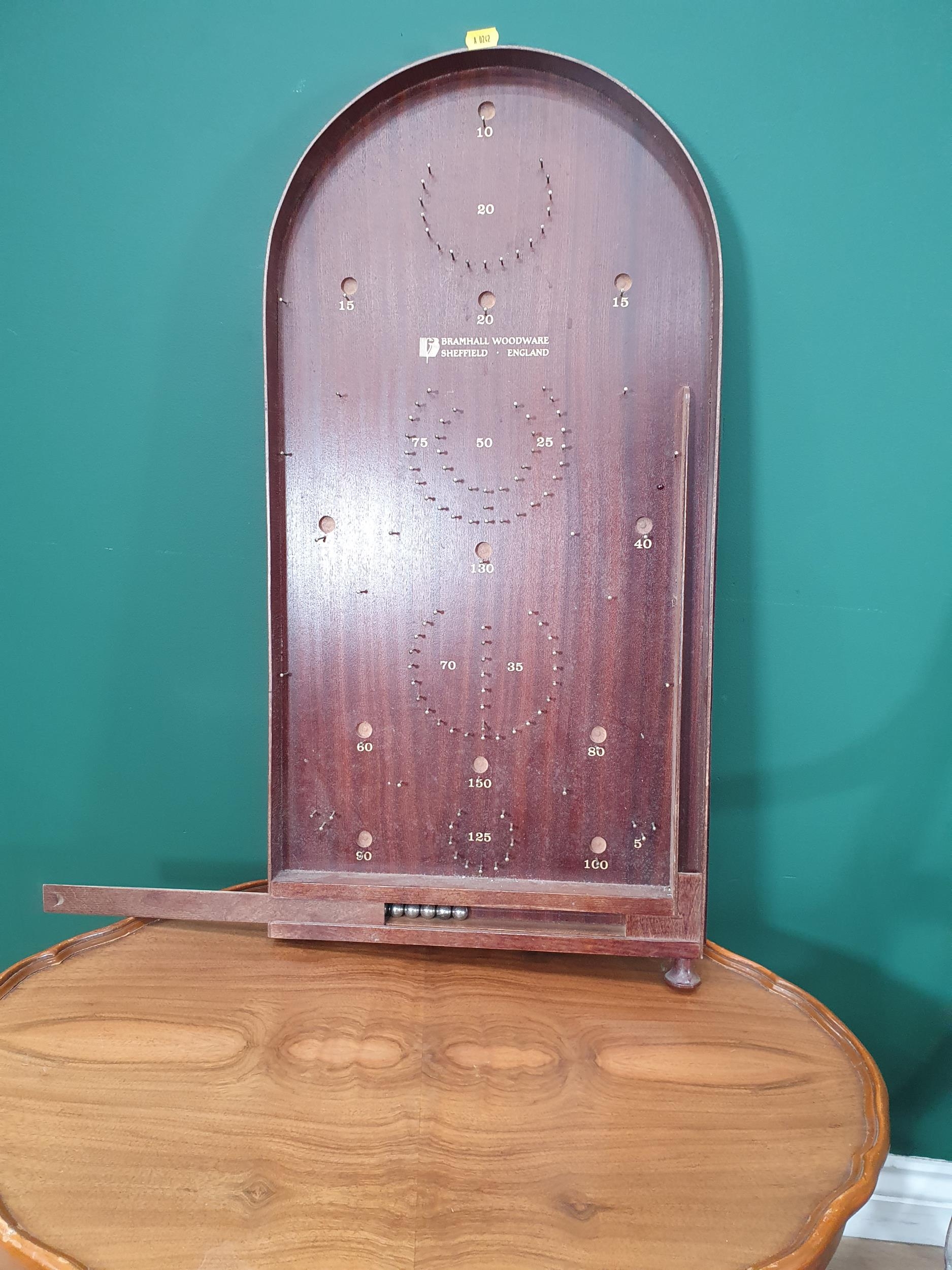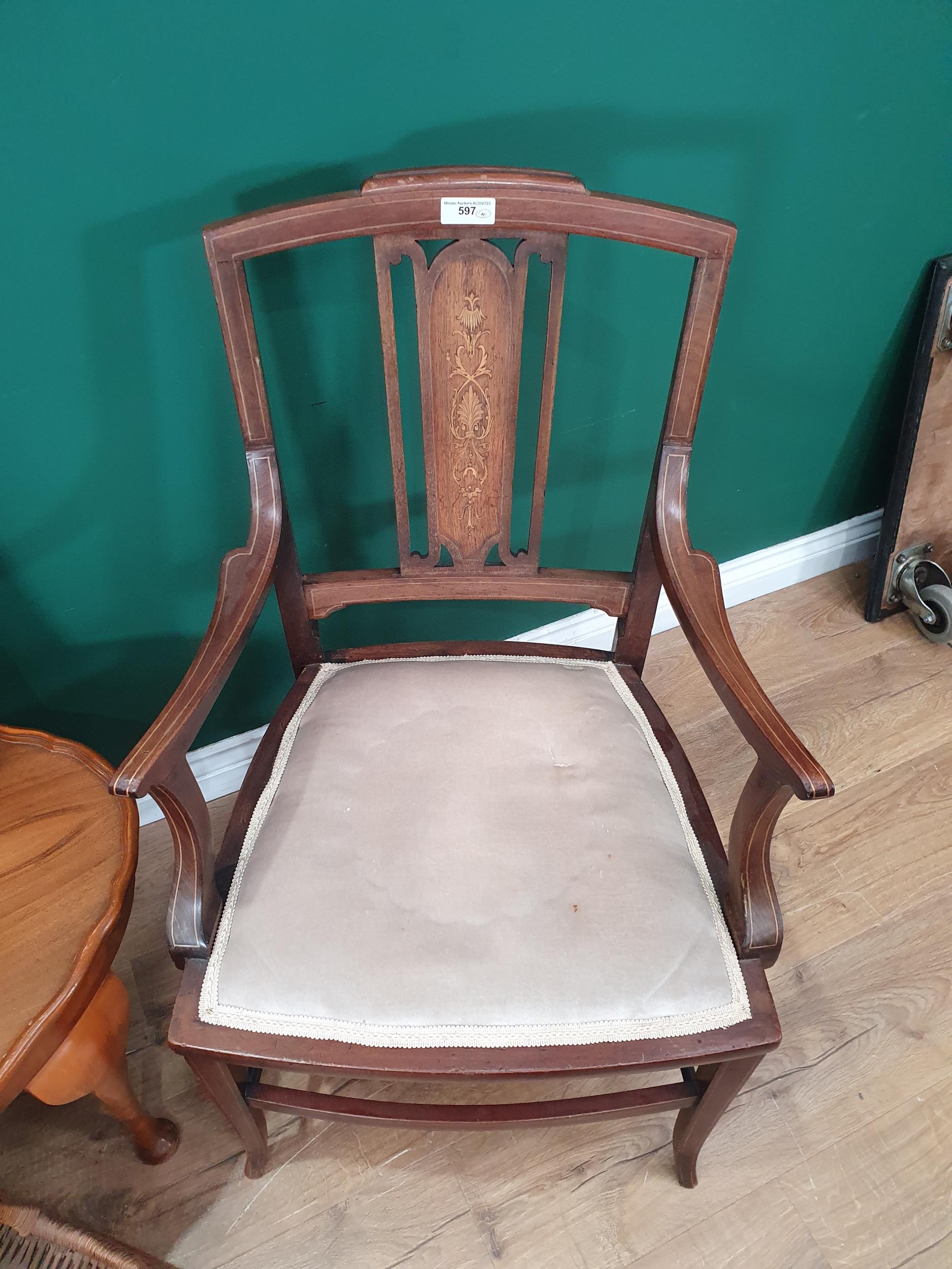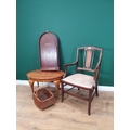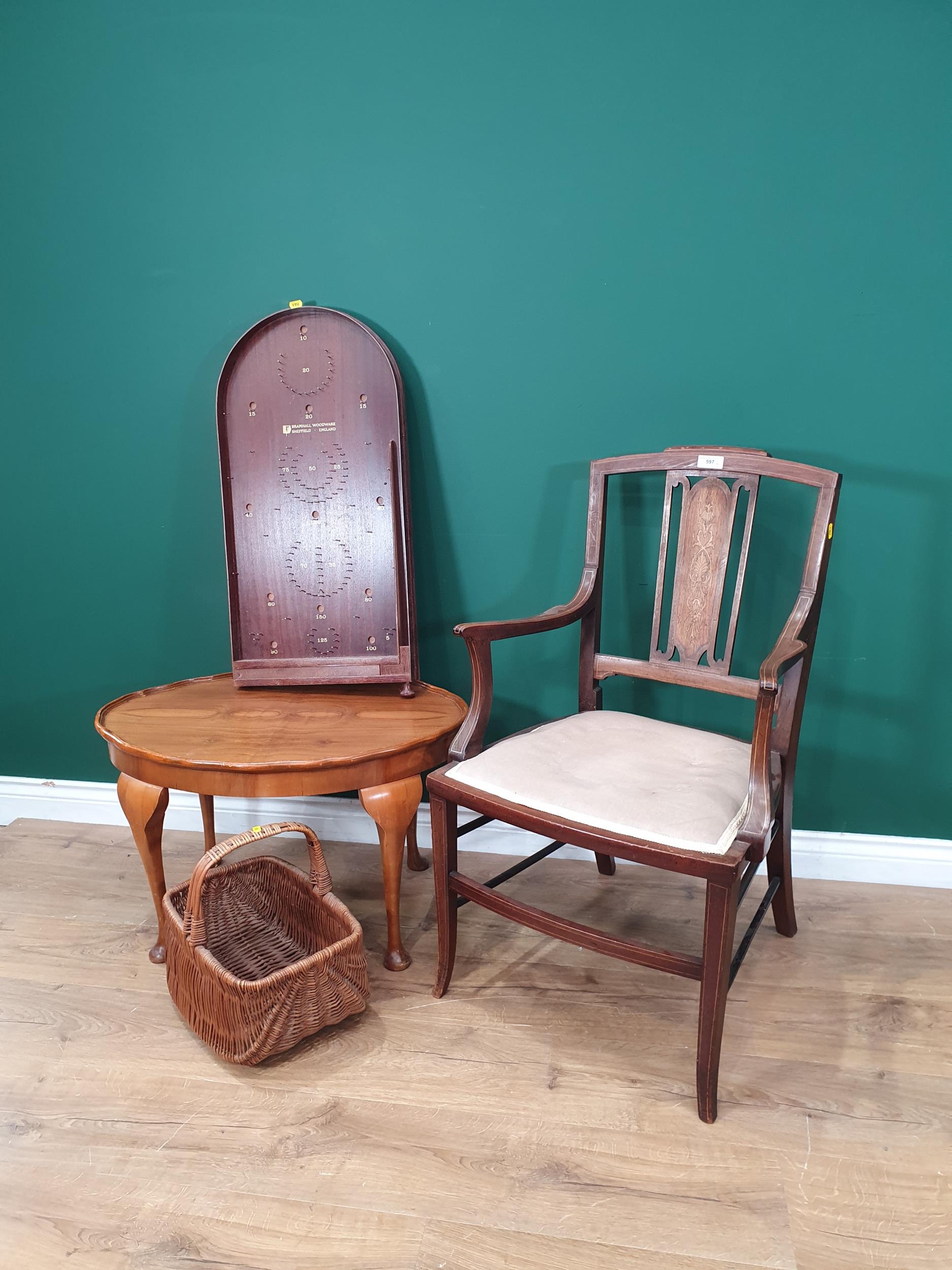A mahogany and inlaid upholstered Elbow Chair, Table Top Pinball, a wicker Basket and a Coffee Table.