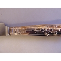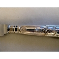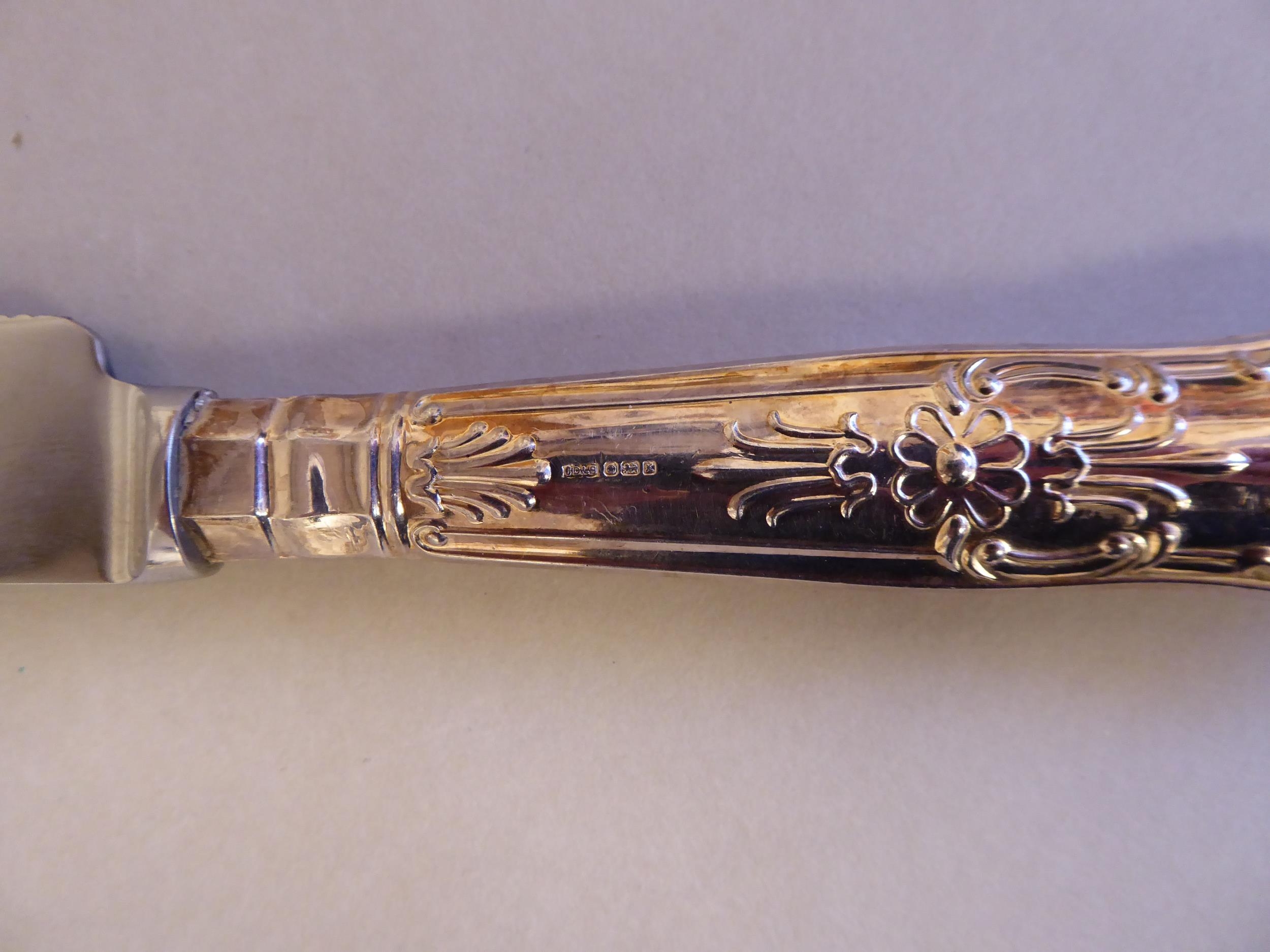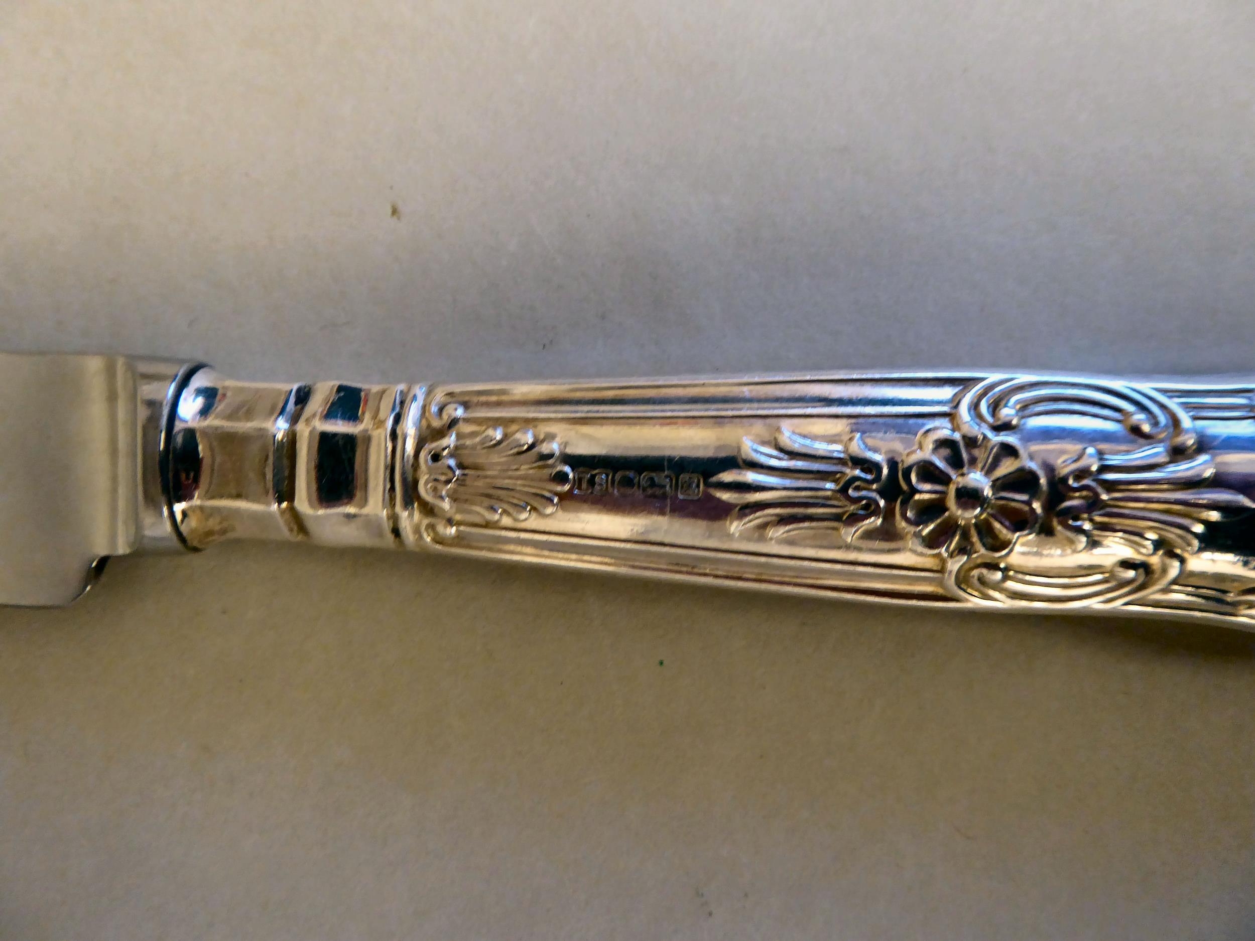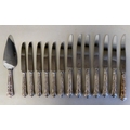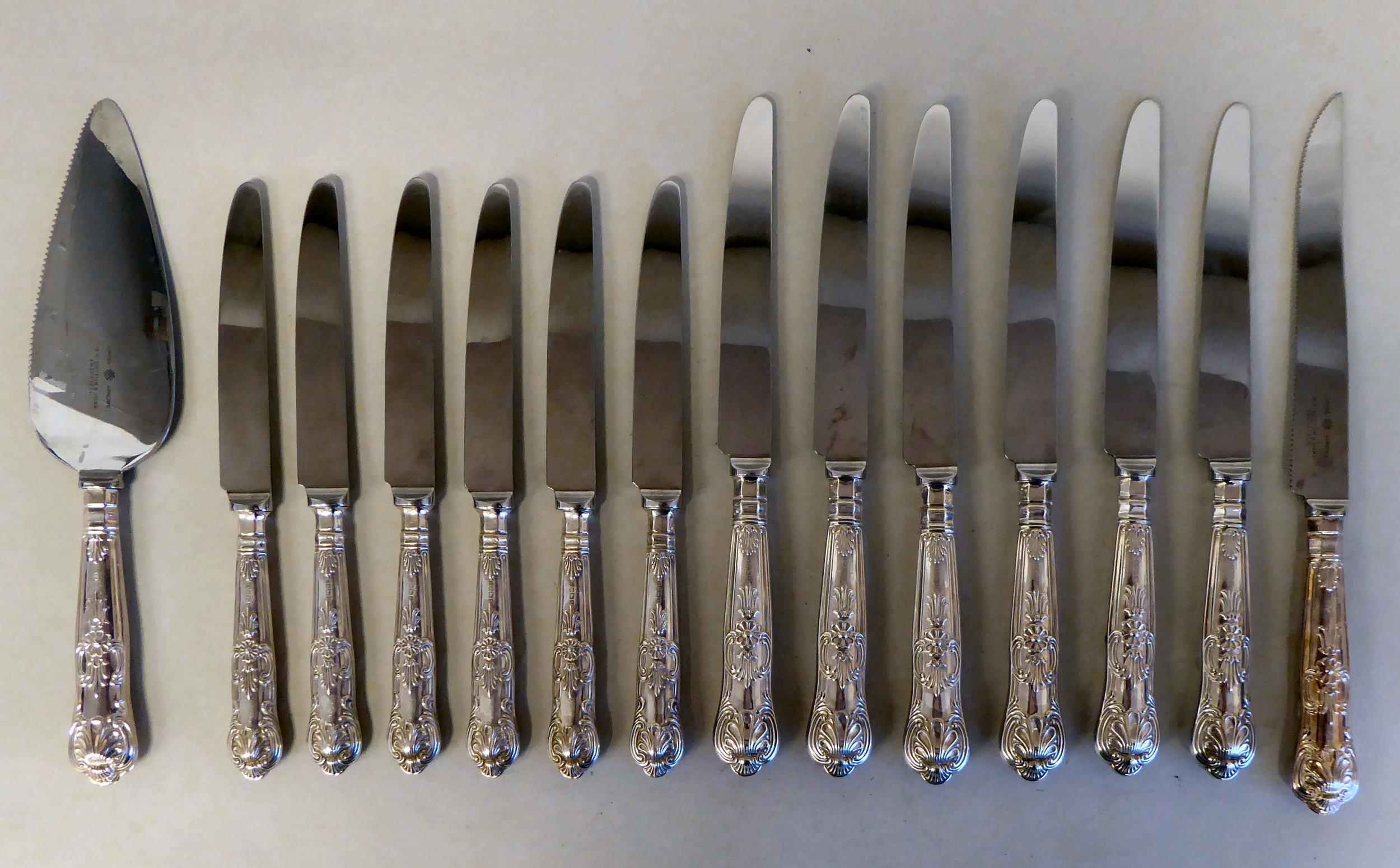 A set of six stainless steel Queens pattern dinner knives, on loaded silver handles; a matching set of dessert knives; a carving knife; and a cake slice Sheffield 1997
