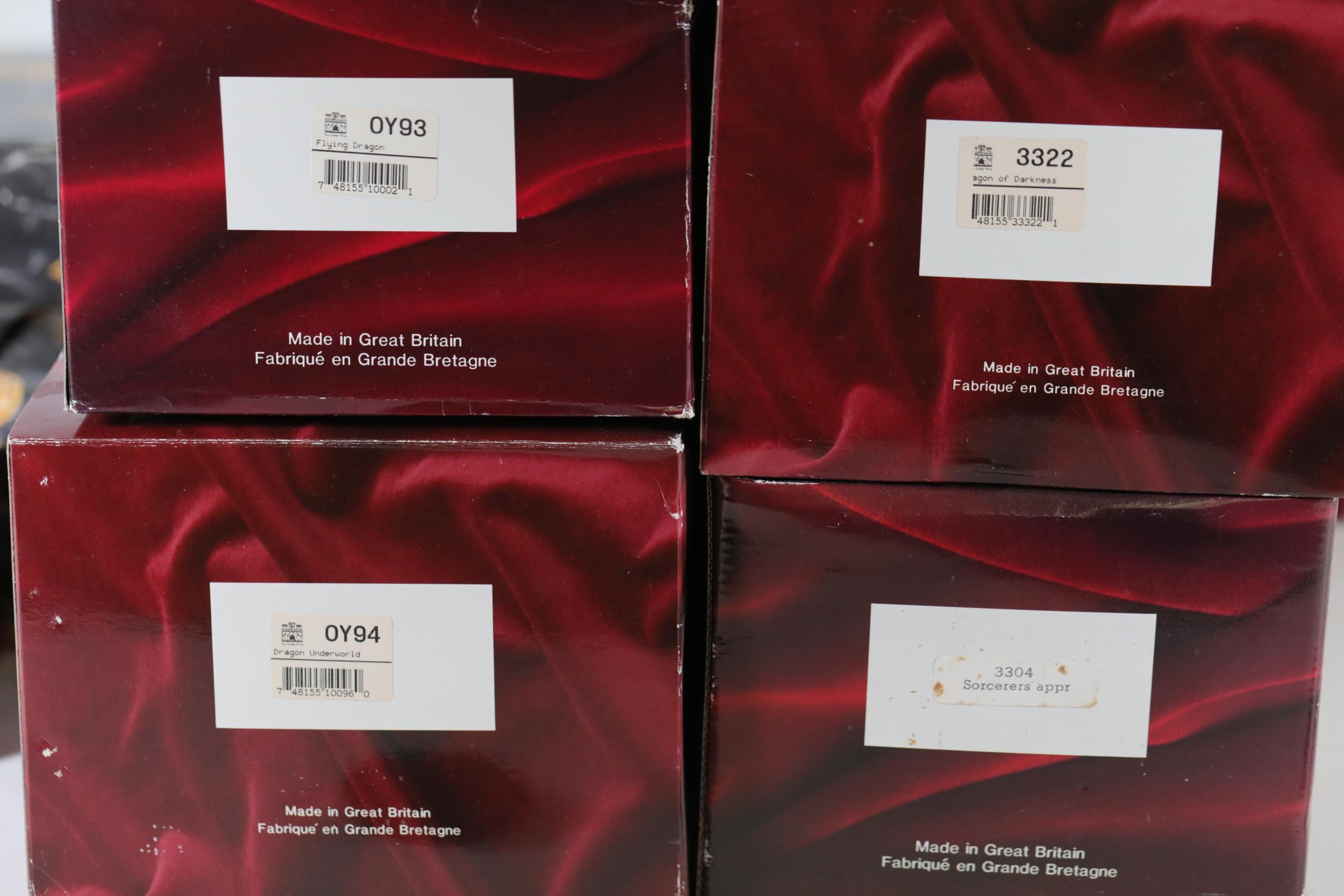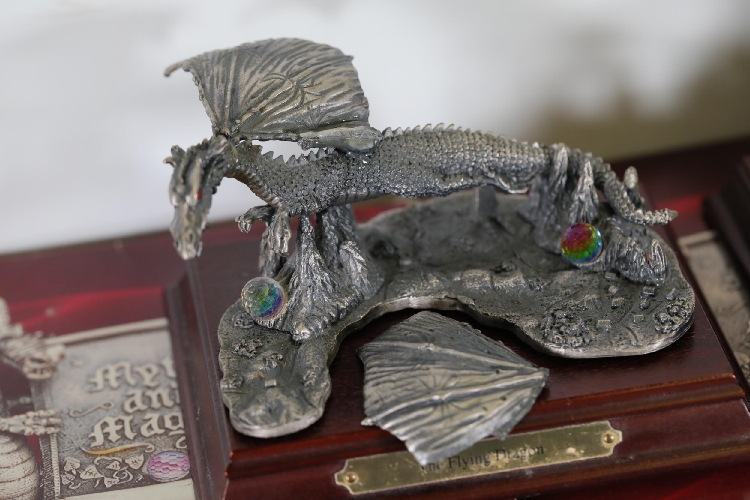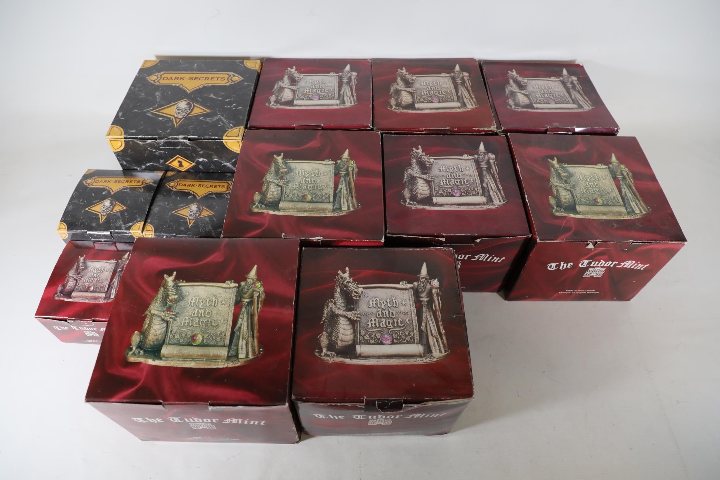 Collection of 12 Tudor Mint Boxed items: 9 Myth and Magic, 3 Dark Secrets, including "The Flying Dragon" with damaged wing (0Y93, 3322, OY94, 3304, 3321, 9003, 3302, 3320, 6219, 3081, 6222, 6201).