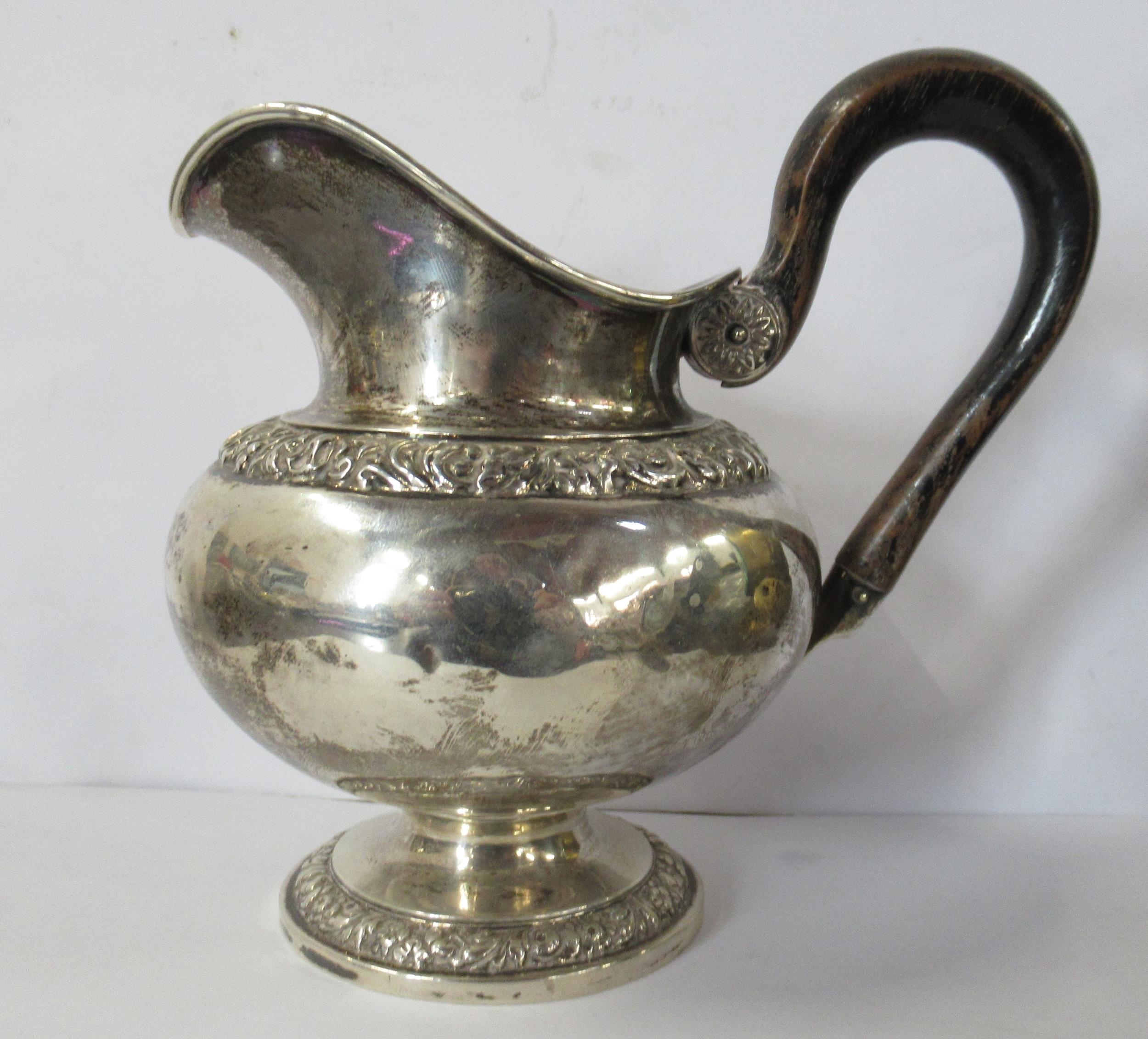 A silver jug, with embossed band of decoration and wooden handle, weight 6oz all in