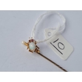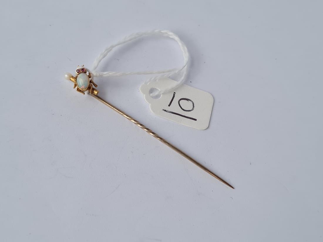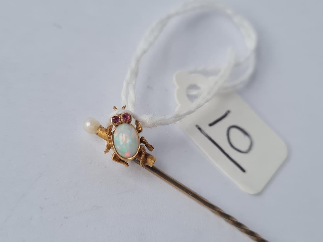 A Victorian opal set bug stick pin with ruby eyes in 15ct gold