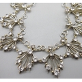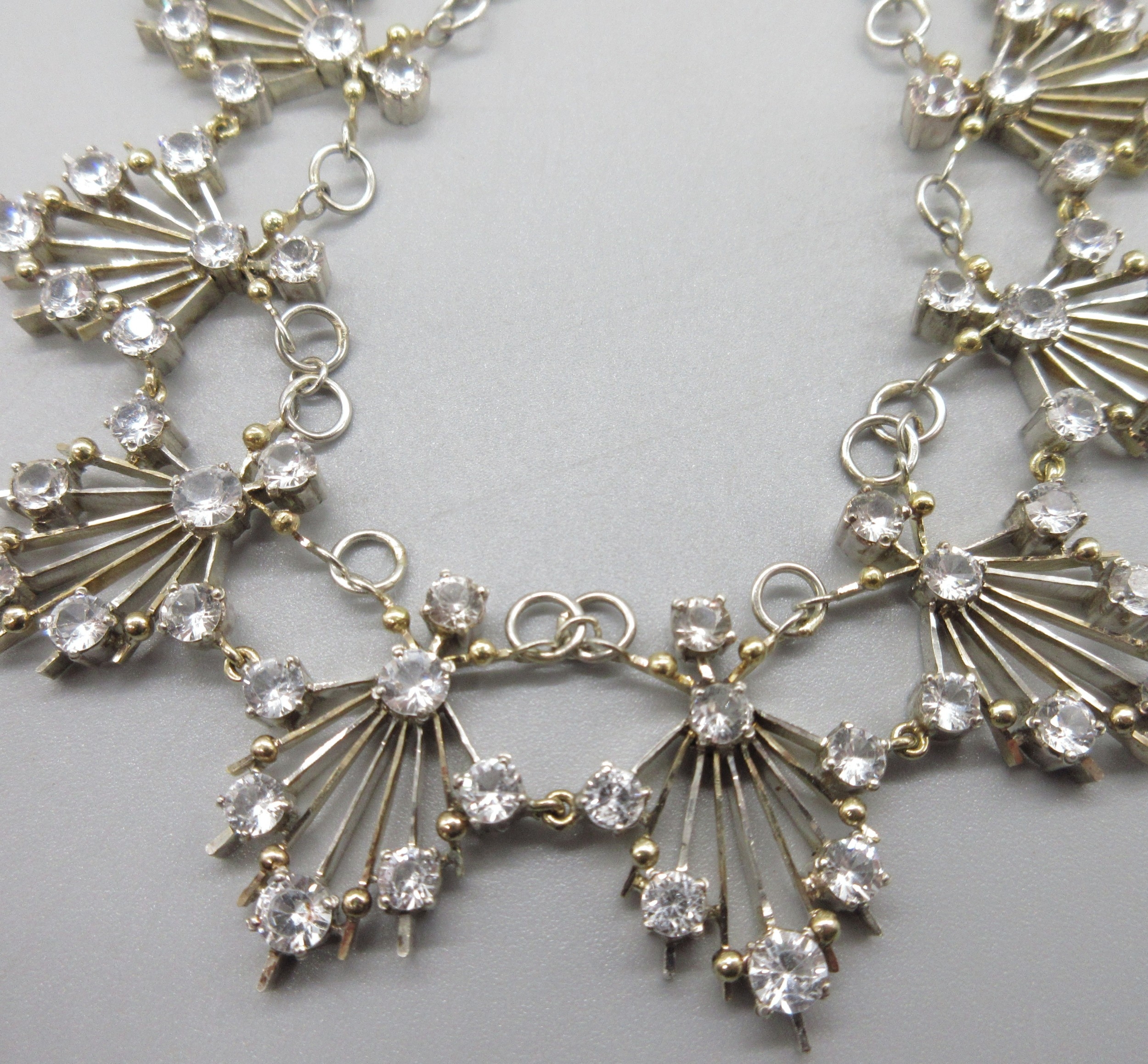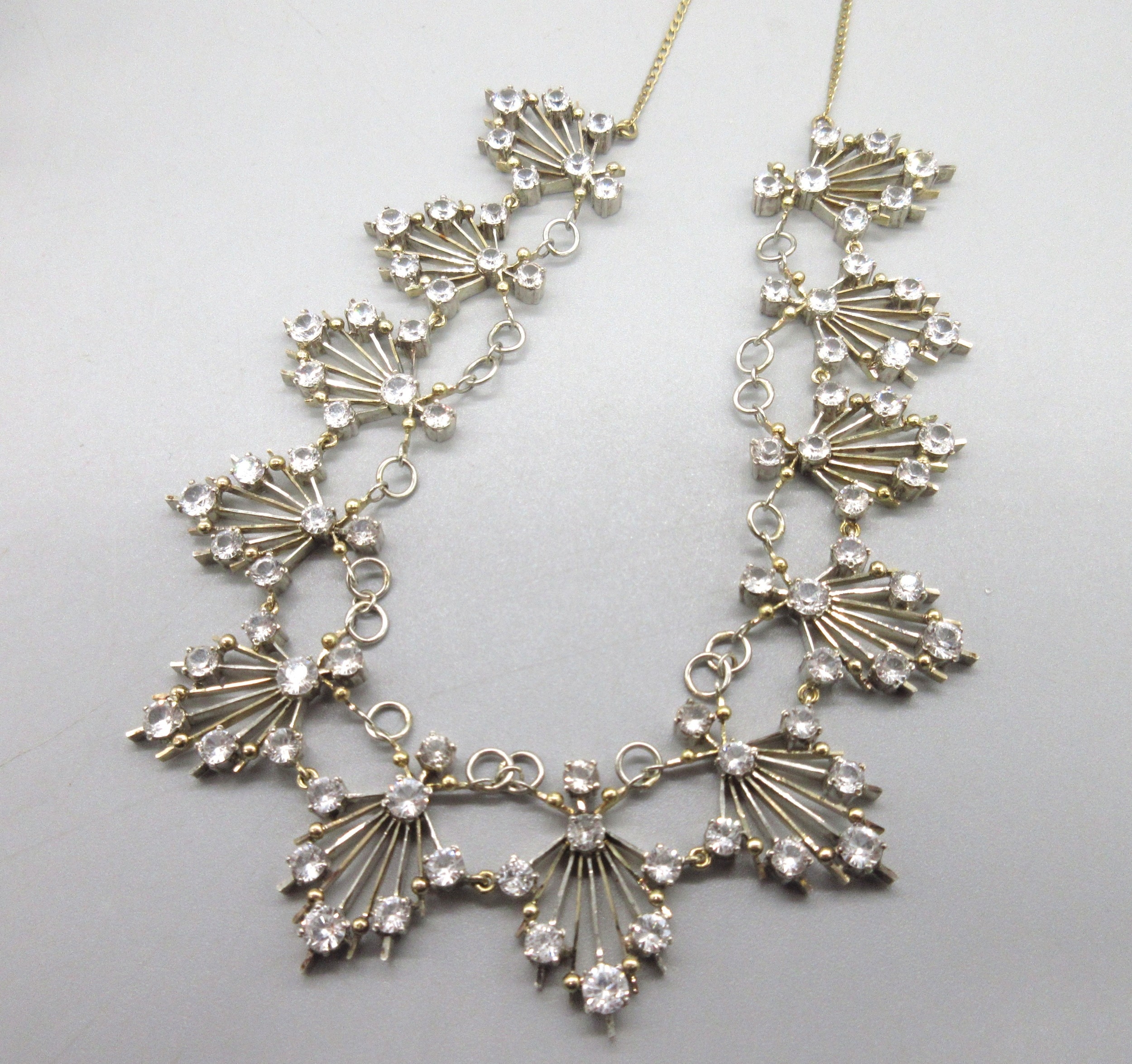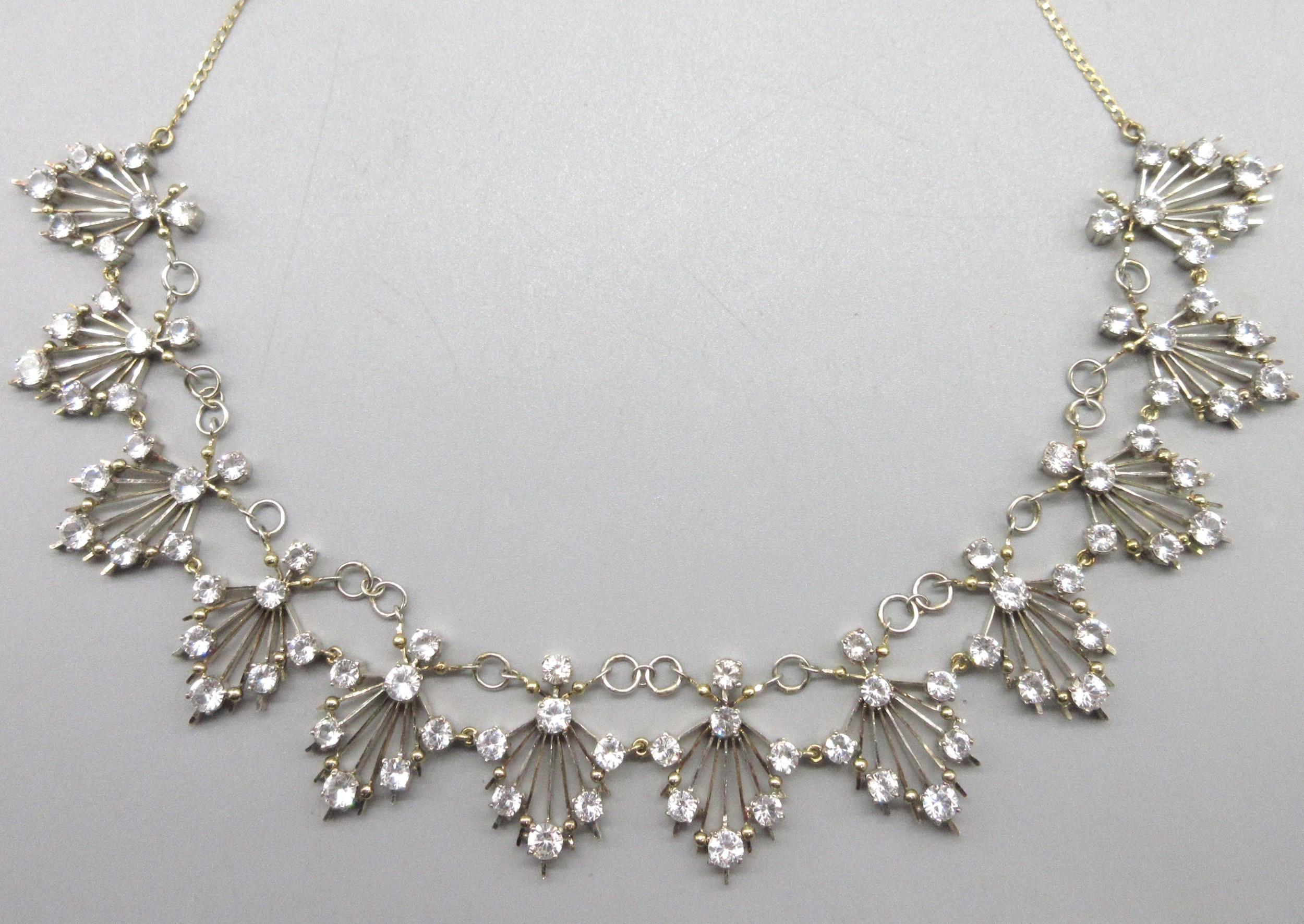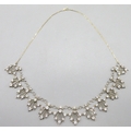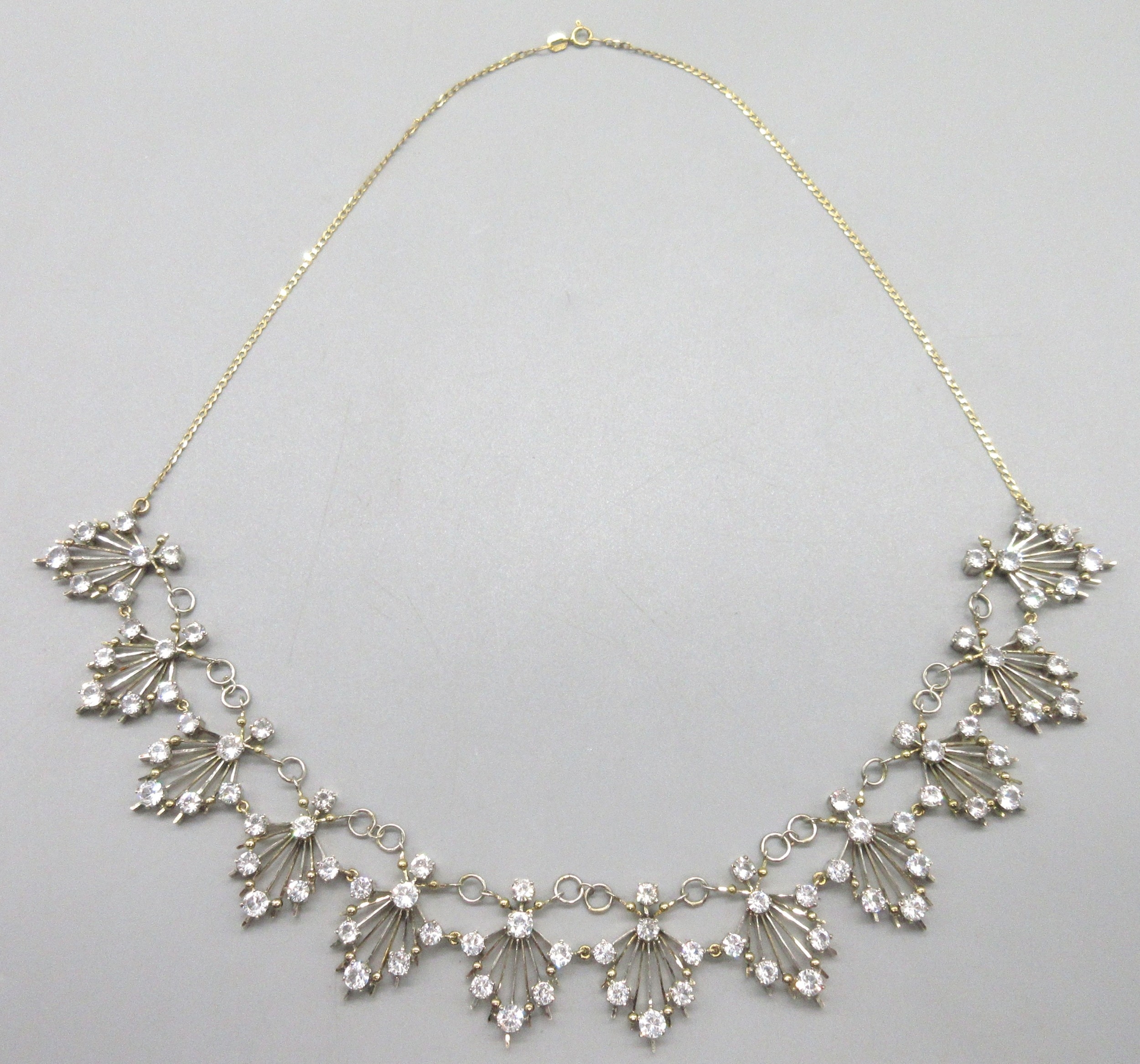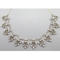 Art Deco style 9ct yellow gold diamond necklace, fringe necklace comprised of twelve linked sprays of diamonds, total carat weight approximately 14.4, stamped 375, makers mark ALD, London import, L53cm