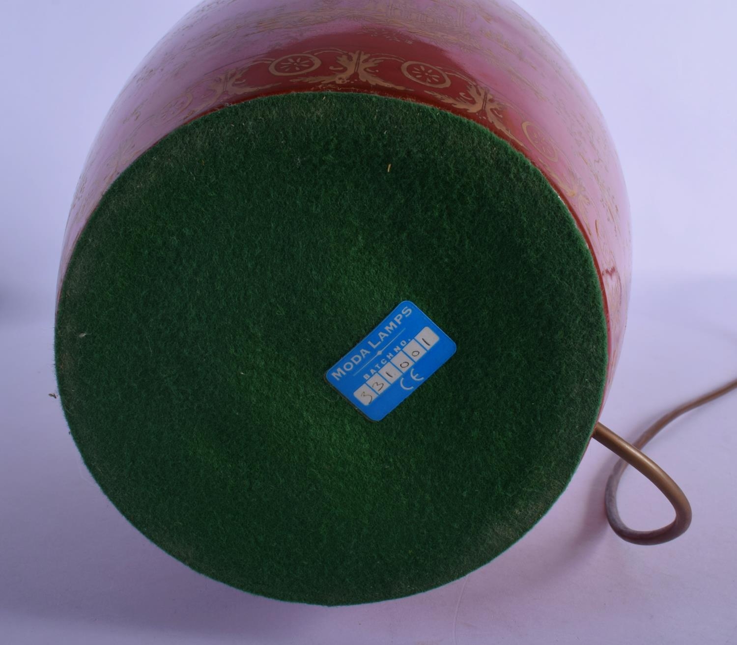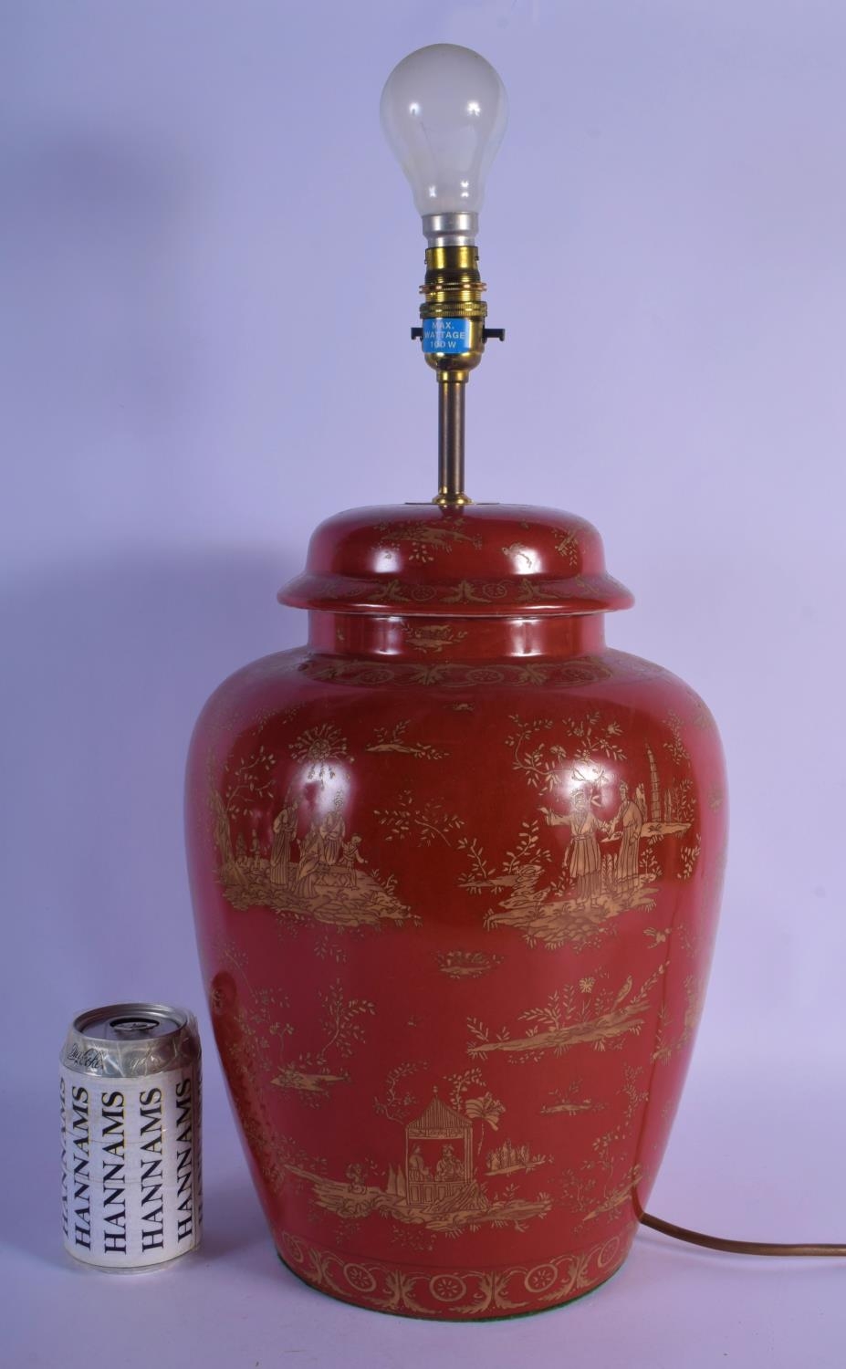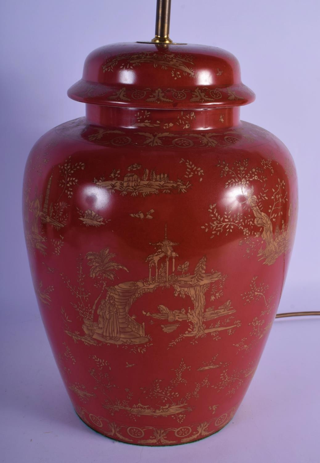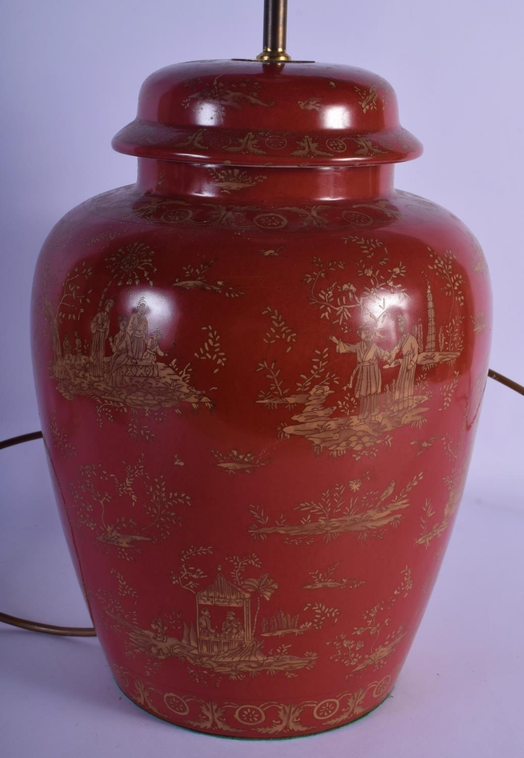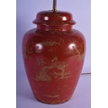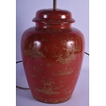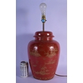 A GEORGE III STYLE COUNTRY HOUSE PORCELAIN LAMP decorated with oriental scenes. 50 cm high inc fittings.