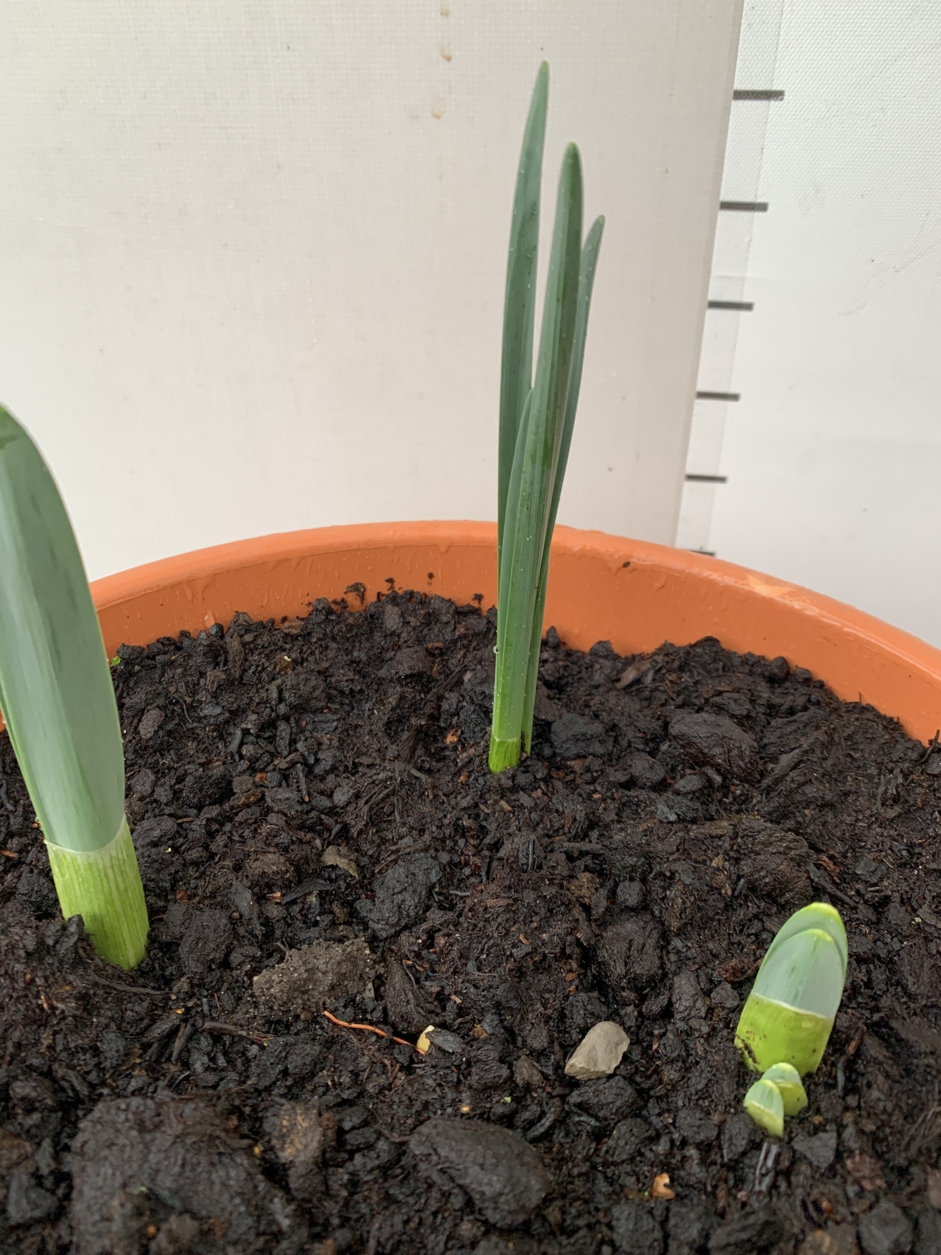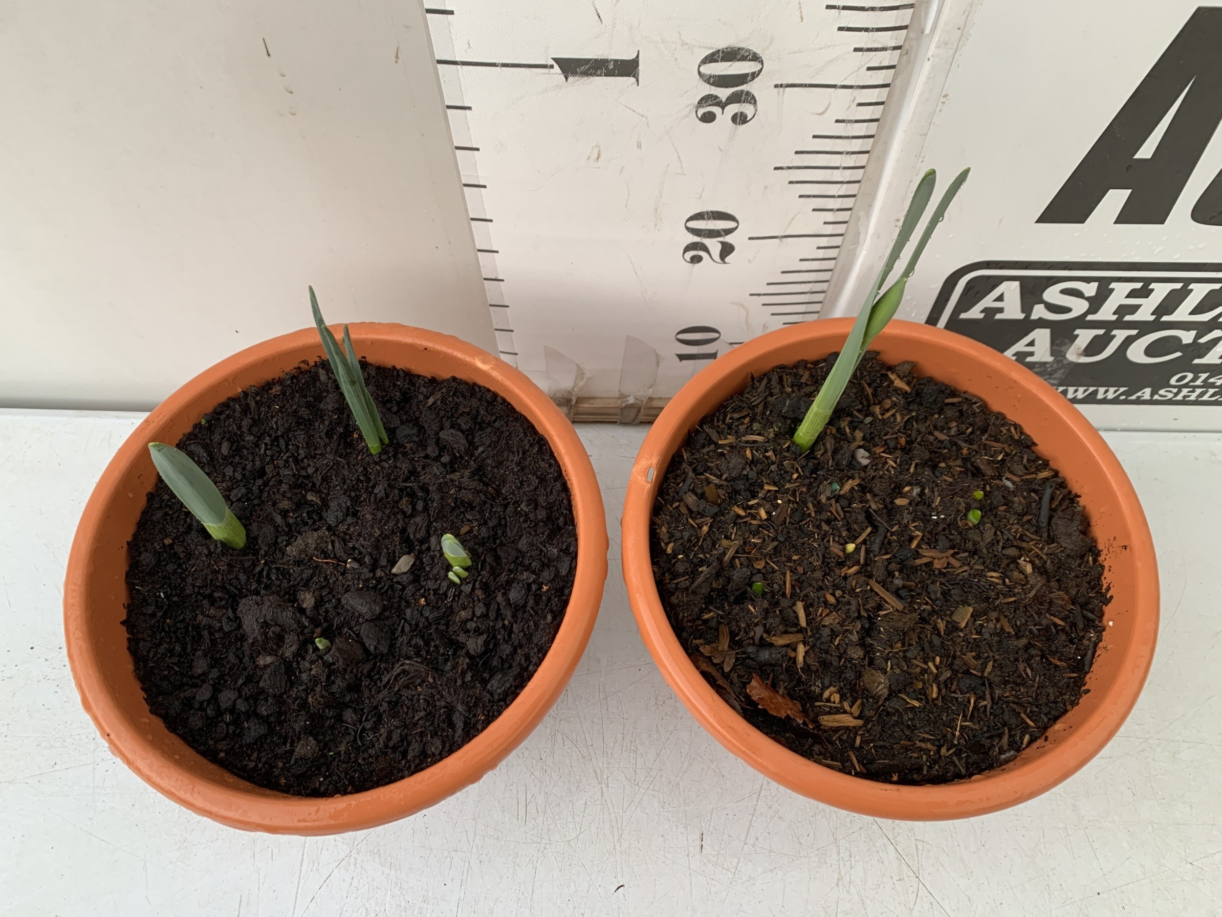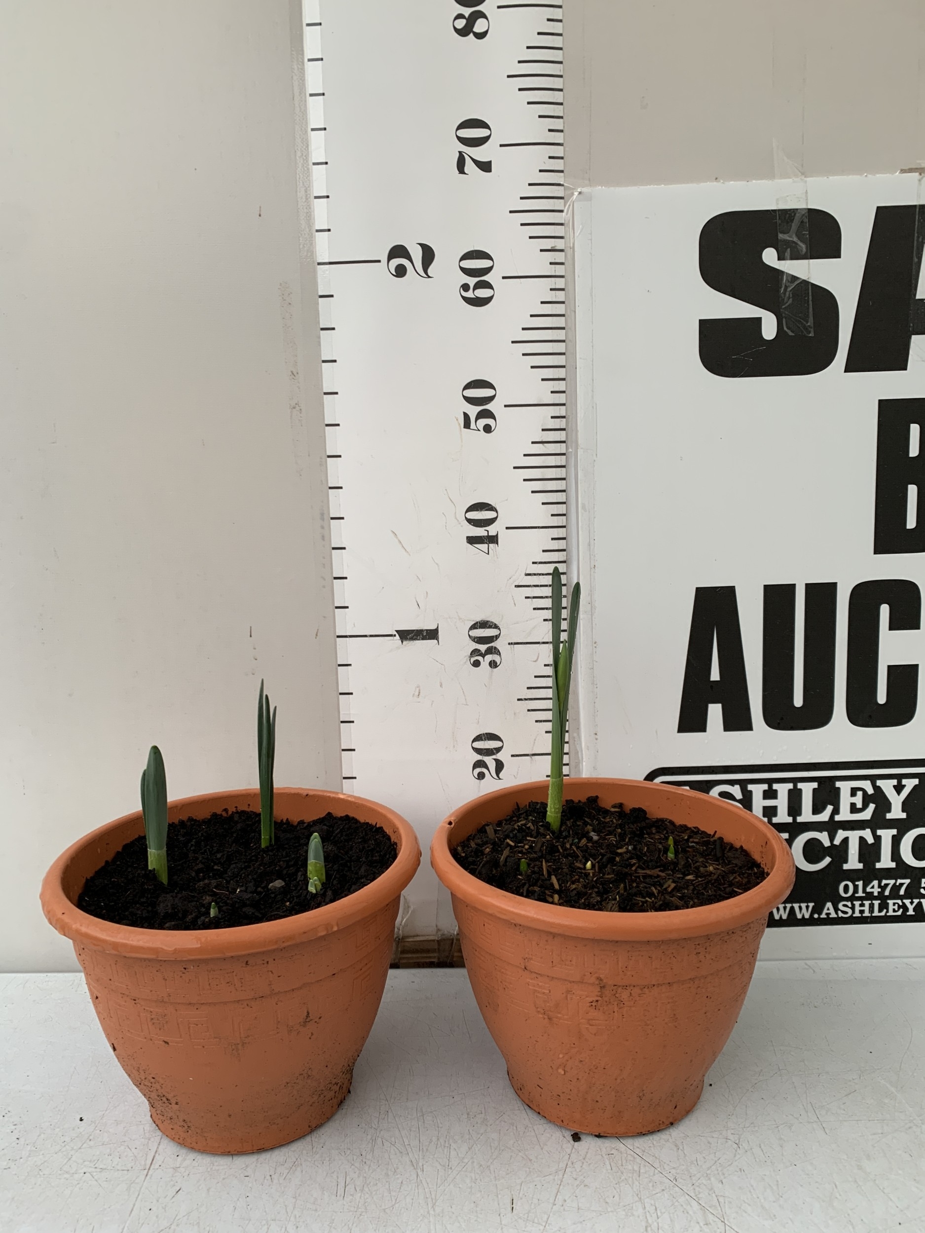 TWO PLANTERS CONTAINING MIXED SPRING BULBS TO INCLUDE DAFFODILS, TULIPS AND CROCUS ETC. PLANTERS MEASURE 25CM IN DIAMETER. TO BE SOLD FOR THE TWO