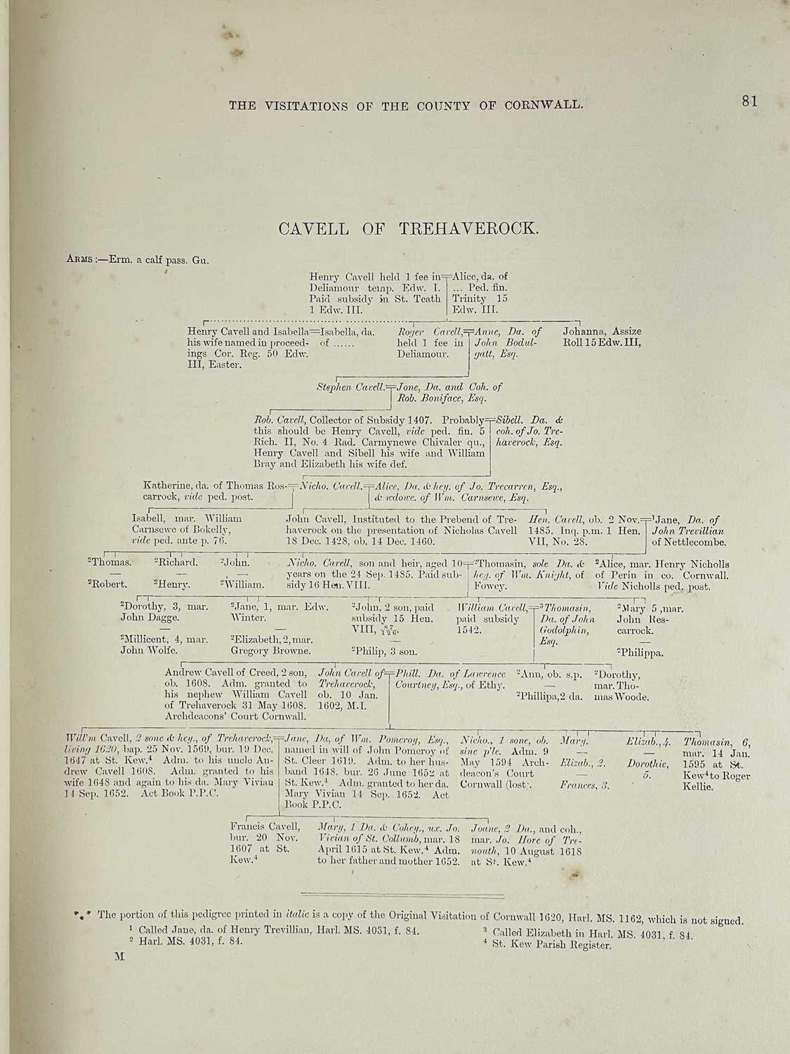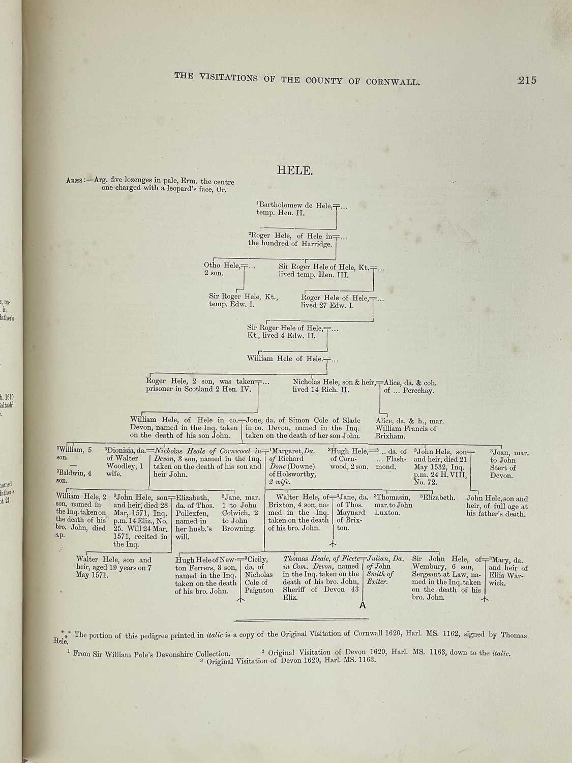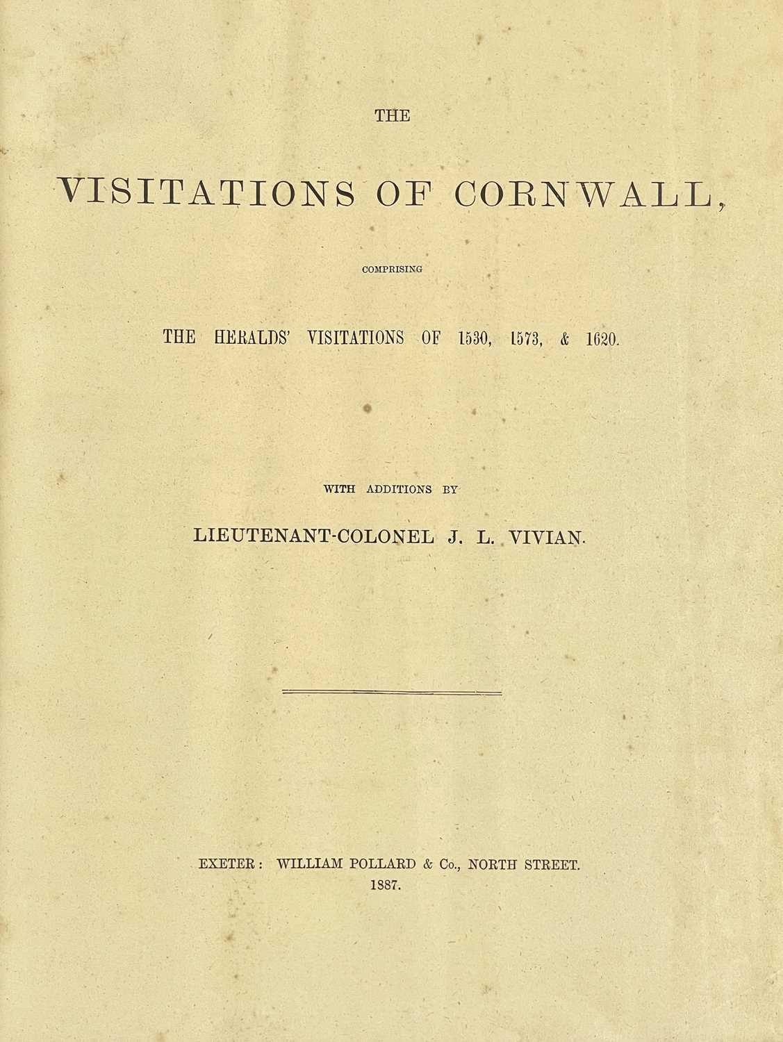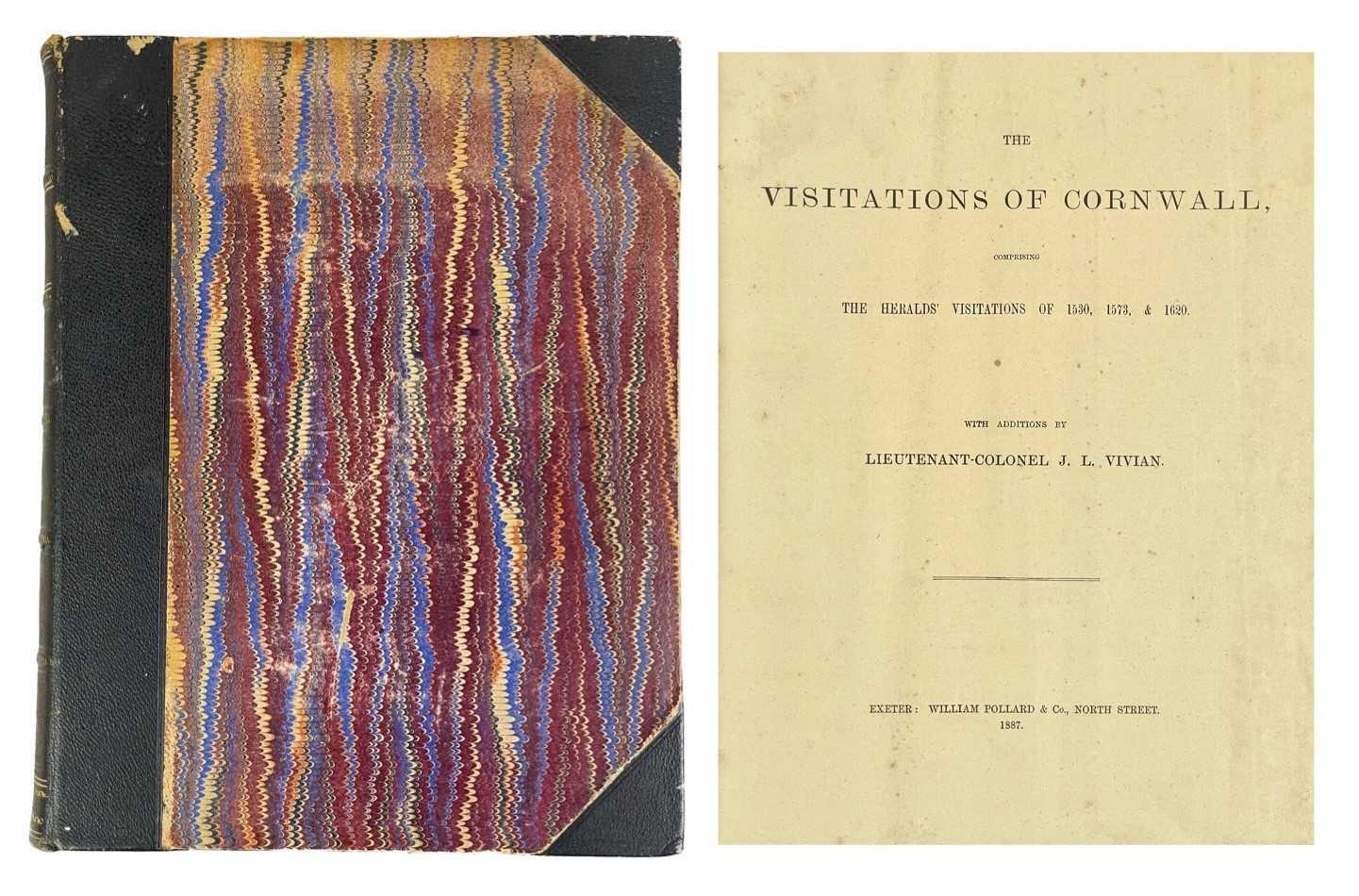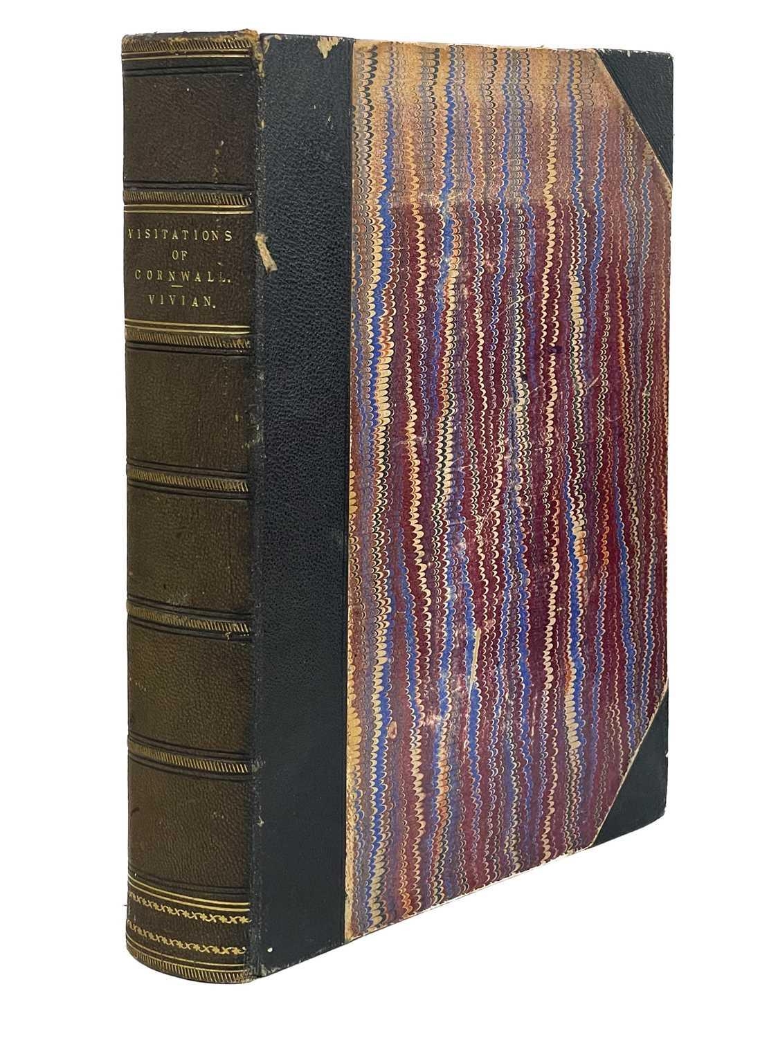 The Visitations Of Cornwall Comprising The Heralds' Visitation of 1530, 1573 & 1620 Additions by Lieutenant-Colonel J. L. Vivian; Exeter: ex-libris of Dr Robert Garven Nesbitt (1858-1923); half pebbled leather with marbled boards; gilt title to compartmentalised spine; William Pollard & Co, 1887.