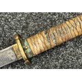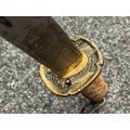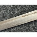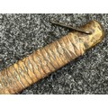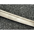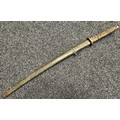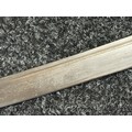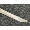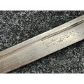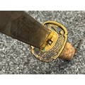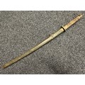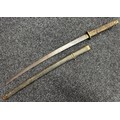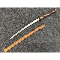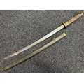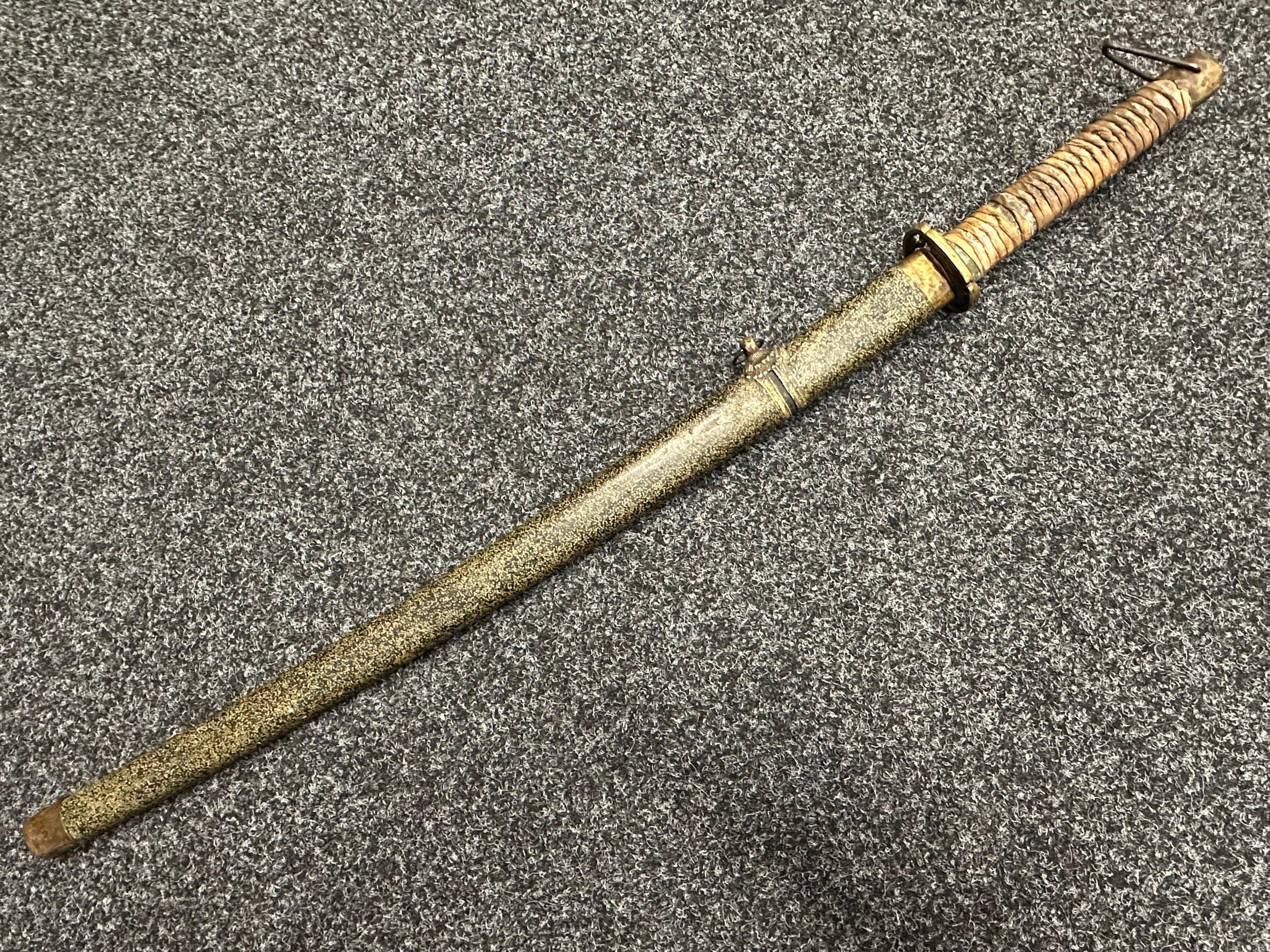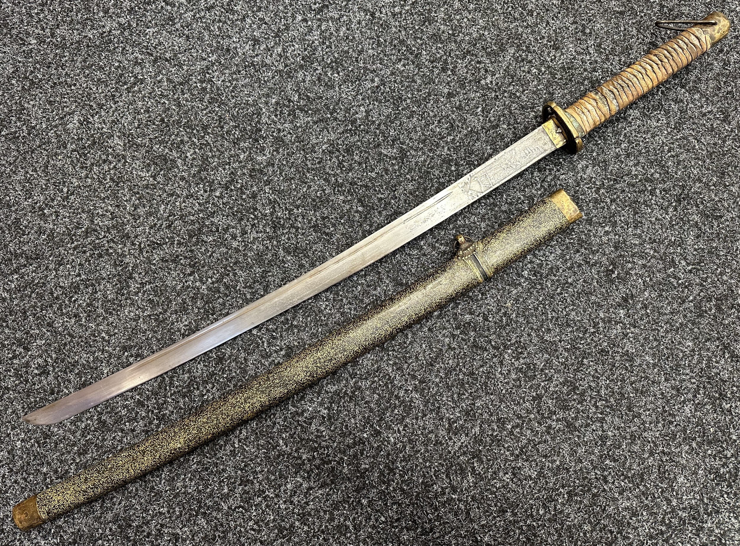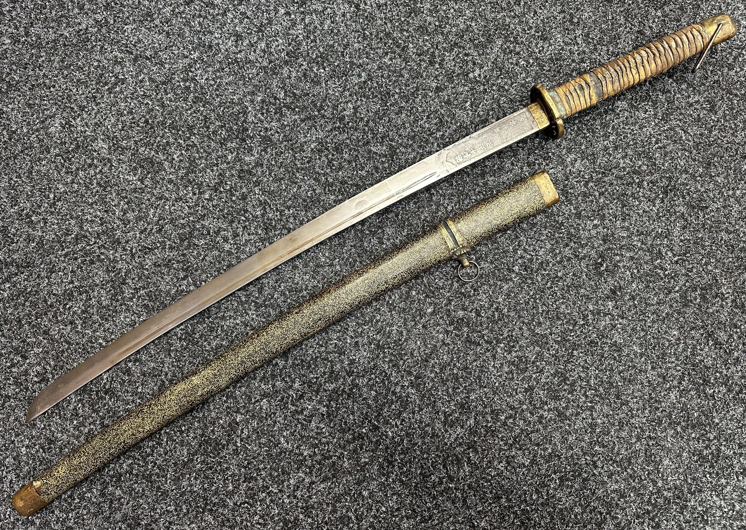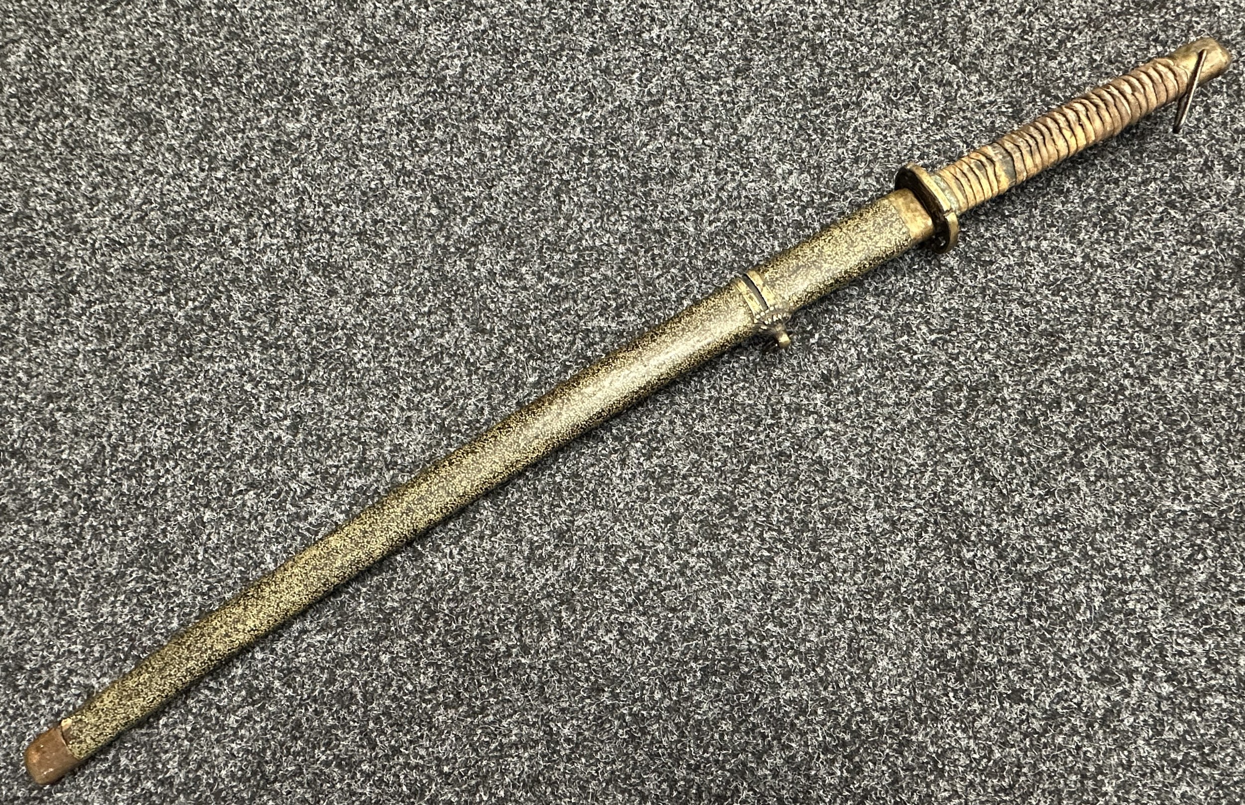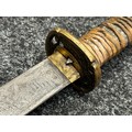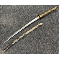 Chinese Sword with single edged fullered blade 690mm in length with etched decoration of Nationalist Chinese Flag along with Chinese letters. Cast brass guard. Rawhide leather bound wooden grip. Overall length 925mm. Complete with wooden scabbard with fish skin covering and brass fittings.